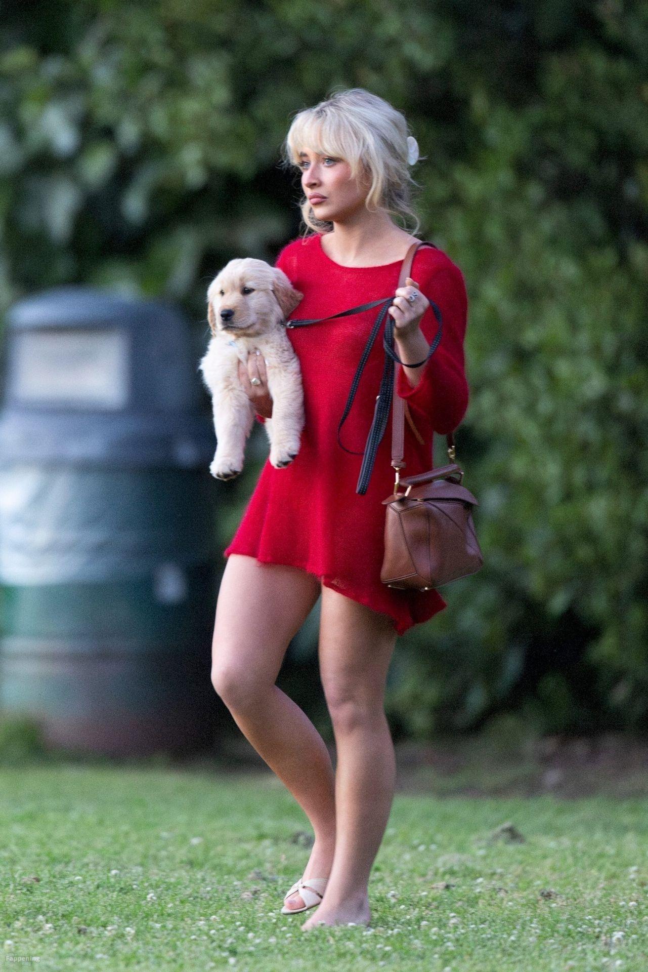 Sabrina Carpenter è stata fotografata con un mini abito rosso trasparente, mostrando il reggiseno e sfoggiando gambe mozzafiato al parco delle Hollywood Hills.