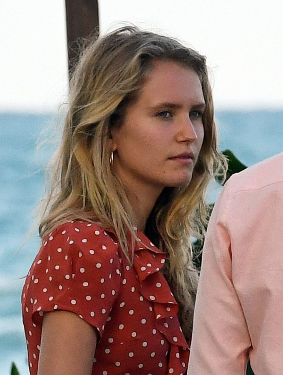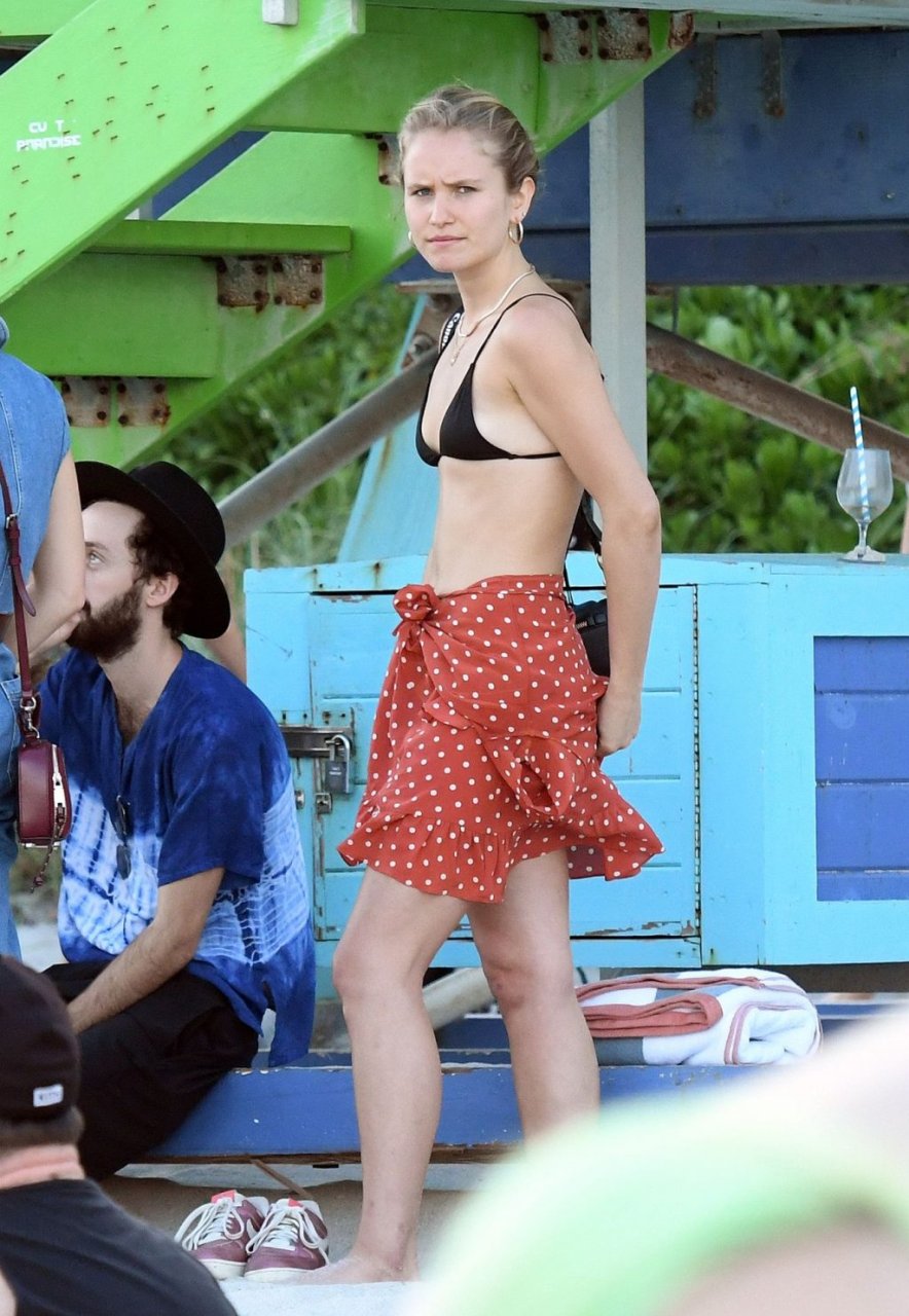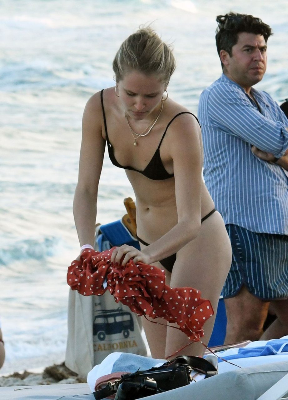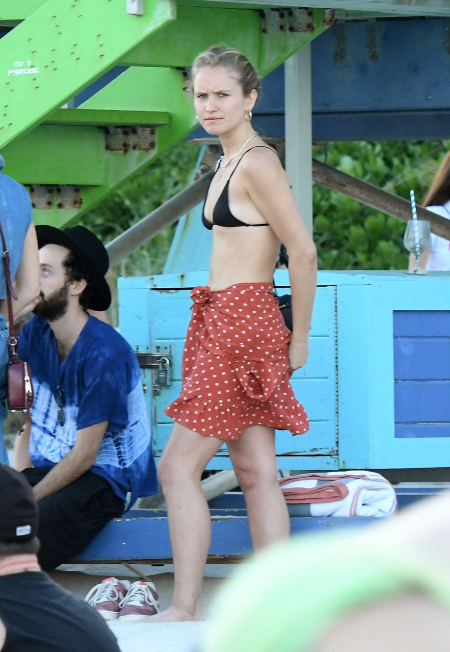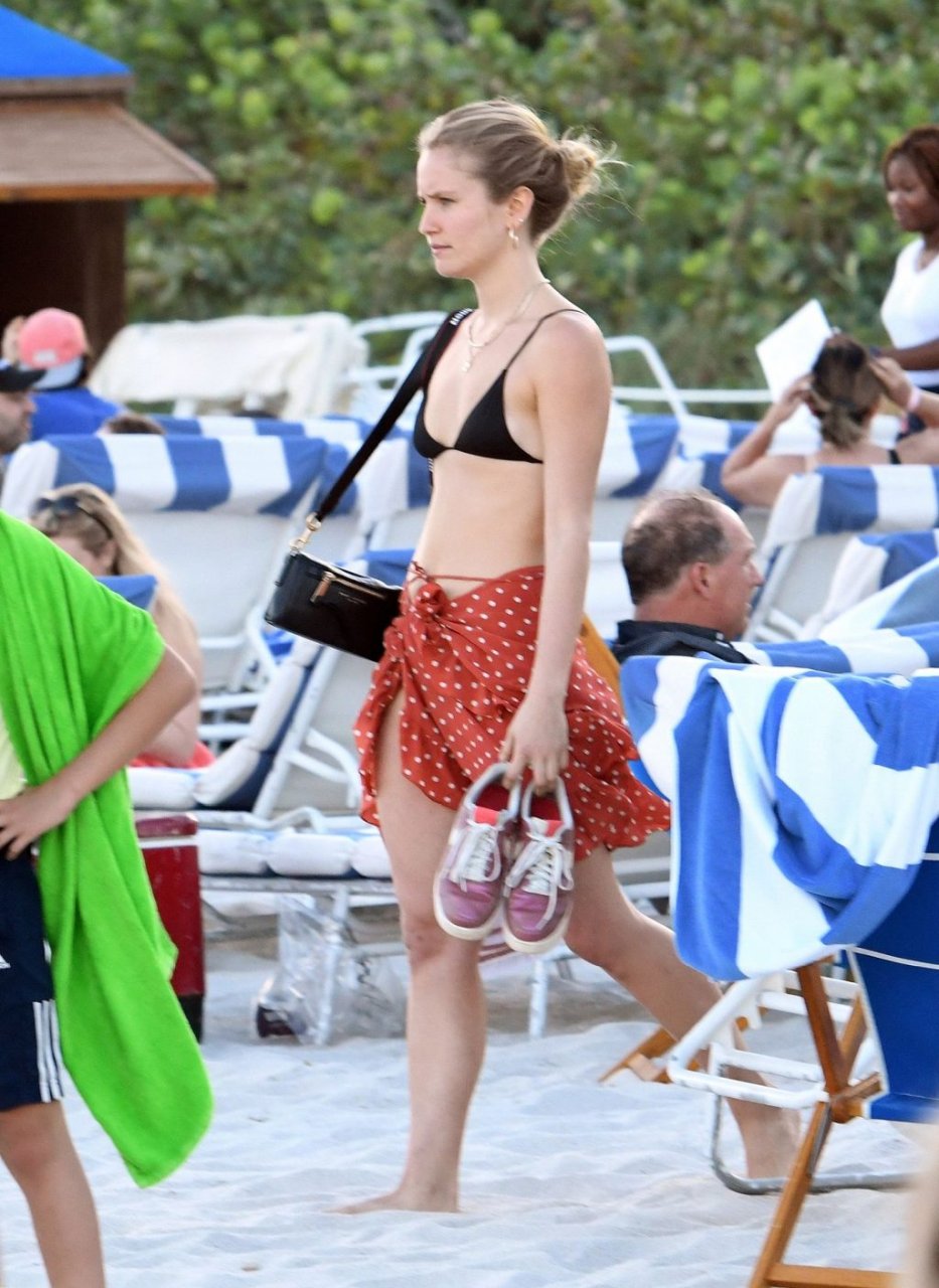 La modella senza titolo Sailor Brinkley Cook indossa un piccolo bikini nero mentre fa un tuffo al tramonto sulla spiaggia di Miami, 12/07/2018.