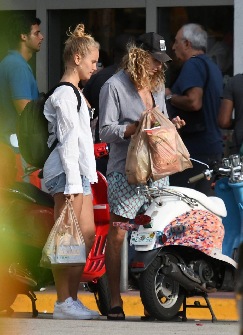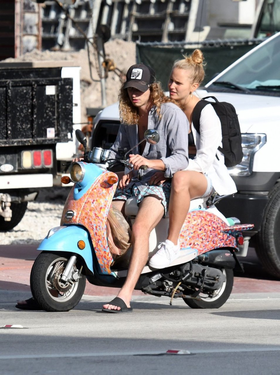 La modella Sailor Brinkley Cook indossa un top bikini nero mentre guida uno scooter con il fidanzato Ben Sosne per Miami Beach, 29/04/2019.