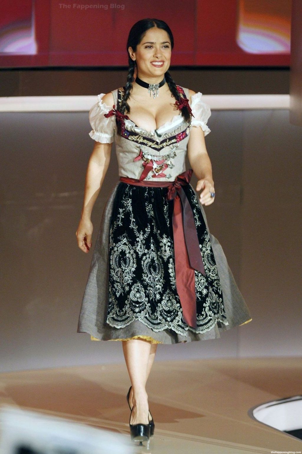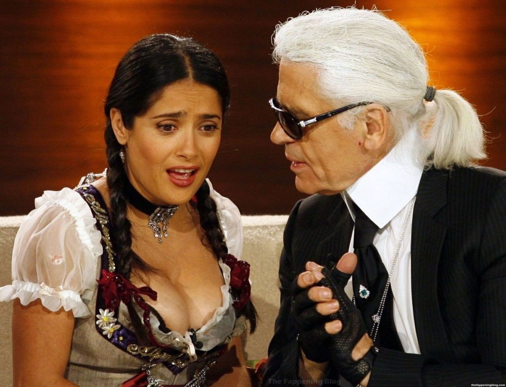If you thought that was all you were going to see of Salma Hayek’s tits, you were wrong! Our charming busty Mexican beauty made an appearance on the show called “Bet that..?”. This was filmed in Nuremberg, Germany, way back in 2008. You can even see that next to her was, now late, Karl Lagerfeld.