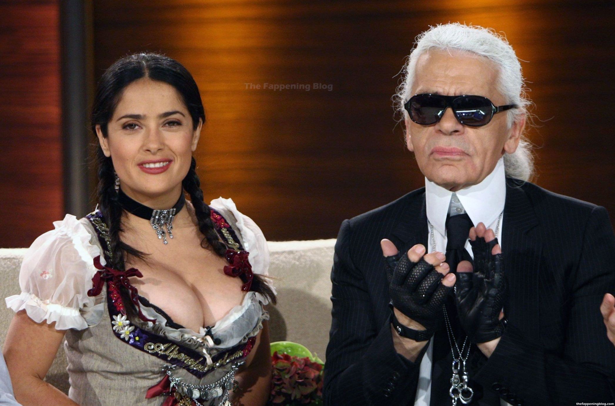 If you thought that was all you were going to see of Salma Hayek’s tits, you were wrong! Our charming busty Mexican beauty made an appearance on the show called “Bet that..?”. This was filmed in Nuremberg, Germany, way back in 2008. You can even see that next to her was, now late, Karl Lagerfeld.