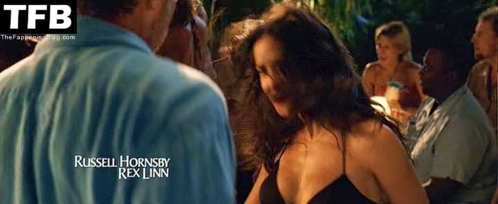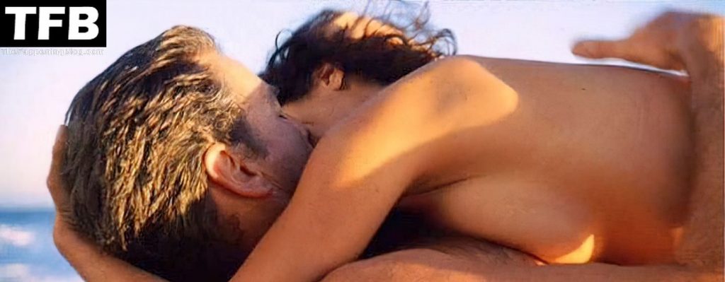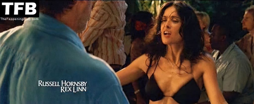 Salma Hayek è sdraiata nuda sopra un uomo sulla spiaggia, il suo seno sinistro premuto contro il suo petto mentre si baciano. Poi vediamo Salma ballare con un top bikini nero, i suoi seni che si muovono mentre li scuote.