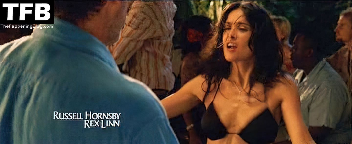 Salma Hayek è sdraiata nuda sopra un uomo sulla spiaggia, il suo seno sinistro premuto contro il suo petto mentre si baciano. Poi vediamo Salma ballare con un top bikini nero, i suoi seni che si muovono mentre li scuote.