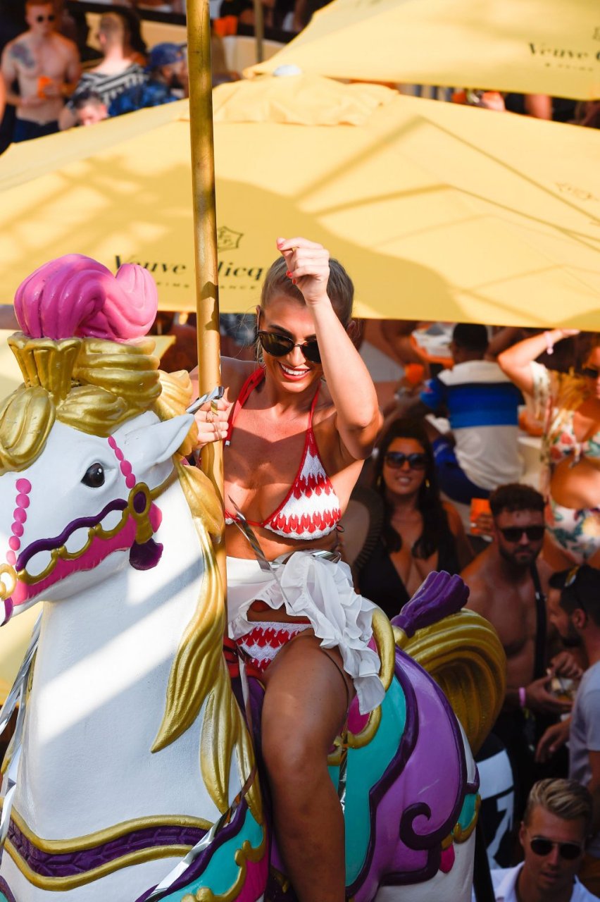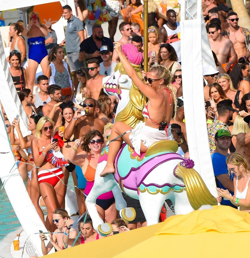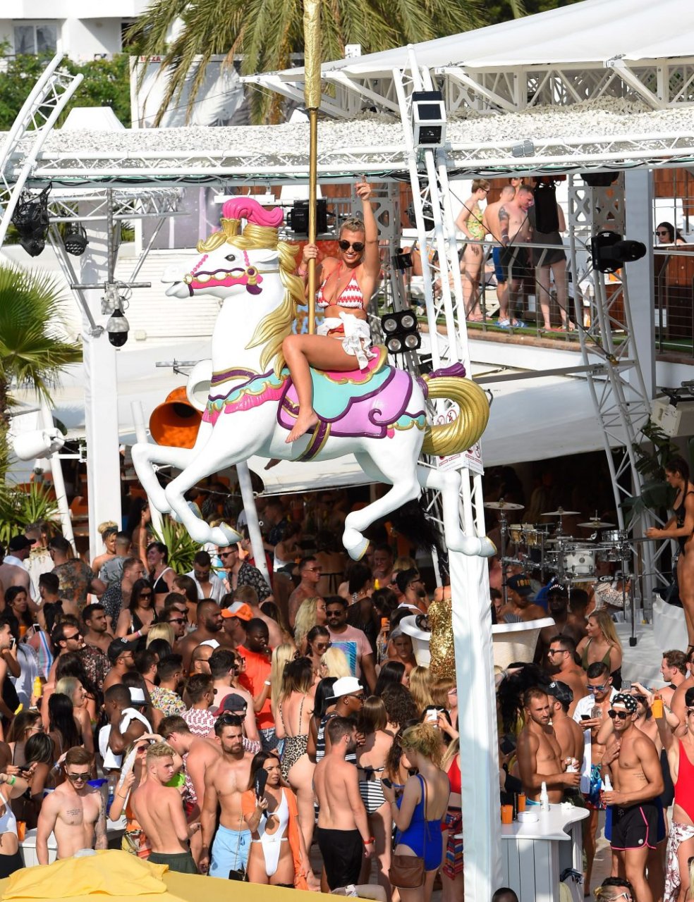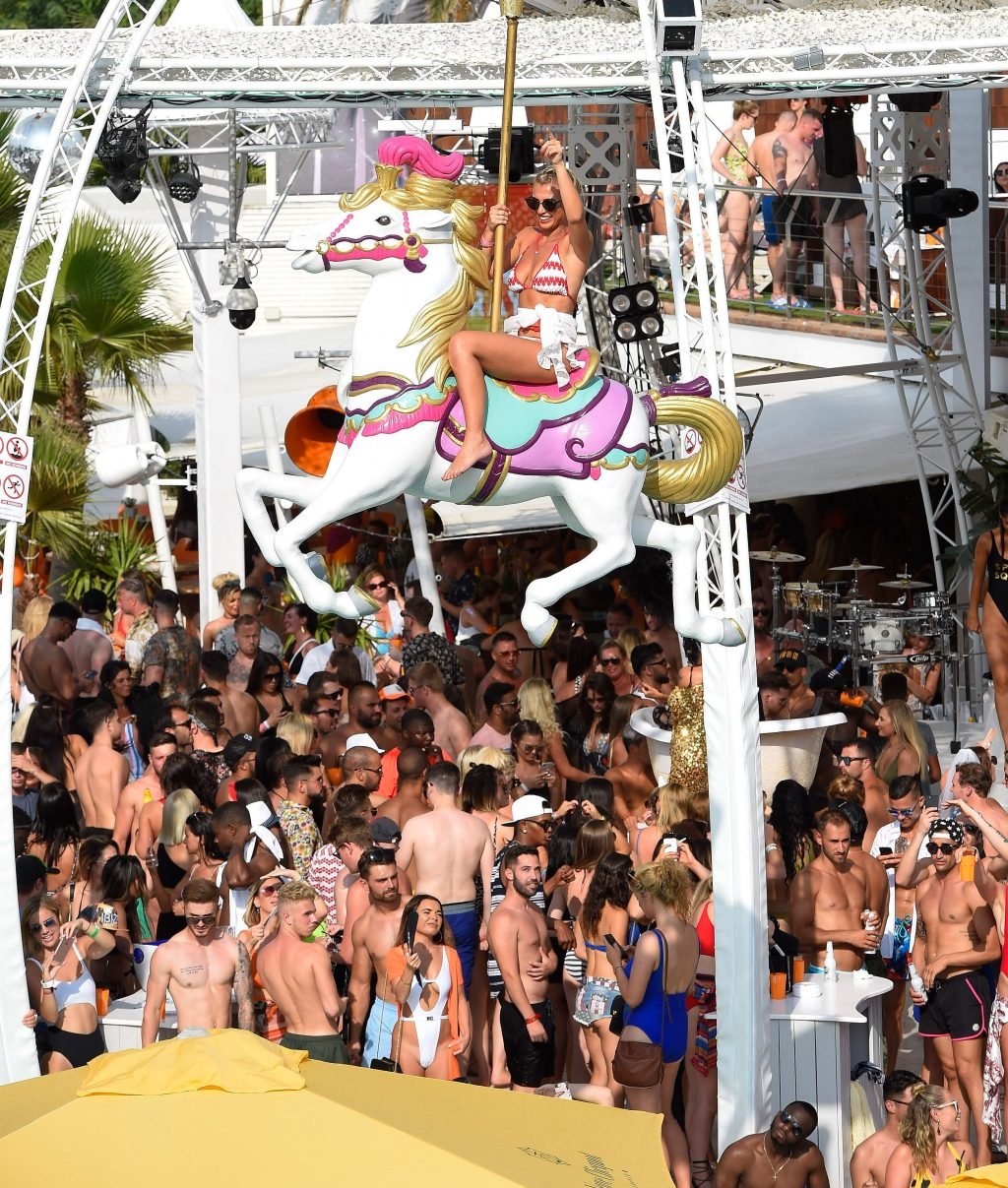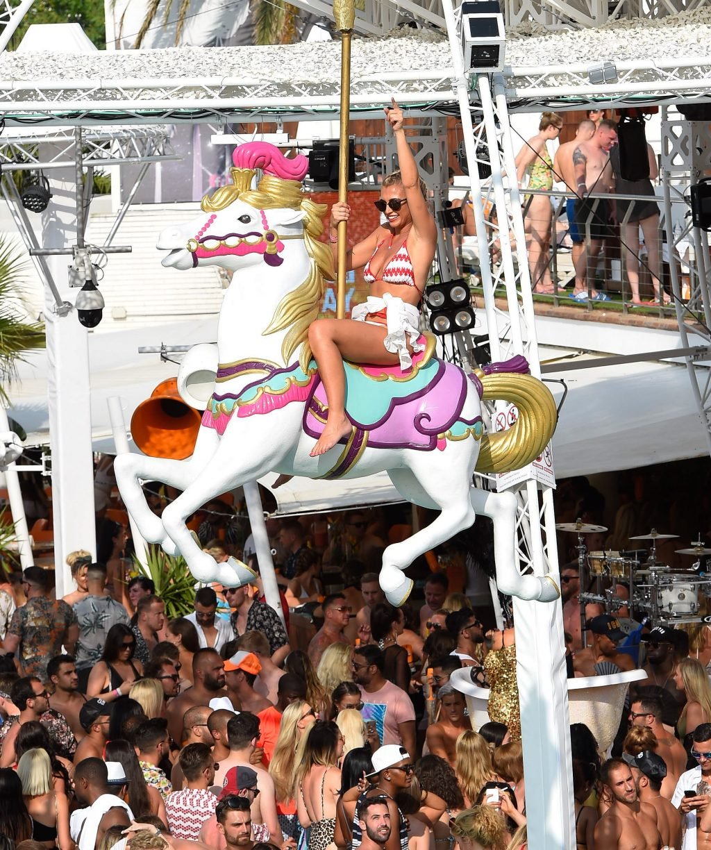 Billie Faiers stupisce la folla dell’Ocean Beach a Ibiza venendo calata sulla pista da ballo tramite una gru con un cavallo bianco. Era accompagnata dalle sue sorelle e colleghe star di TOWIE, Sam e Ferne McCann, 26/08/2018.