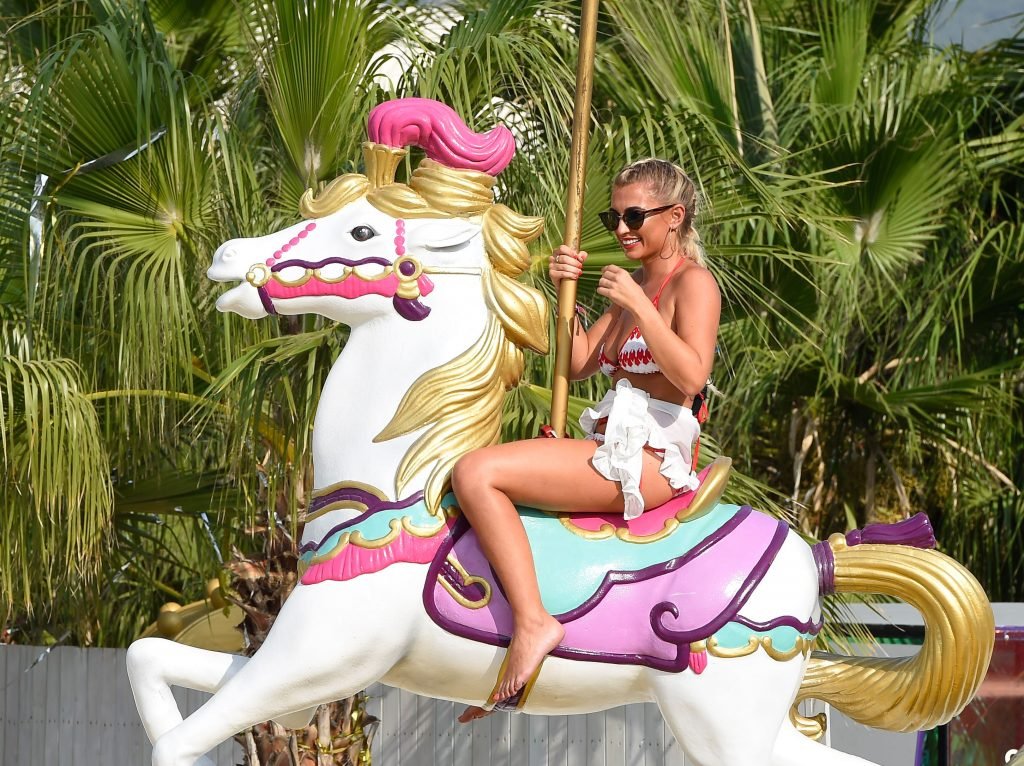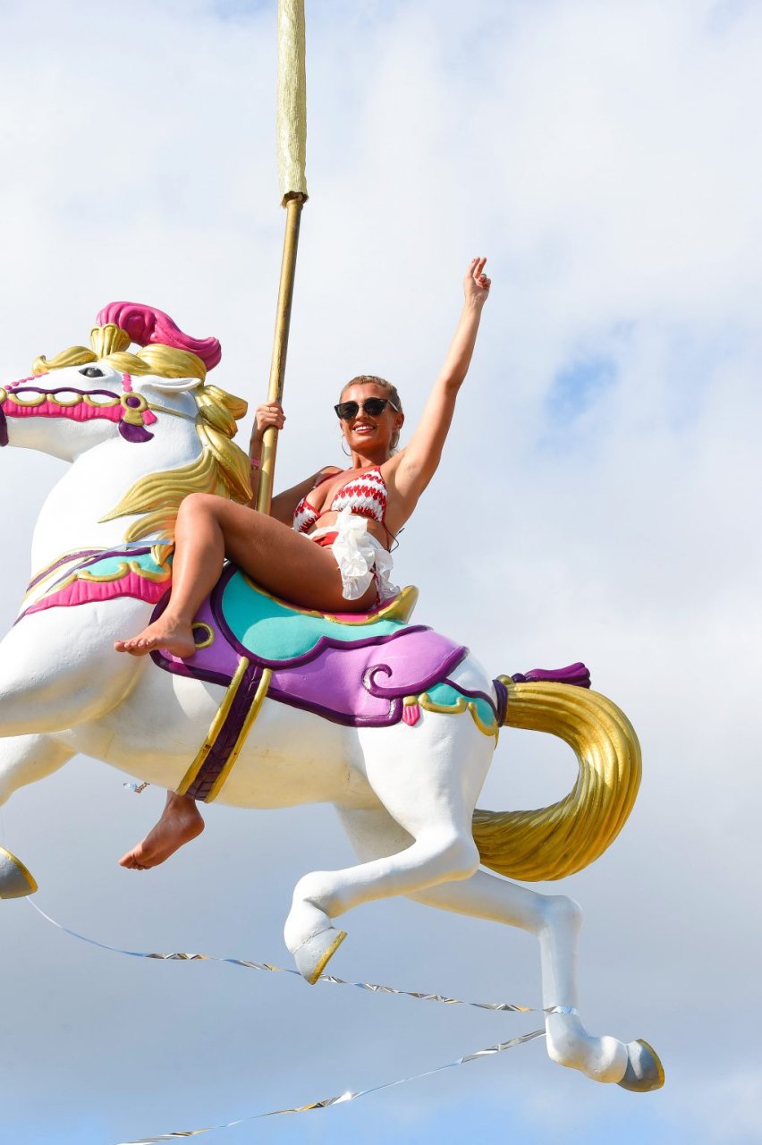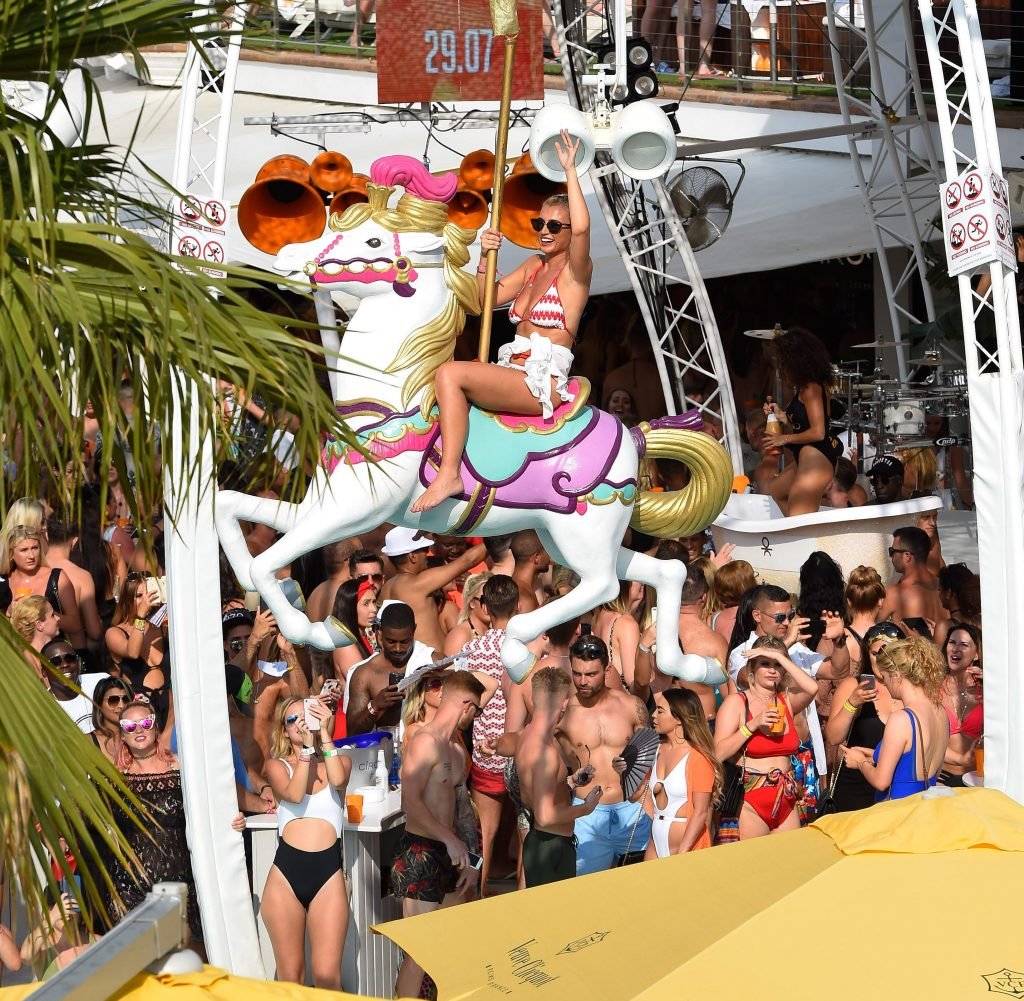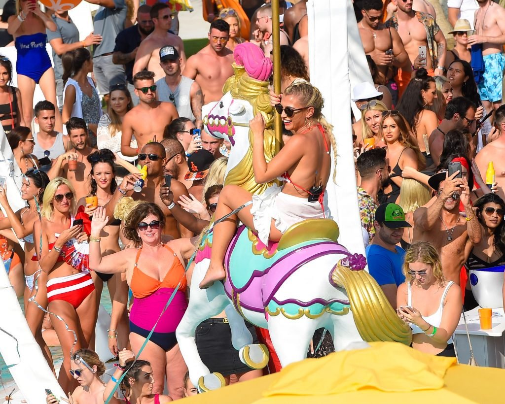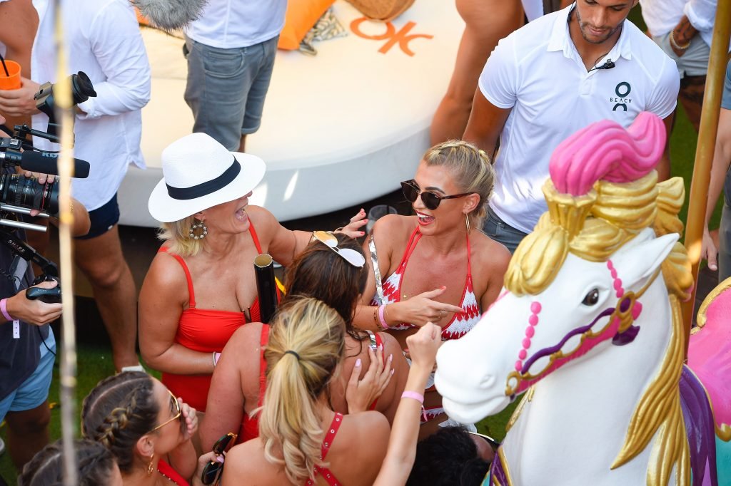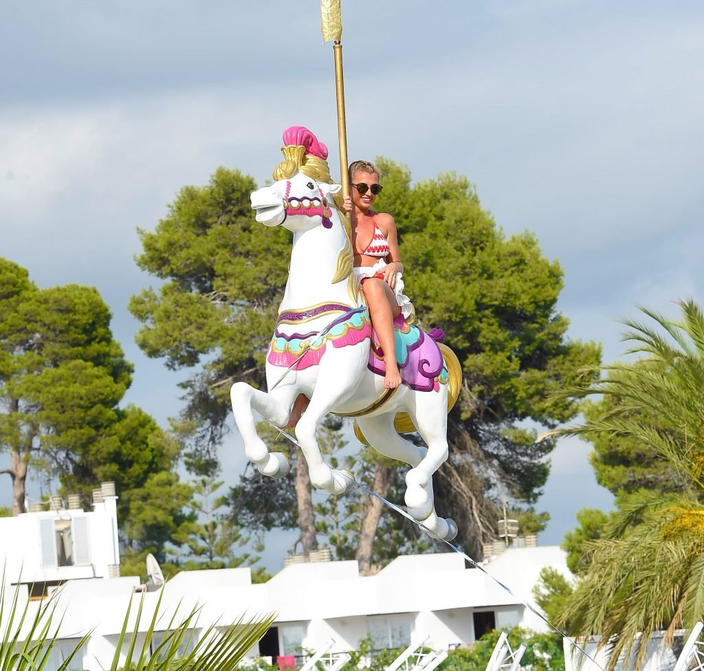 Billie Faiers stupisce la folla dell’Ocean Beach a Ibiza venendo calata sulla pista da ballo tramite una gru con un cavallo bianco. Era accompagnata dalle sue sorelle e colleghe star di TOWIE, Sam e Ferne McCann, 26/08/2018.