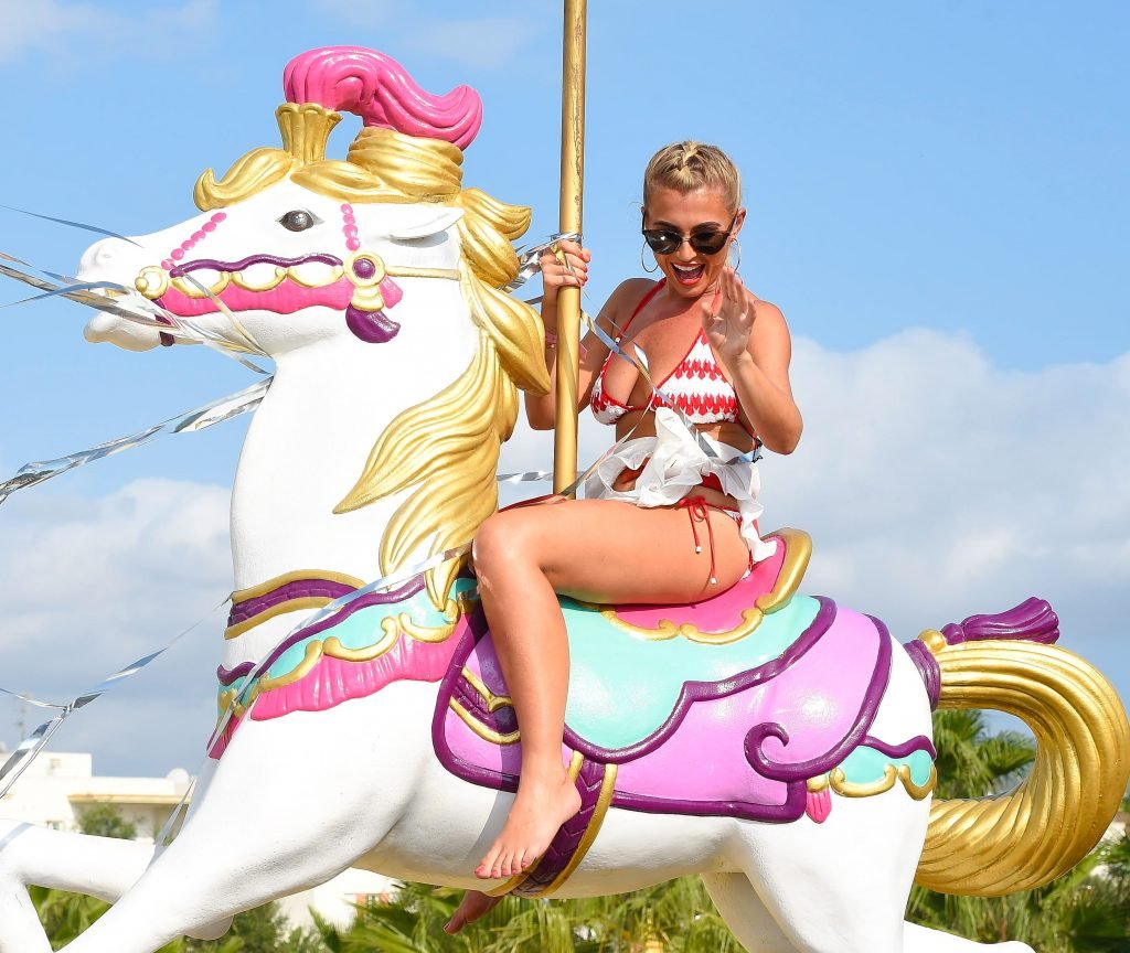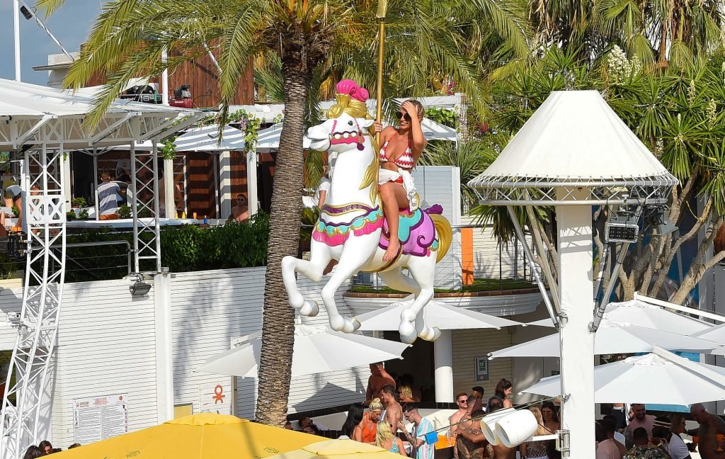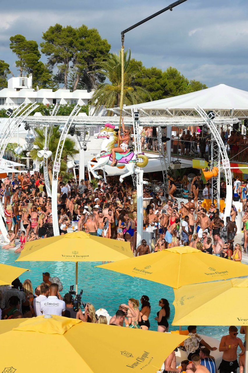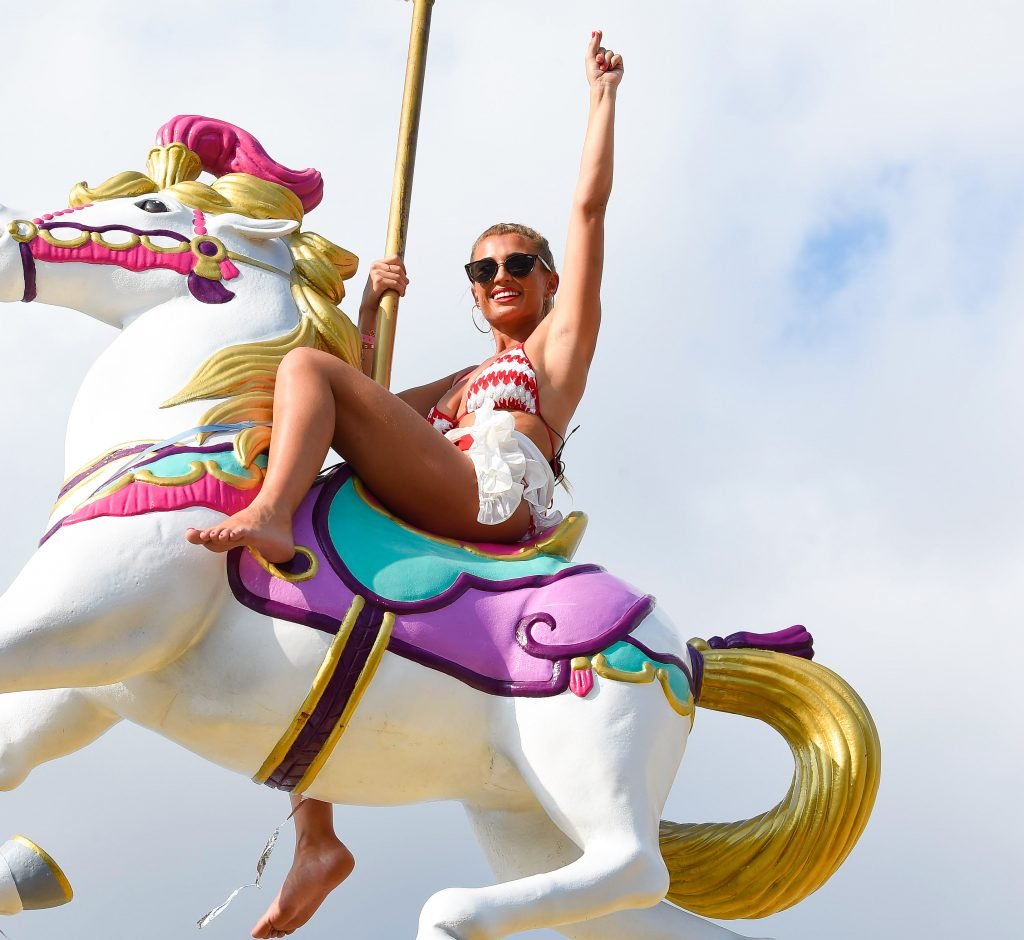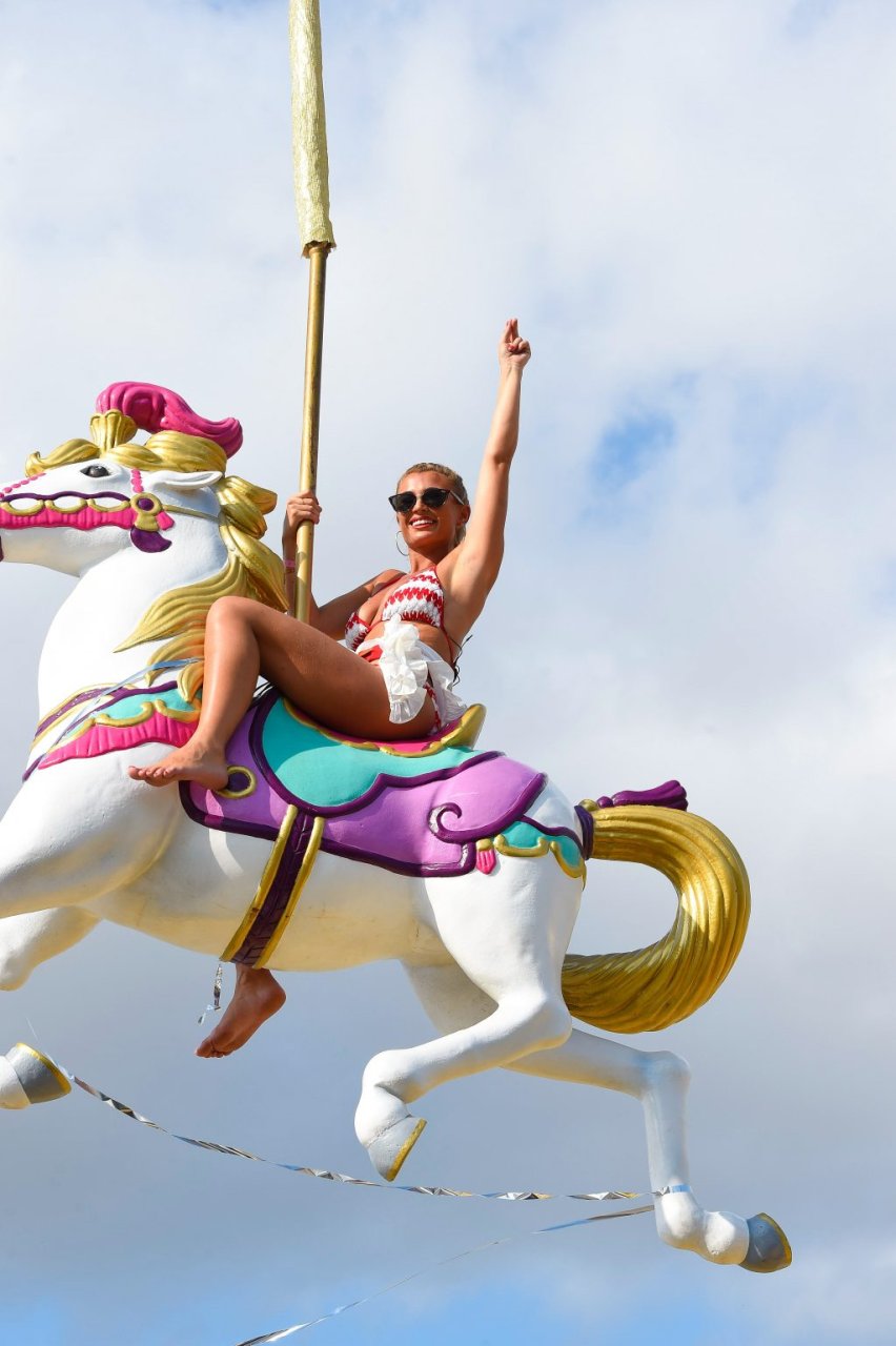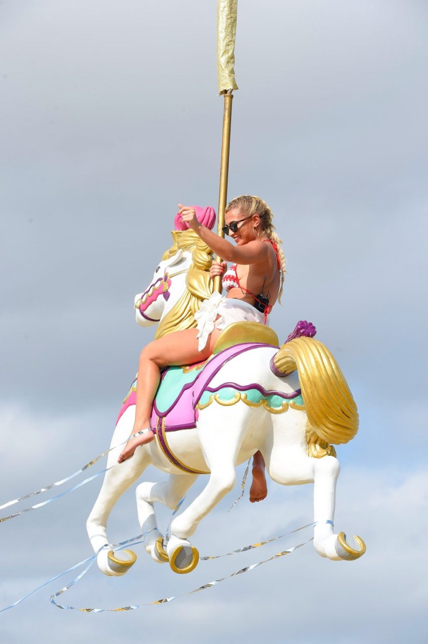 Billie Faiers stupisce la folla dell’Ocean Beach a Ibiza venendo calata sulla pista da ballo tramite una gru con un cavallo bianco. Era accompagnata dalle sue sorelle e colleghe star di TOWIE, Sam e Ferne McCann, 26/08/2018.