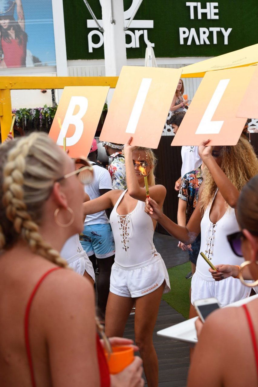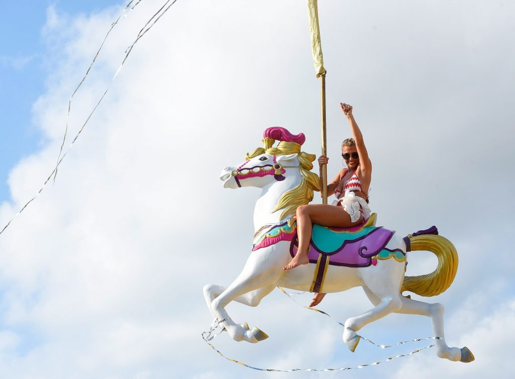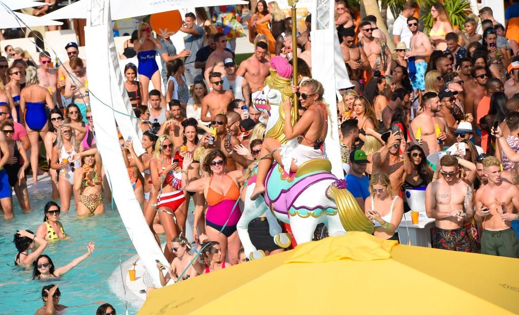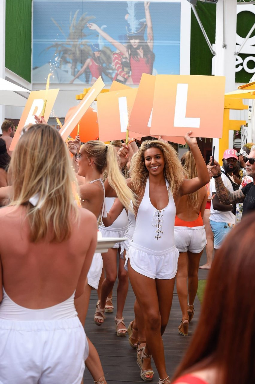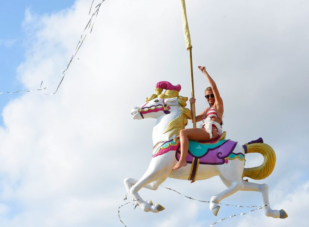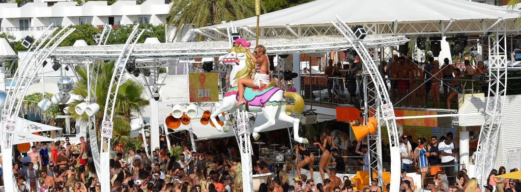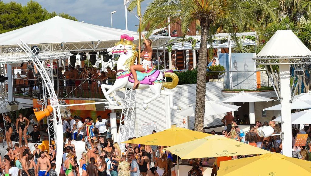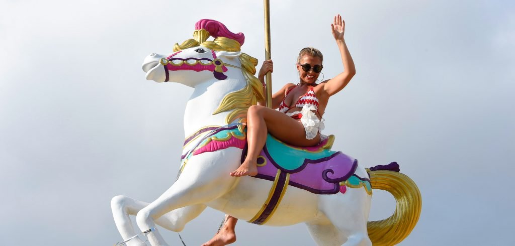 Billie Faiers stupisce la folla dell’Ocean Beach a Ibiza venendo calata sulla pista da ballo tramite una gru con un cavallo bianco. Era accompagnata dalle sue sorelle e colleghe star di TOWIE, Sam e Ferne McCann, 26/08/2018.