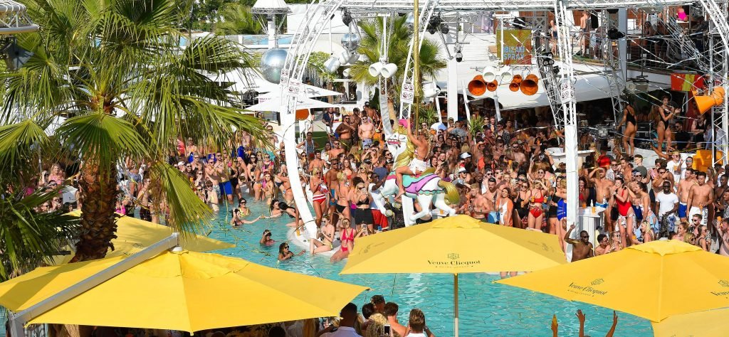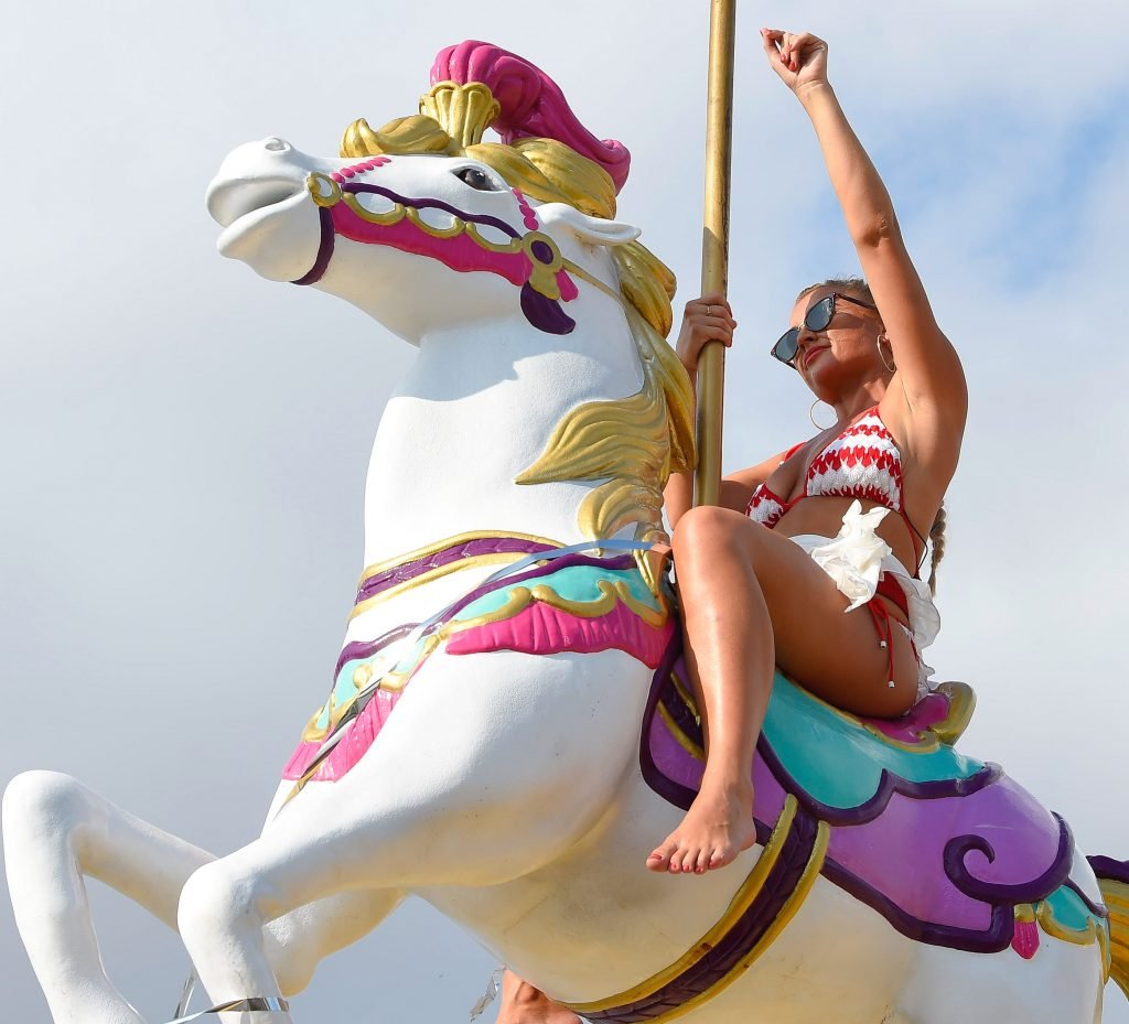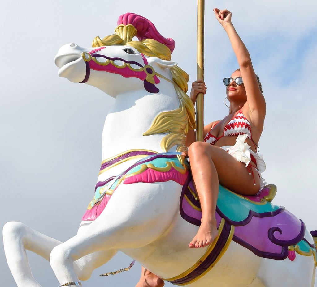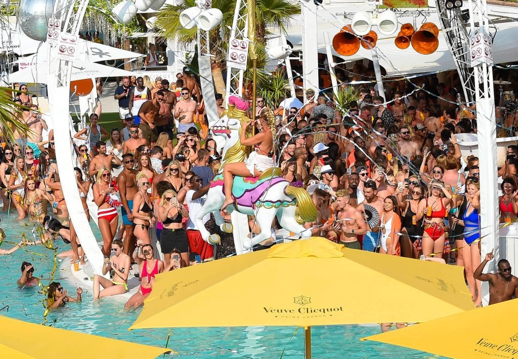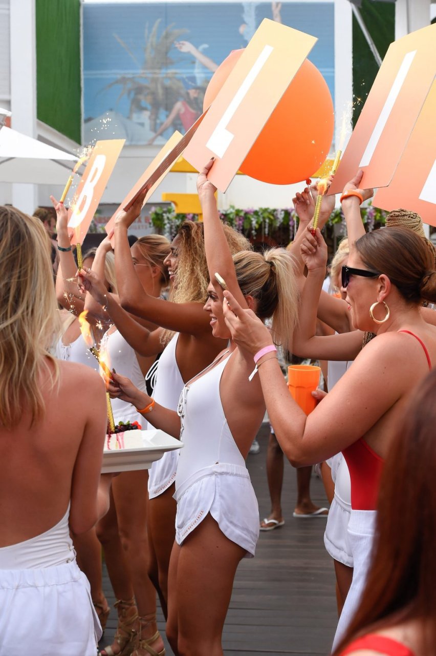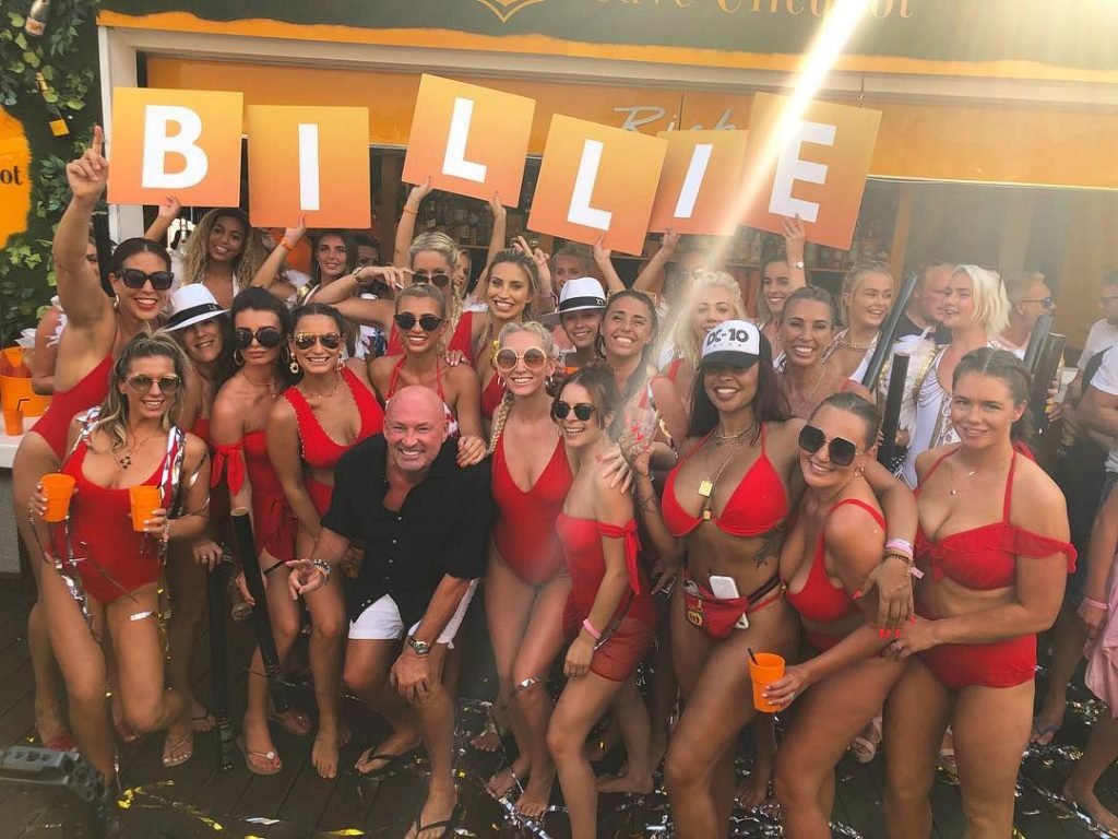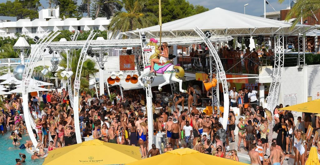 Billie Faiers stupisce la folla dell’Ocean Beach a Ibiza venendo calata sulla pista da ballo tramite una gru con un cavallo bianco. Era accompagnata dalle sue sorelle e colleghe star di TOWIE, Sam e Ferne McCann, 26/08/2018.