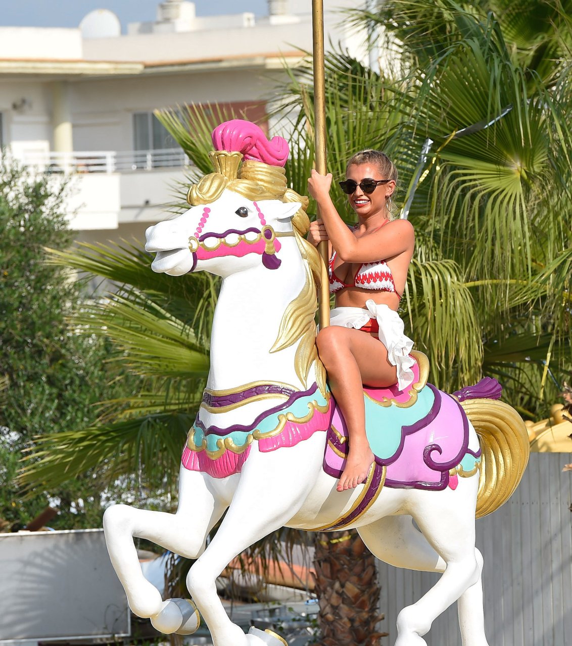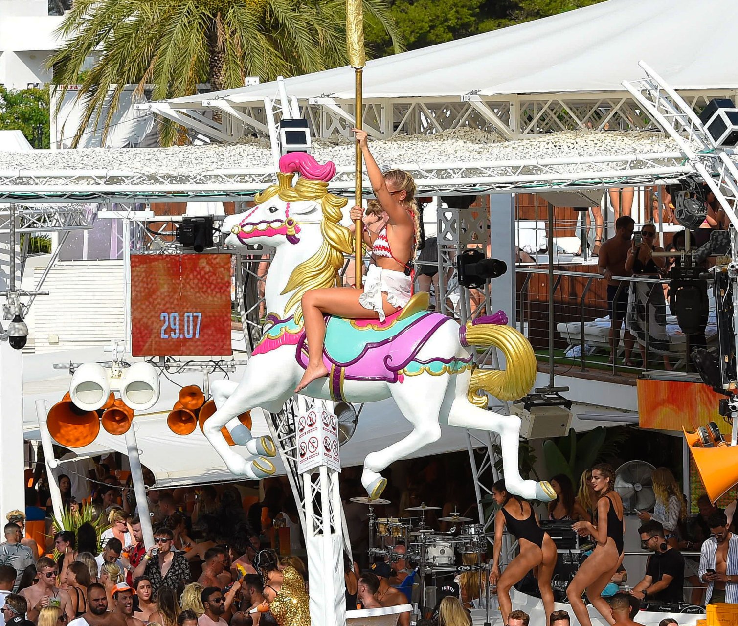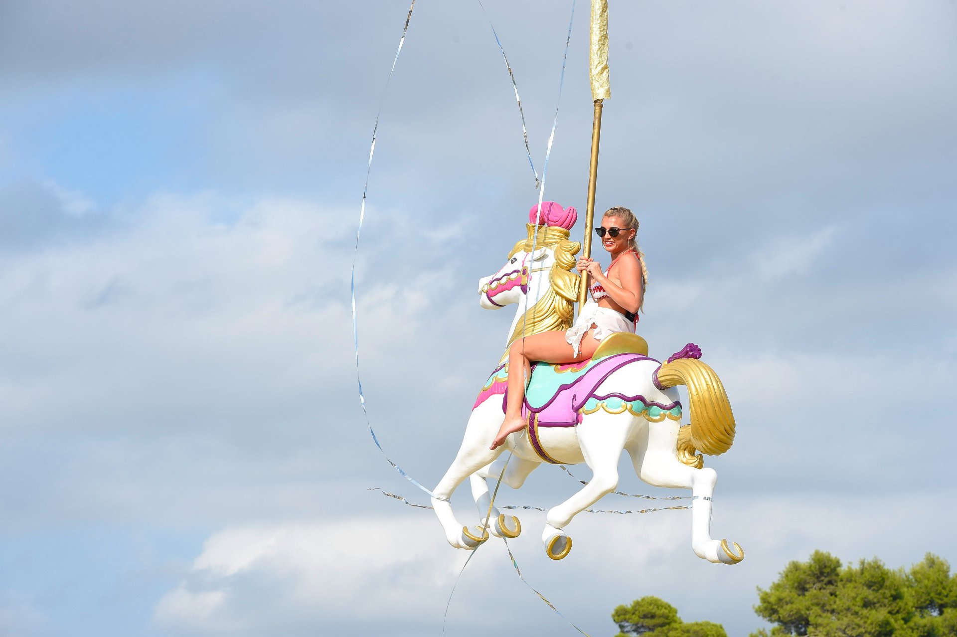 Billie Faiers stupisce la folla dell’Ocean Beach a Ibiza venendo calata sulla pista da ballo tramite una gru con un cavallo bianco. Era accompagnata dalle sue sorelle e colleghe star di TOWIE, Sam e Ferne McCann, 26/08/2018.
