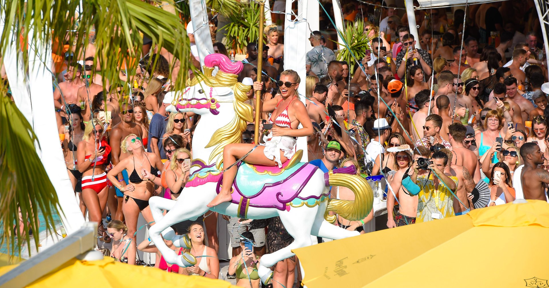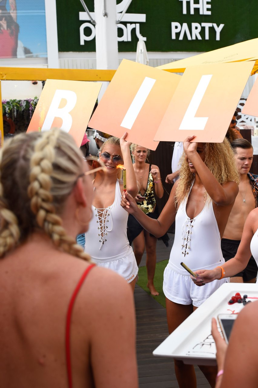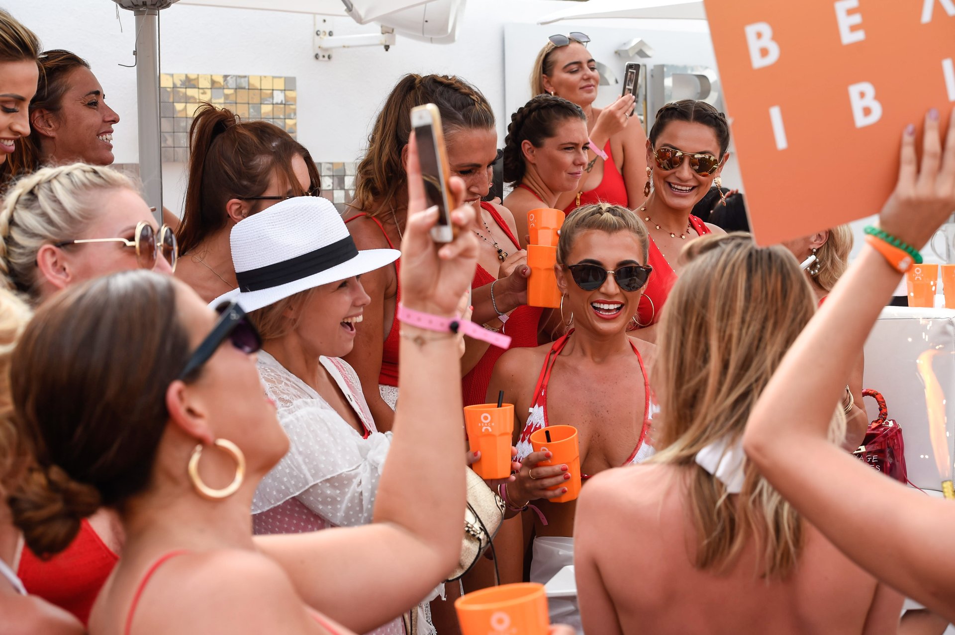 Billie Faiers stupisce la folla dell’Ocean Beach a Ibiza venendo calata sulla pista da ballo tramite una gru con un cavallo bianco. Era accompagnata dalle sue sorelle e colleghe star di TOWIE, Sam e Ferne McCann, 26/08/2018.