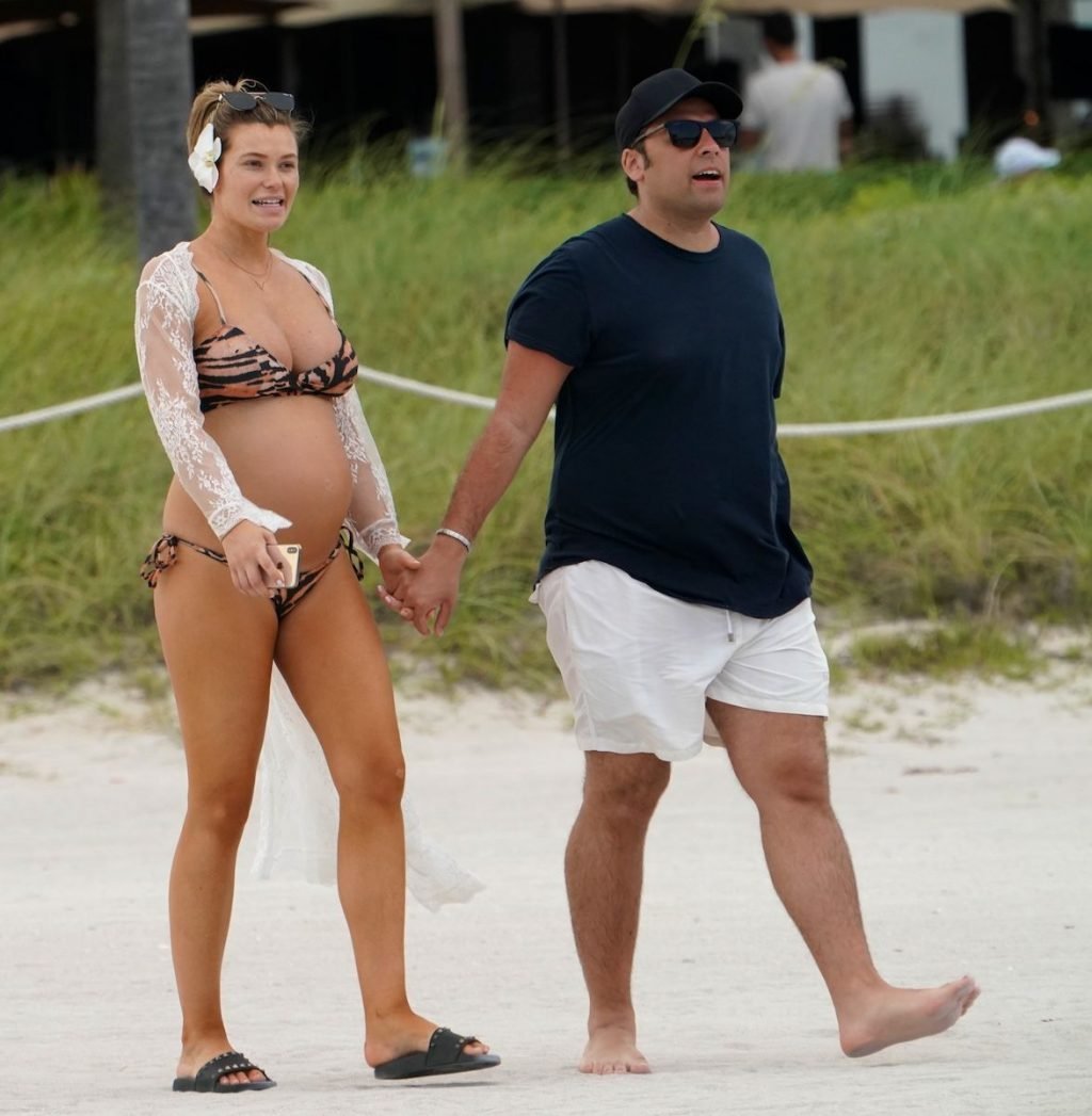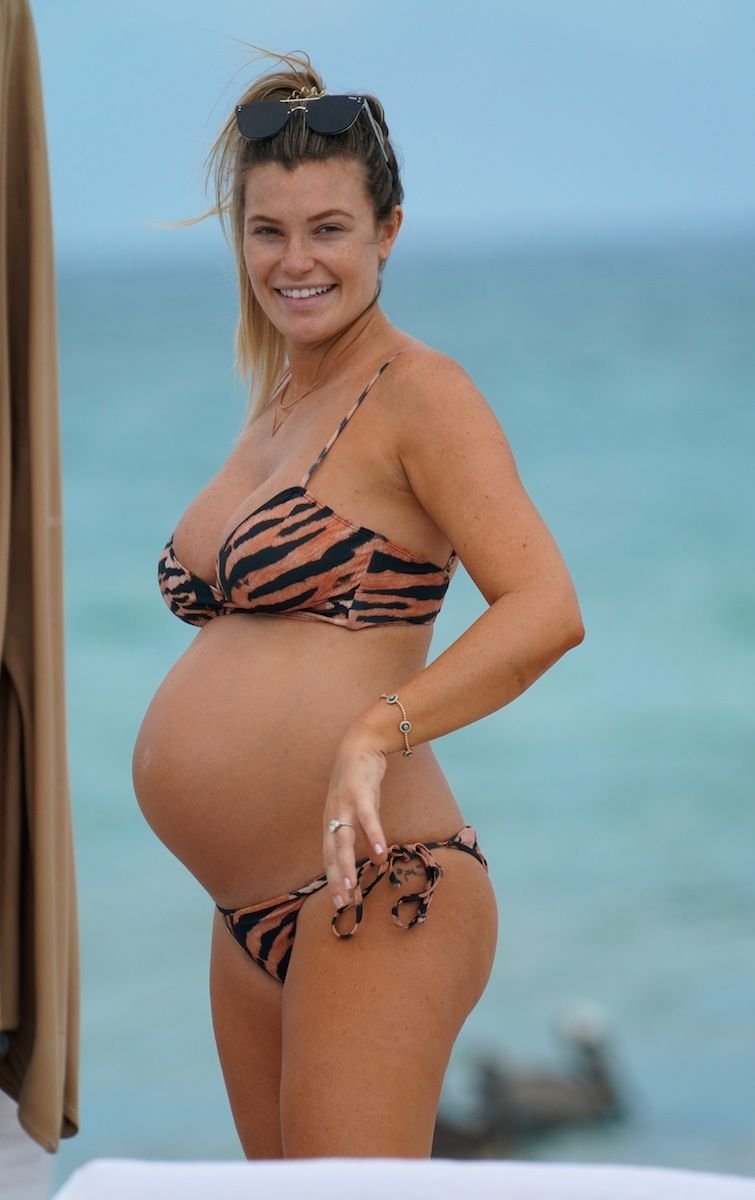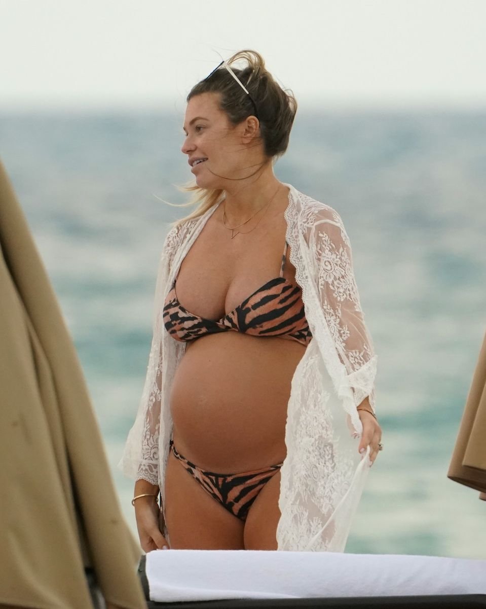 La modella di SI Swimsuit Samantha Hoopes mostra il suo enorme pancione in un bikini con stampa tigre, 12/05/2019. Samantha e il fidanzato Salvatore Palella hanno trascorso un pomeriggio in spiaggia per la Festa della Mamma.