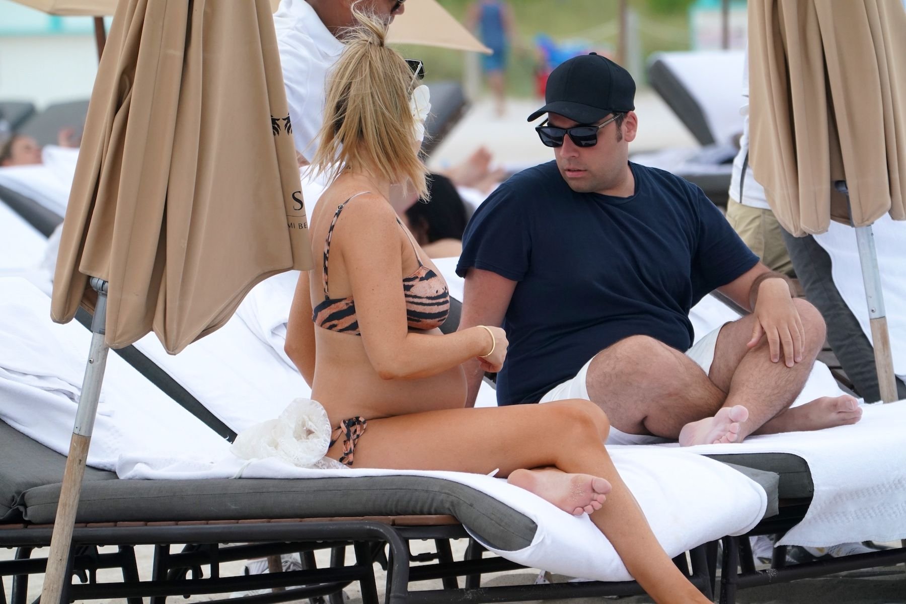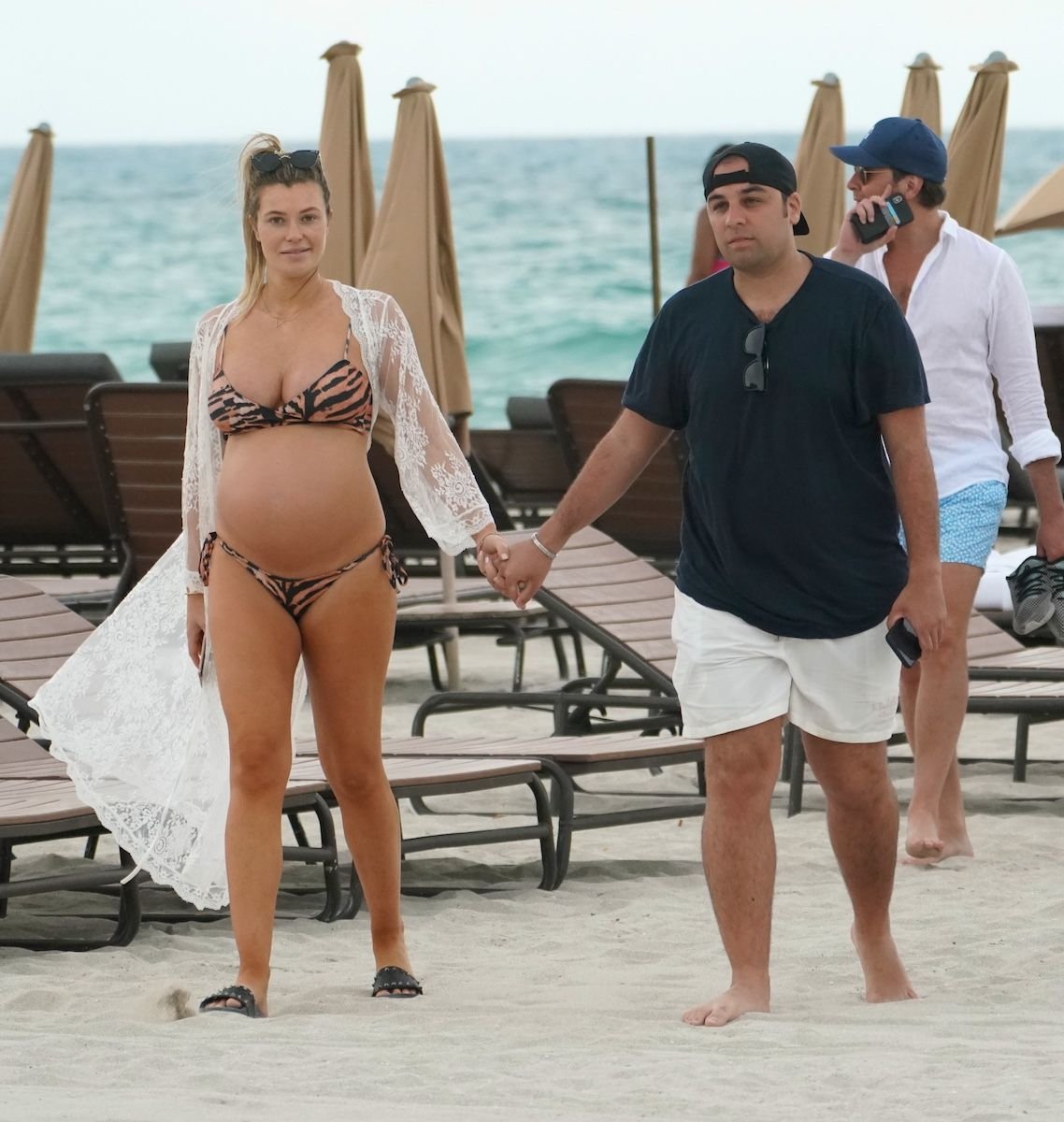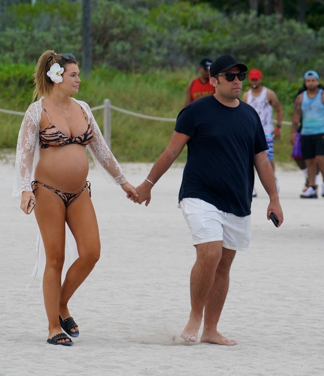 La modella di SI Swimsuit Samantha Hoopes mostra il suo enorme pancione in un bikini con stampa tigre, 12/05/2019. Samantha e il fidanzato Salvatore Palella hanno trascorso un pomeriggio in spiaggia per la Festa della Mamma.