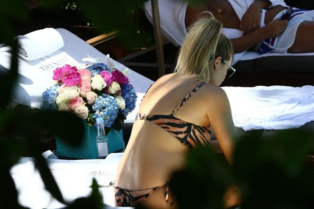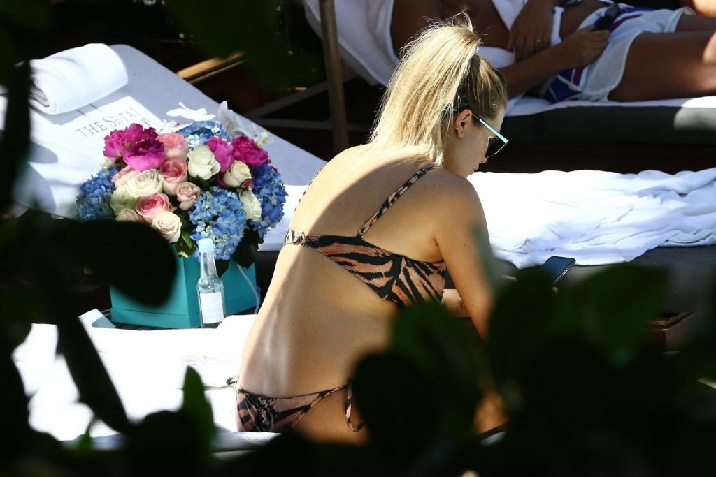 La modella sceglie un bikini animalier mentre si assicura che il suo bambino riceva tutta la vitamina D di cui ha bisogno.