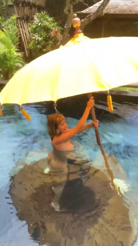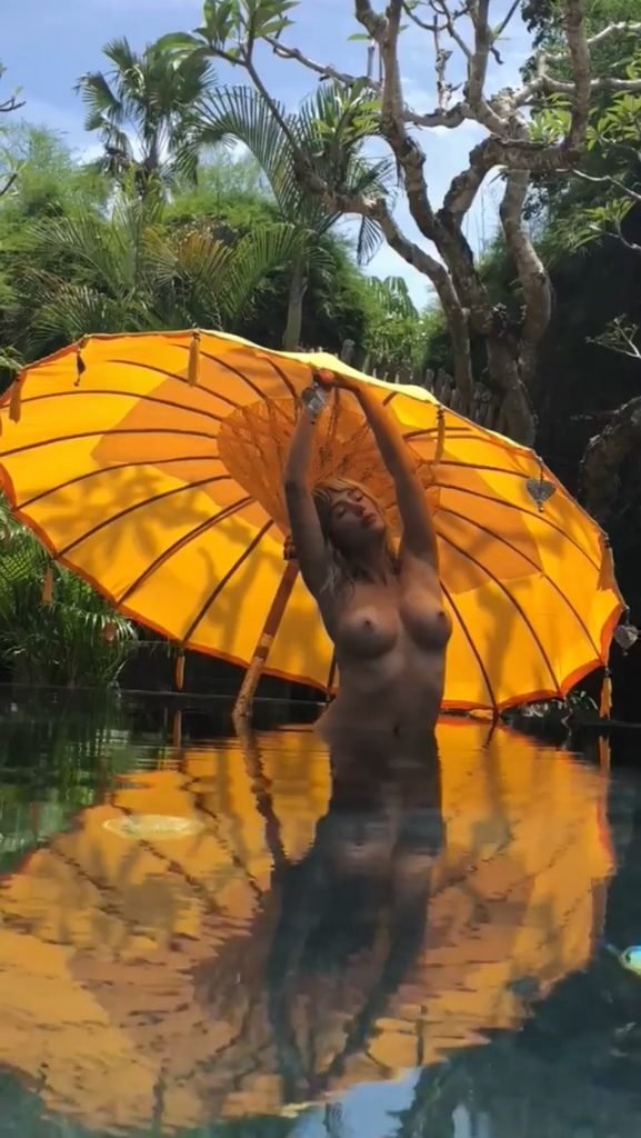 Model Sara Underwood fa un nuovo servizio fotografico a Bali, 25/03/2018. Ha trovato un ombrello in hotel e si è tuffata in piscina. Un po’ di umorismo e un lavoro eccellente. Buon compleanno, Sara!