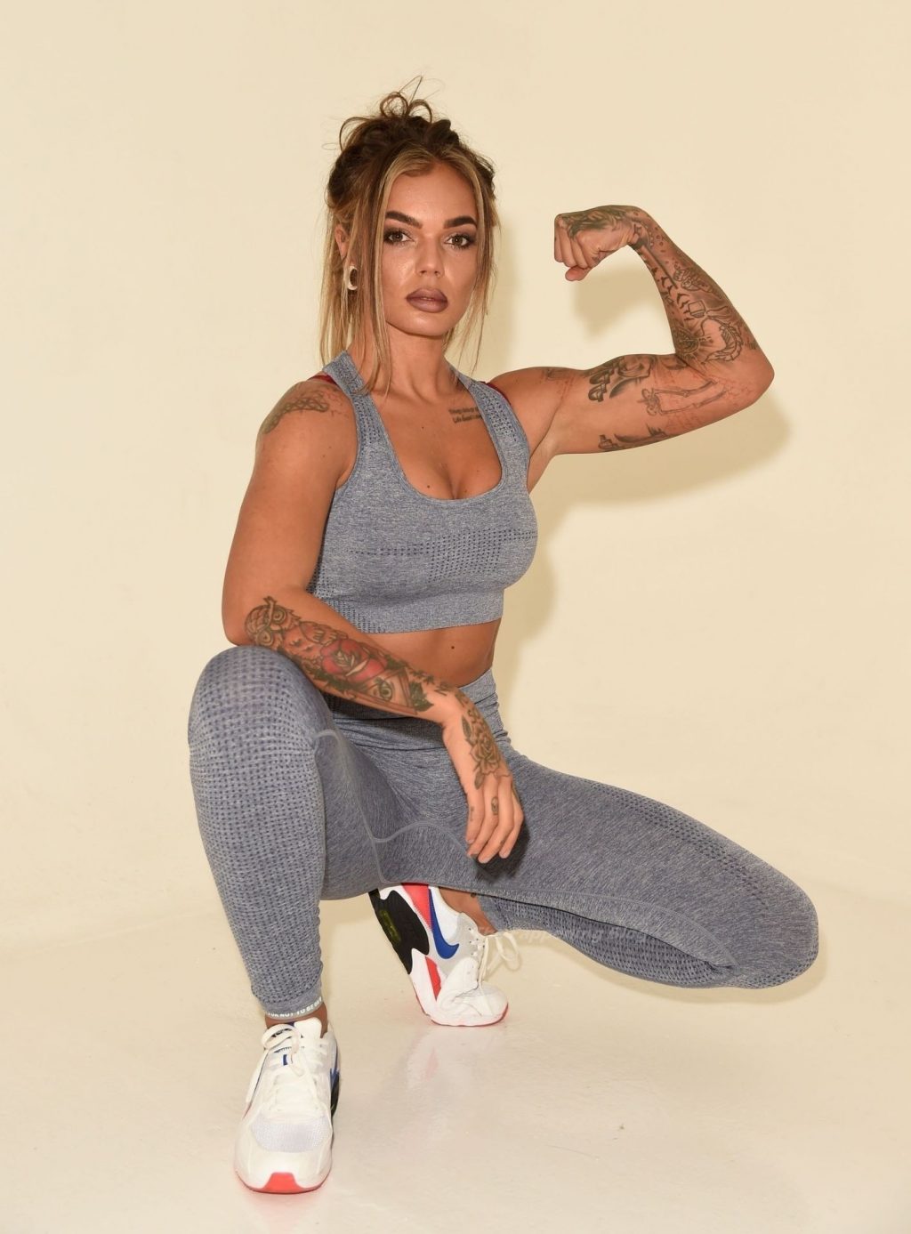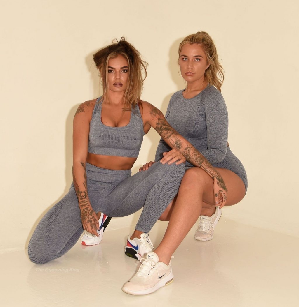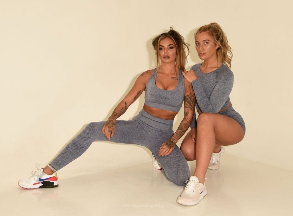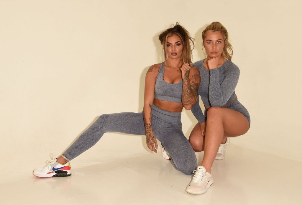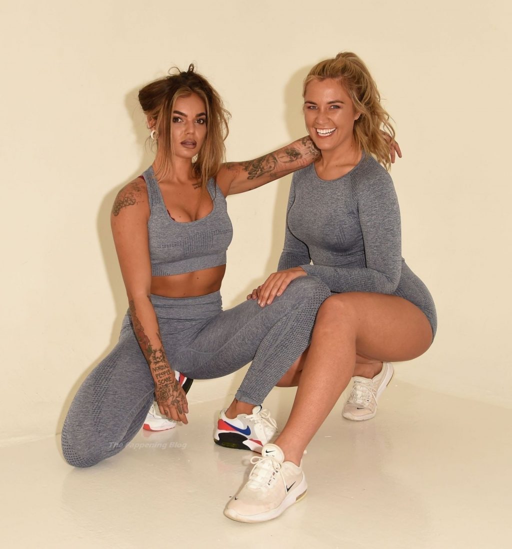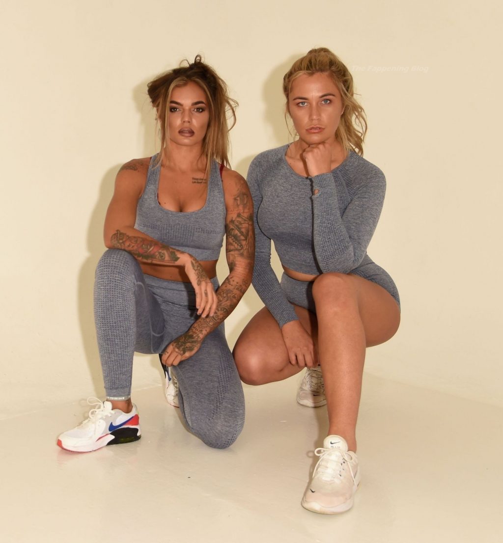 Coppia dello stesso sesso Sarah Hutchinson e Charlotte Taundry della nuova serie di appuntamenti ITV2 ‘The Cabins’ si godono un servizio fotografico sexy e sportivo a Manchester (2021).