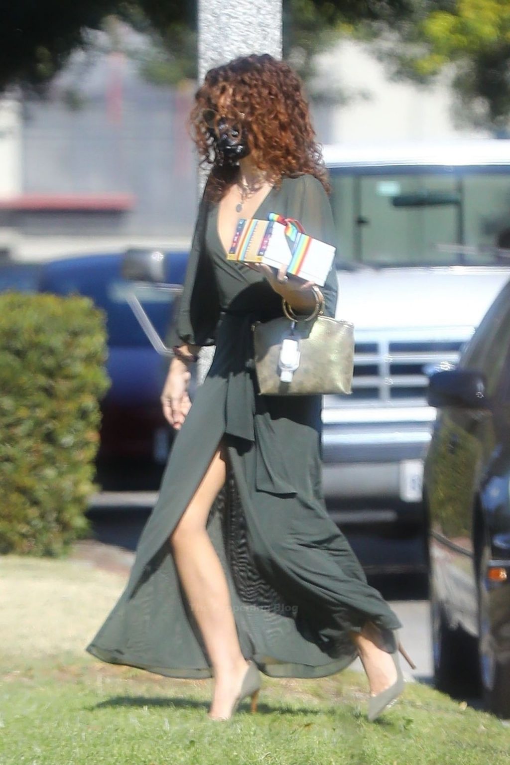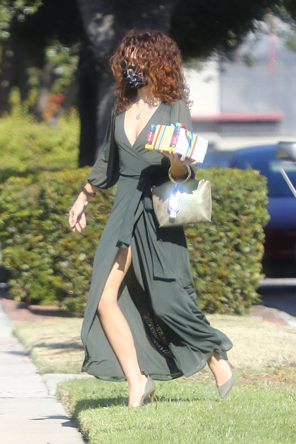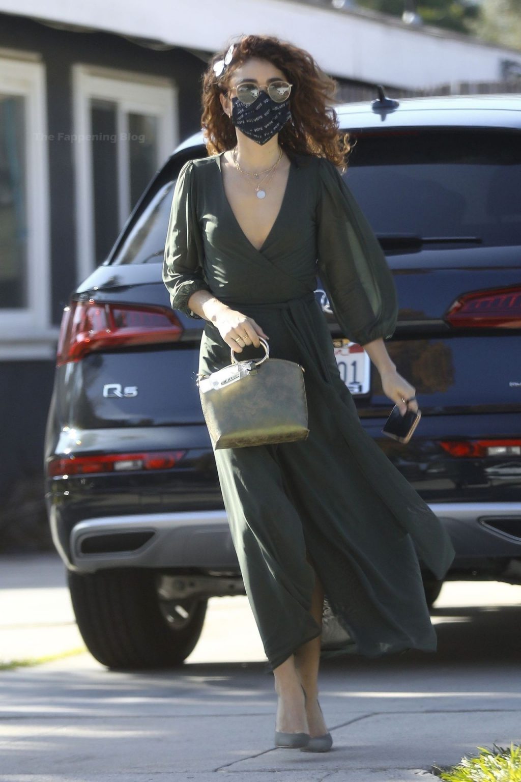 L’ex di Modern Family è apparsa elegante senza reggiseno in un abito a portafoglio color oliva e décolleté in suede. Sarah ha accessoriato con un basco a farfalla per capelli e una borsa verde con manico dorato, con il suo disinfettante per le mani comodamente agganciato. L’attrice si è assicurata di restare al sicuro indossando una maschera Vote di MASKC.