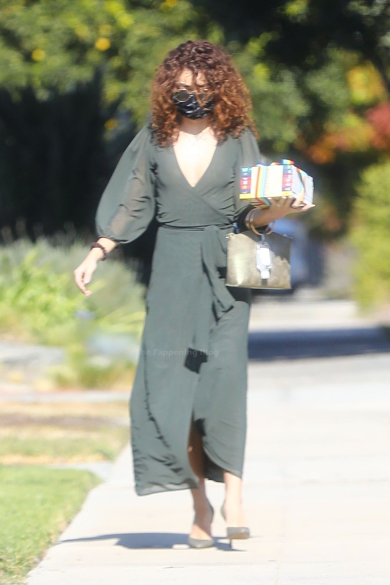 L’ex di Modern Family è apparsa elegante senza reggiseno in un abito a portafoglio color oliva e décolleté in suede. Sarah ha accessoriato con un basco a farfalla per capelli e una borsa verde con manico dorato, con il suo disinfettante per le mani comodamente agganciato. L’attrice si è assicurata di restare al sicuro indossando una maschera Vote di MASKC.