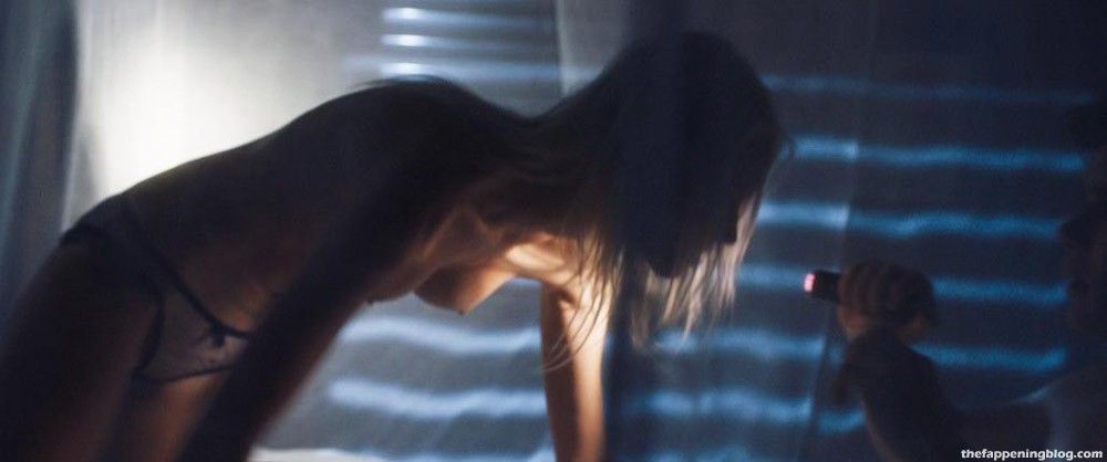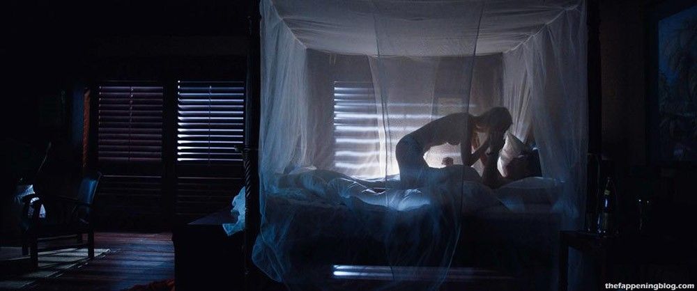 Sasha Luss is pulling her dress off to go topless, wearing just a pair of panties. Sasha crawls into a guy’s bed on all fours and leans over to kiss him.