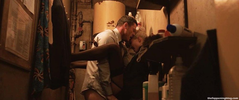 Blonde Sasha Luss has hard sex with a guy in a storage closet as she bounces around while sitting on the edge of a counter. Her legs up on the wall across the room until finally he finishes and steps back.