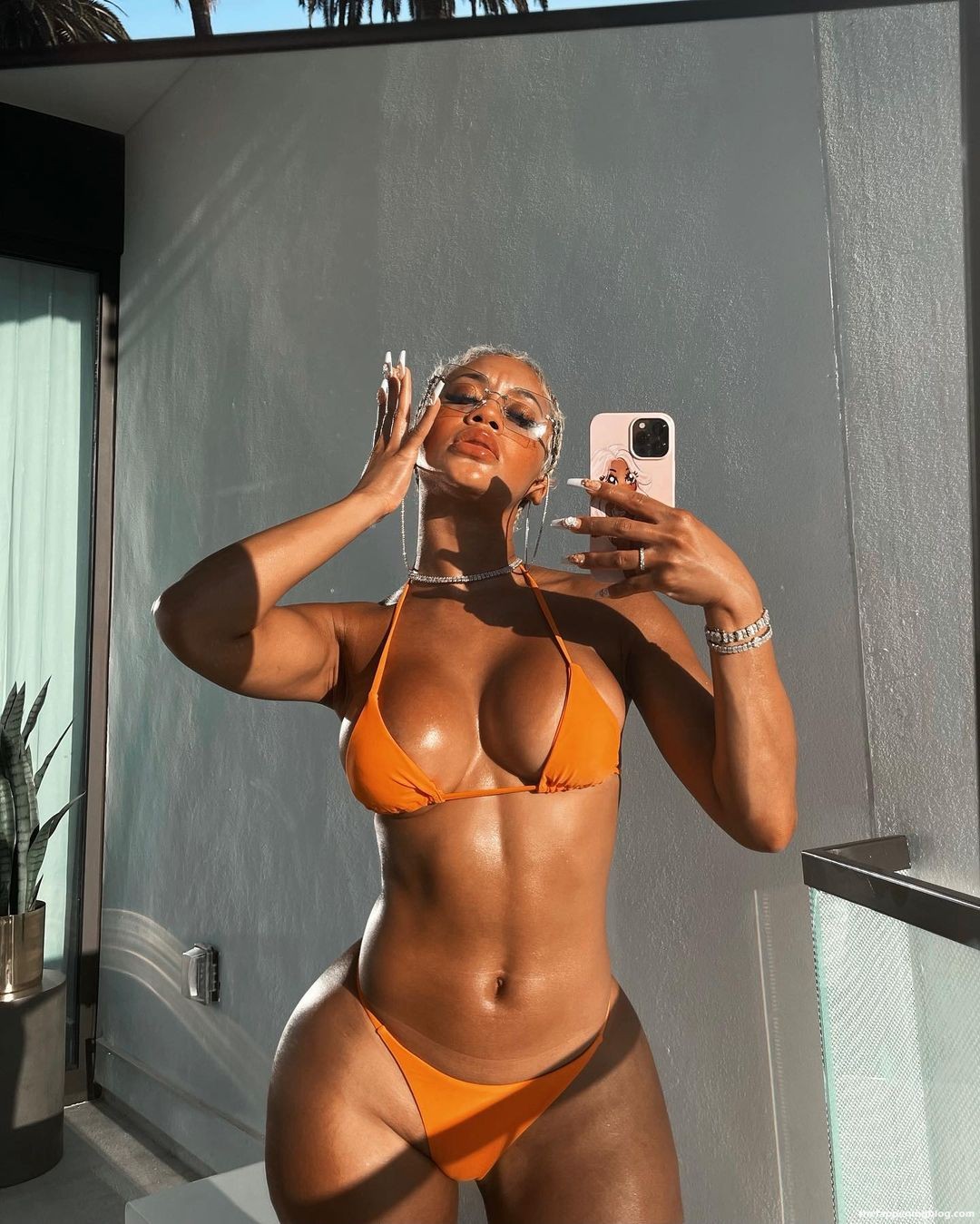 La rapper Saweetie (Diamonté Quiava Valentin Harper) posa con un bikini arancione, mostrando i suoi seni oliati, mentre promuove una nuova campagna Matte Swim – Instagram, 08/05/2021.