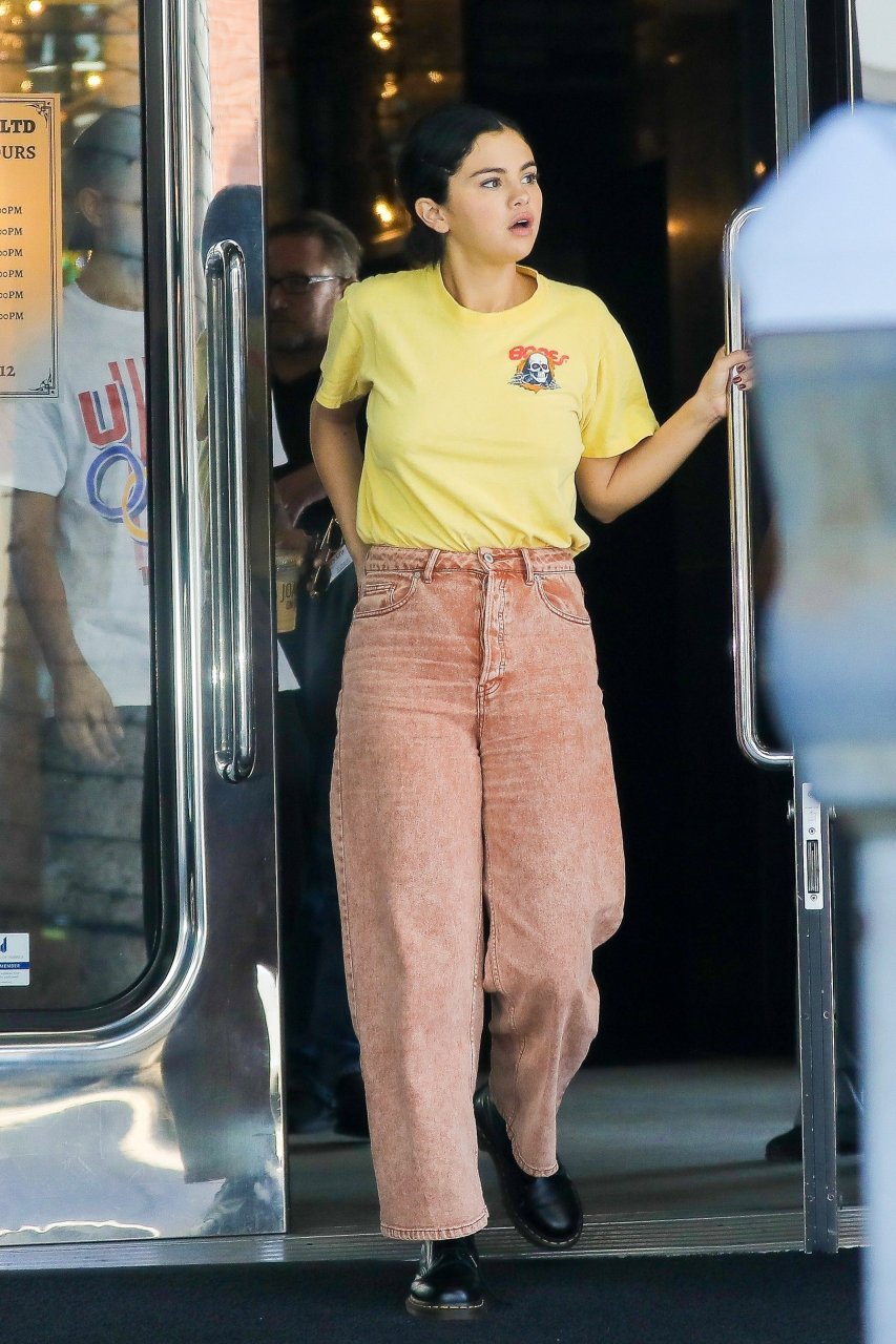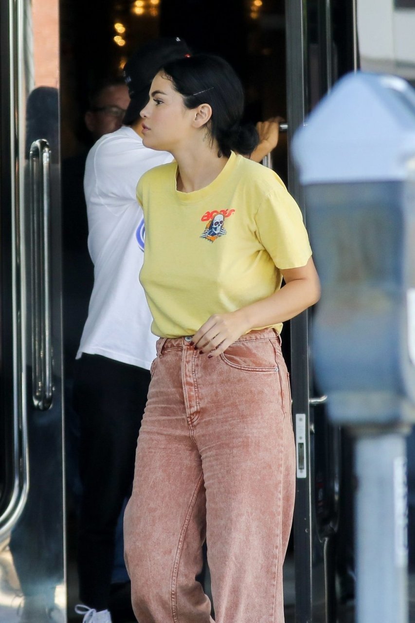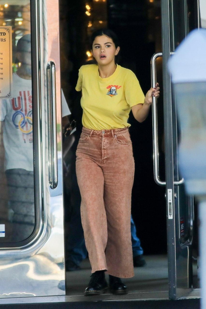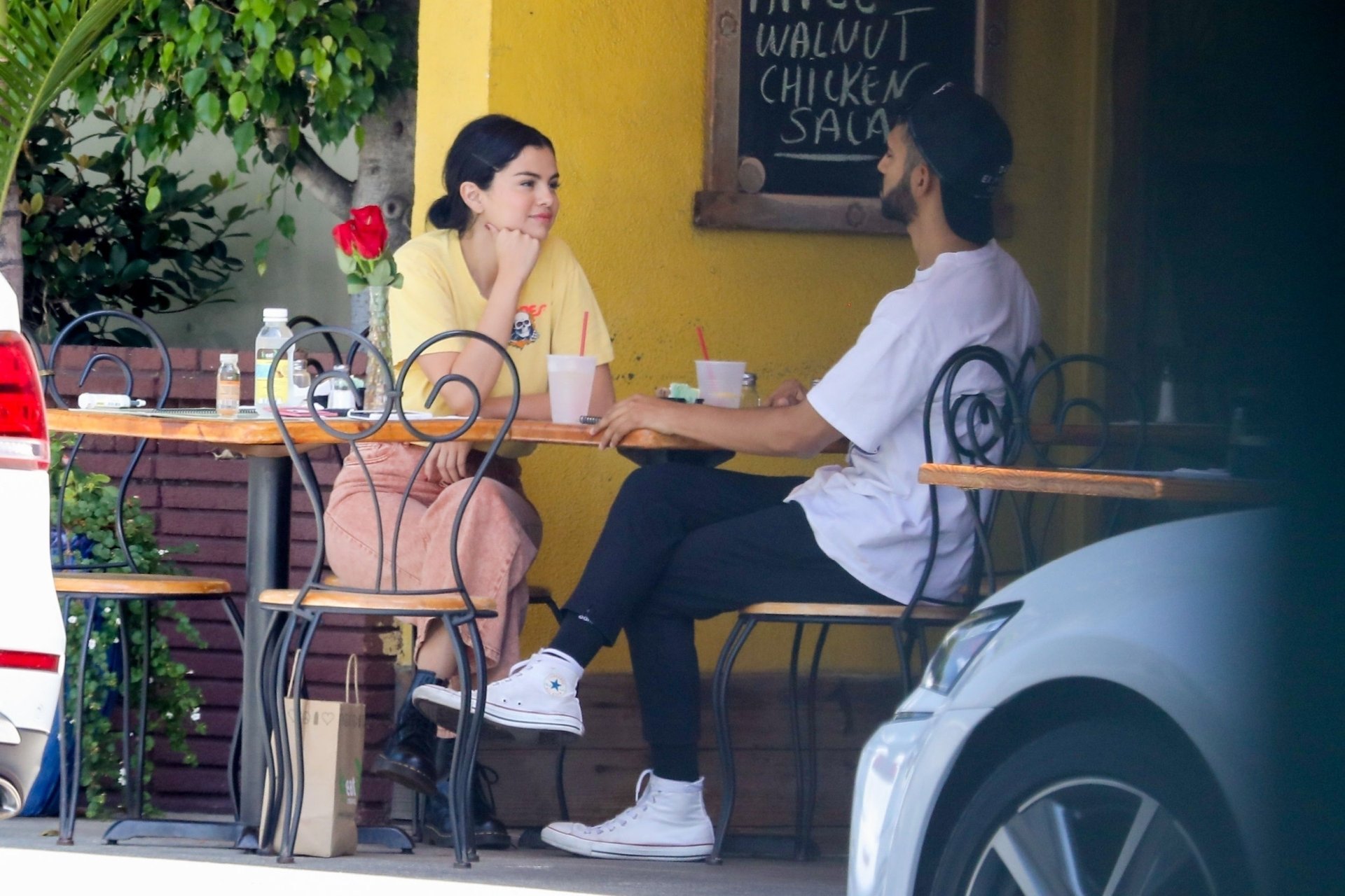 Selena Gomez gode di una colazione all’aperto con un uomo sconosciuto dopo aver fatto shopping da XIV Karats, Ltd a Beverly Hills, 21/09/2018. Selena sembra innamorata mentre chiacchiera con il suo amico indossando una maglietta Bones skate boarder con jeans rossi acid washed e stivali in pelle Dr. Martens, durante la sua uscita mattutina informale a Los Angeles.