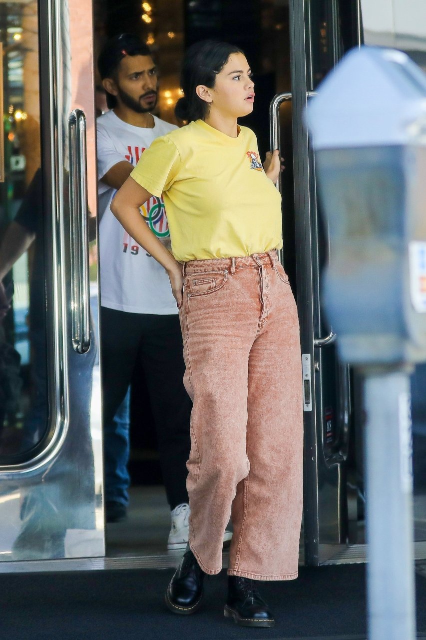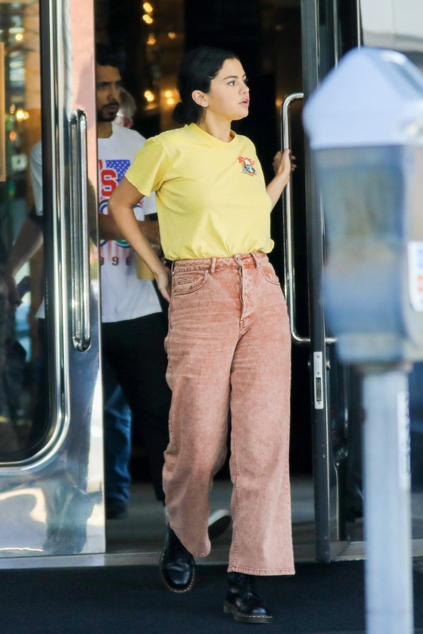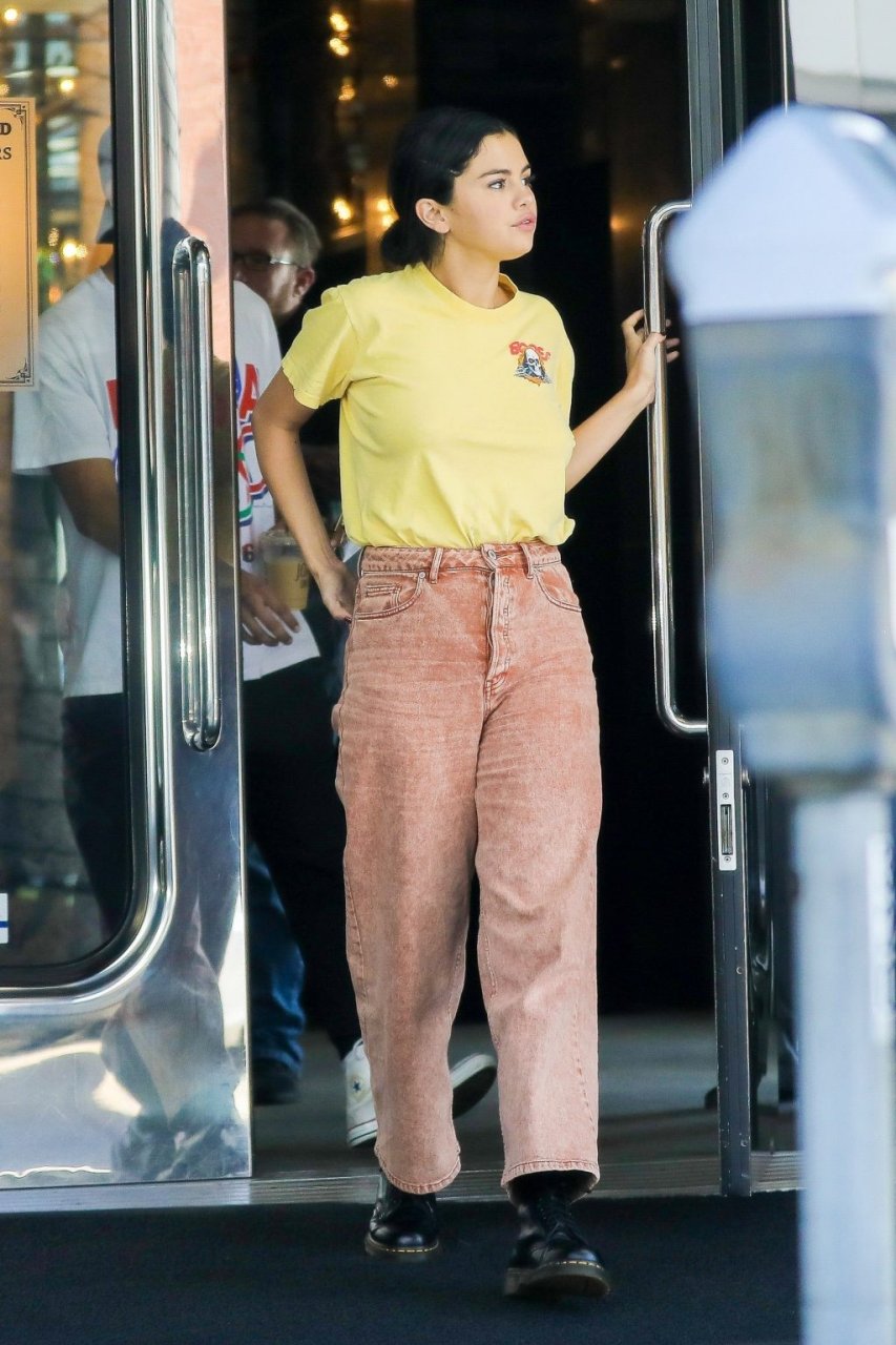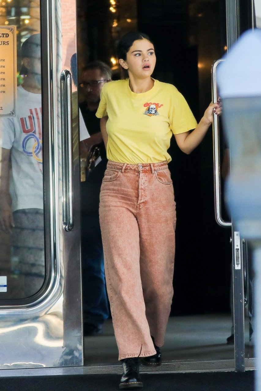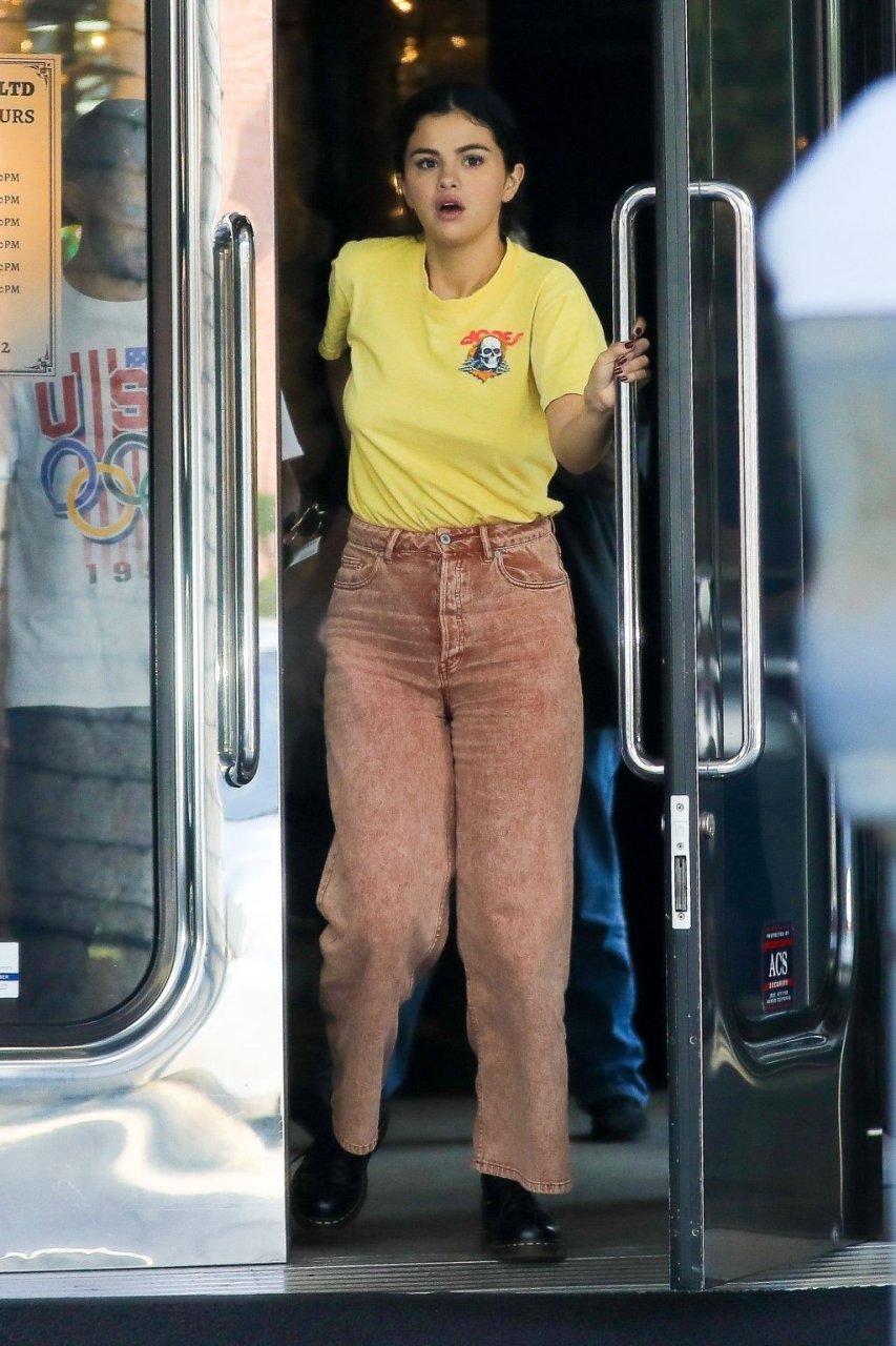 Selena Gomez gode di una colazione all’aperto con un uomo sconosciuto dopo aver fatto shopping da XIV Karats, Ltd a Beverly Hills, 21/09/2018. Selena sembra innamorata mentre chiacchiera con il suo amico indossando una maglietta Bones skate boarder con jeans rossi acid washed e stivali in pelle Dr. Martens, durante la sua uscita mattutina informale a Los Angeles.