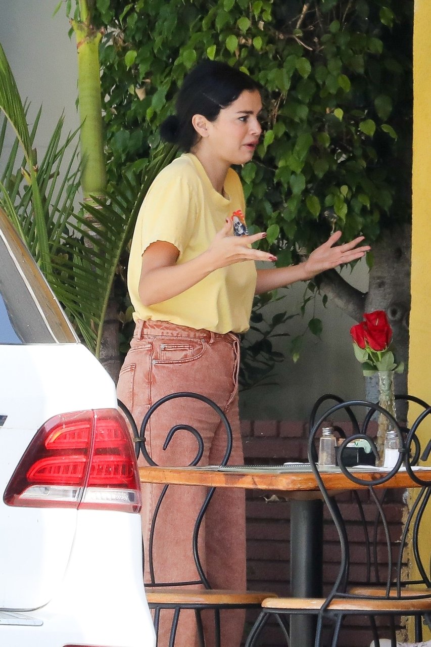 Ecco alcune foto casuali di Selena Gomez che parla con qualcuno indossando i vestiti di suo padre