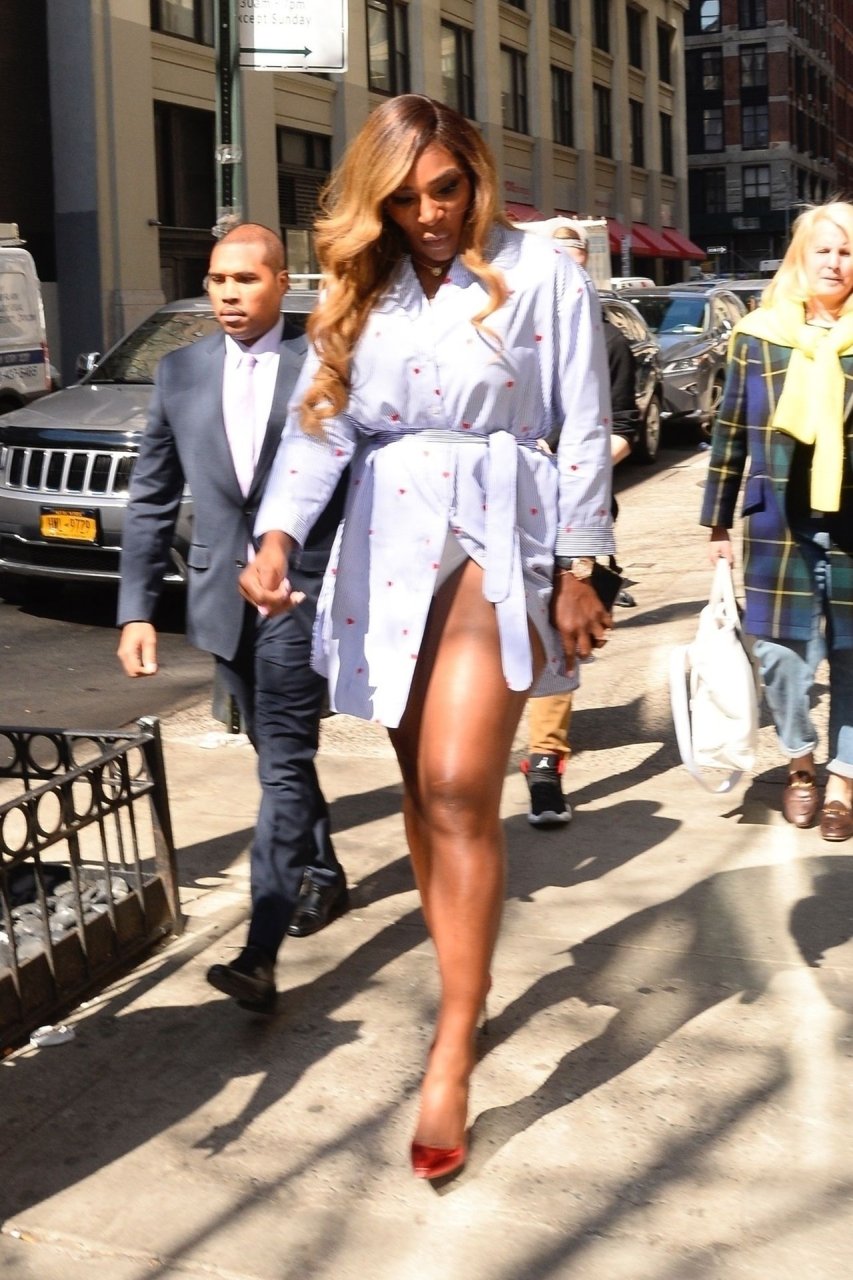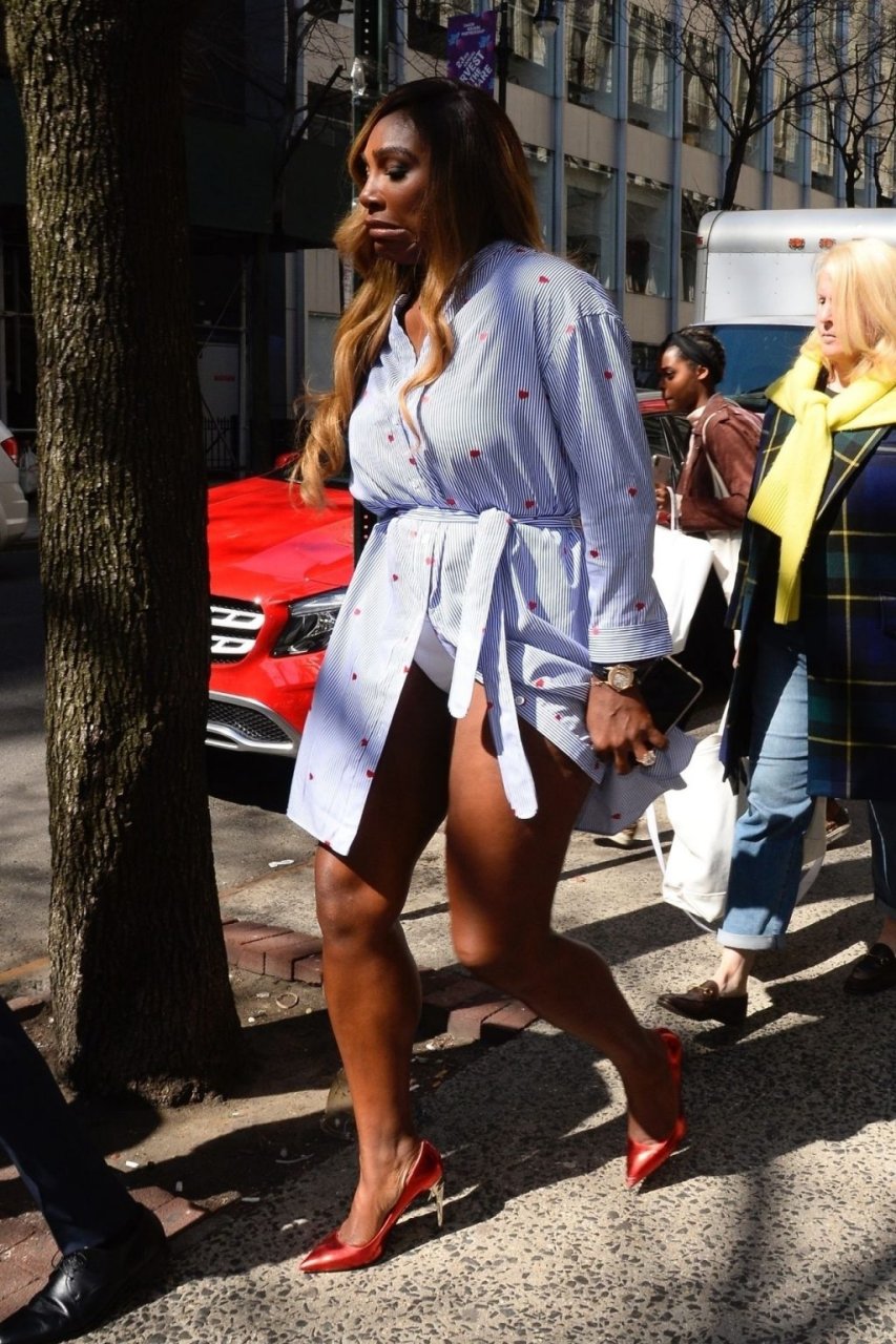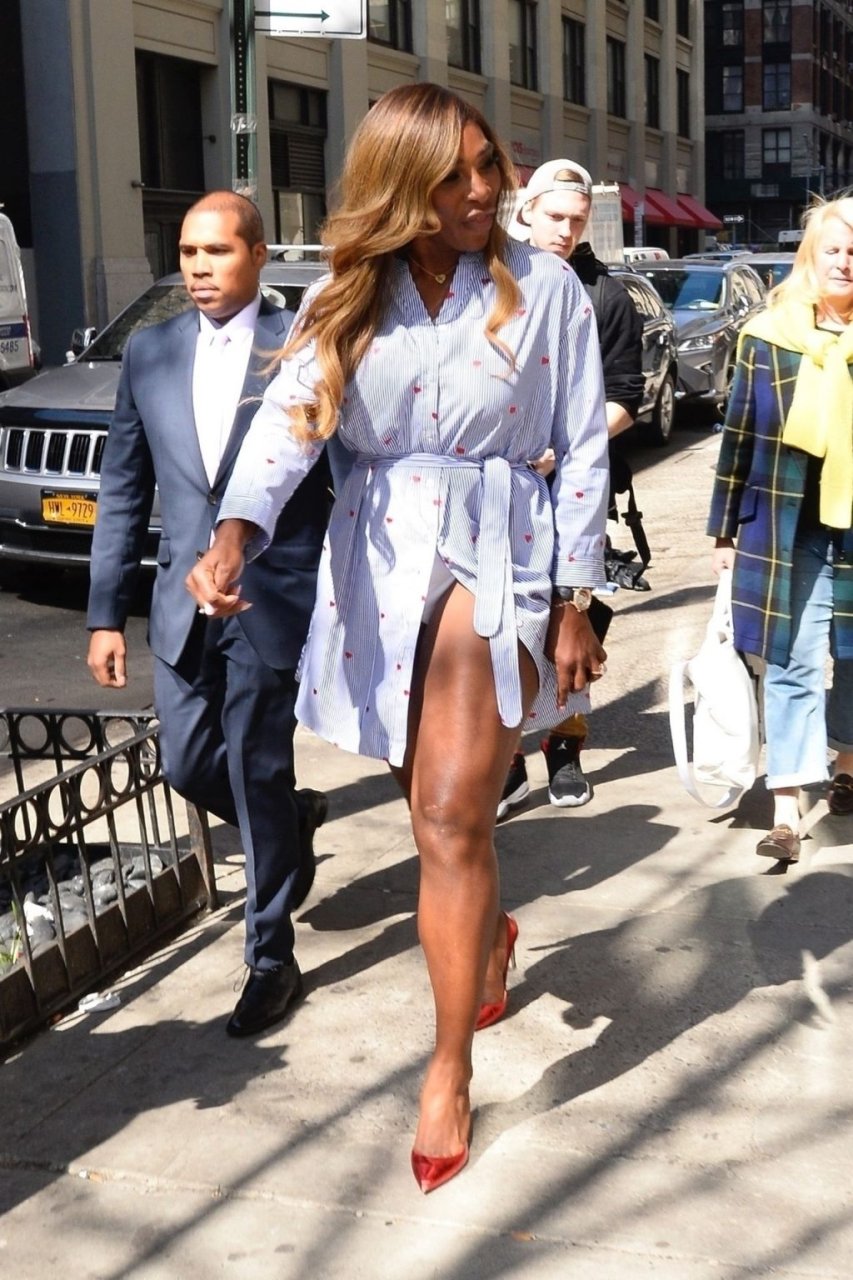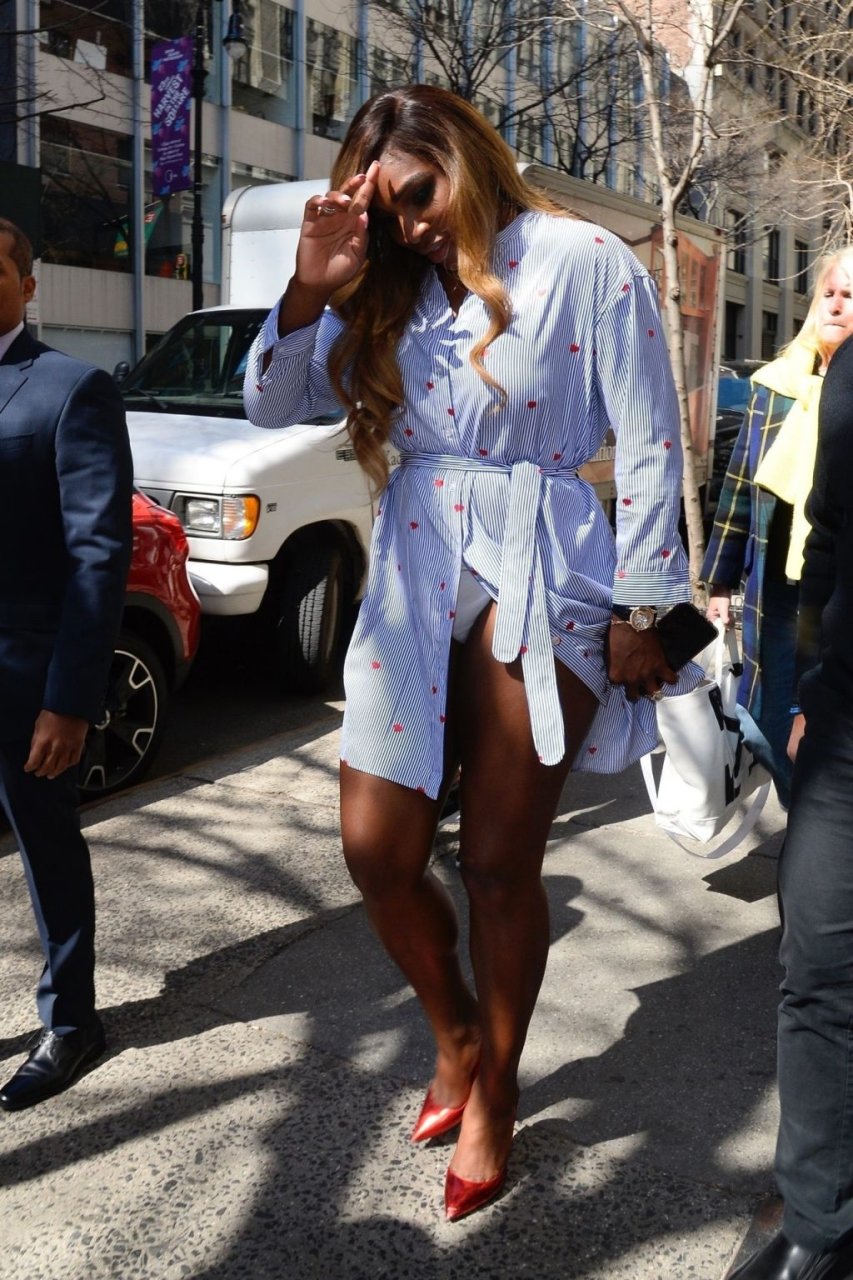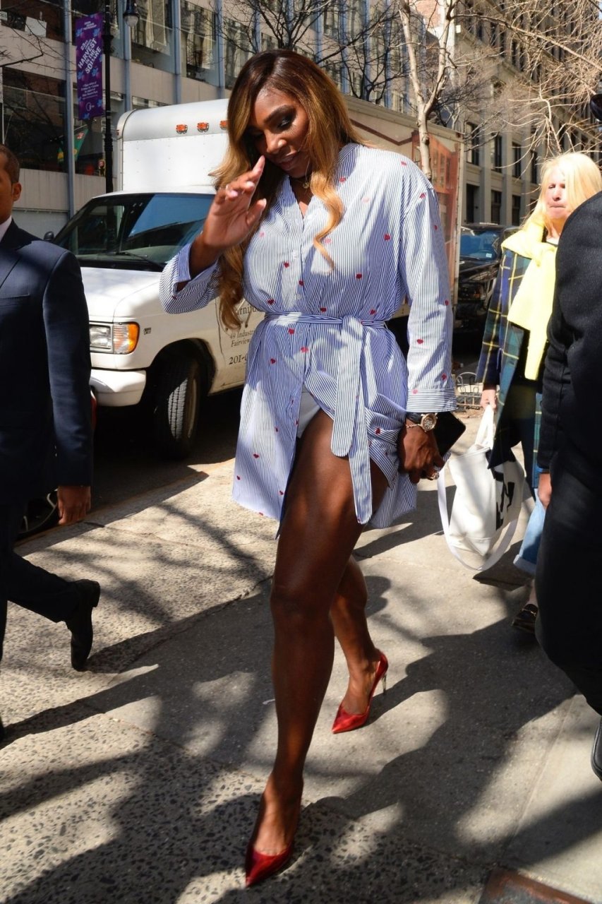 Serena Williams sfoggia un vestito molto corto con spacco che mostra la sua biancheria intima. Serena è stata vista uscire dagli uffici di Buzzfeed mentre mostrava questo look audace – New York, 04/03/2019.