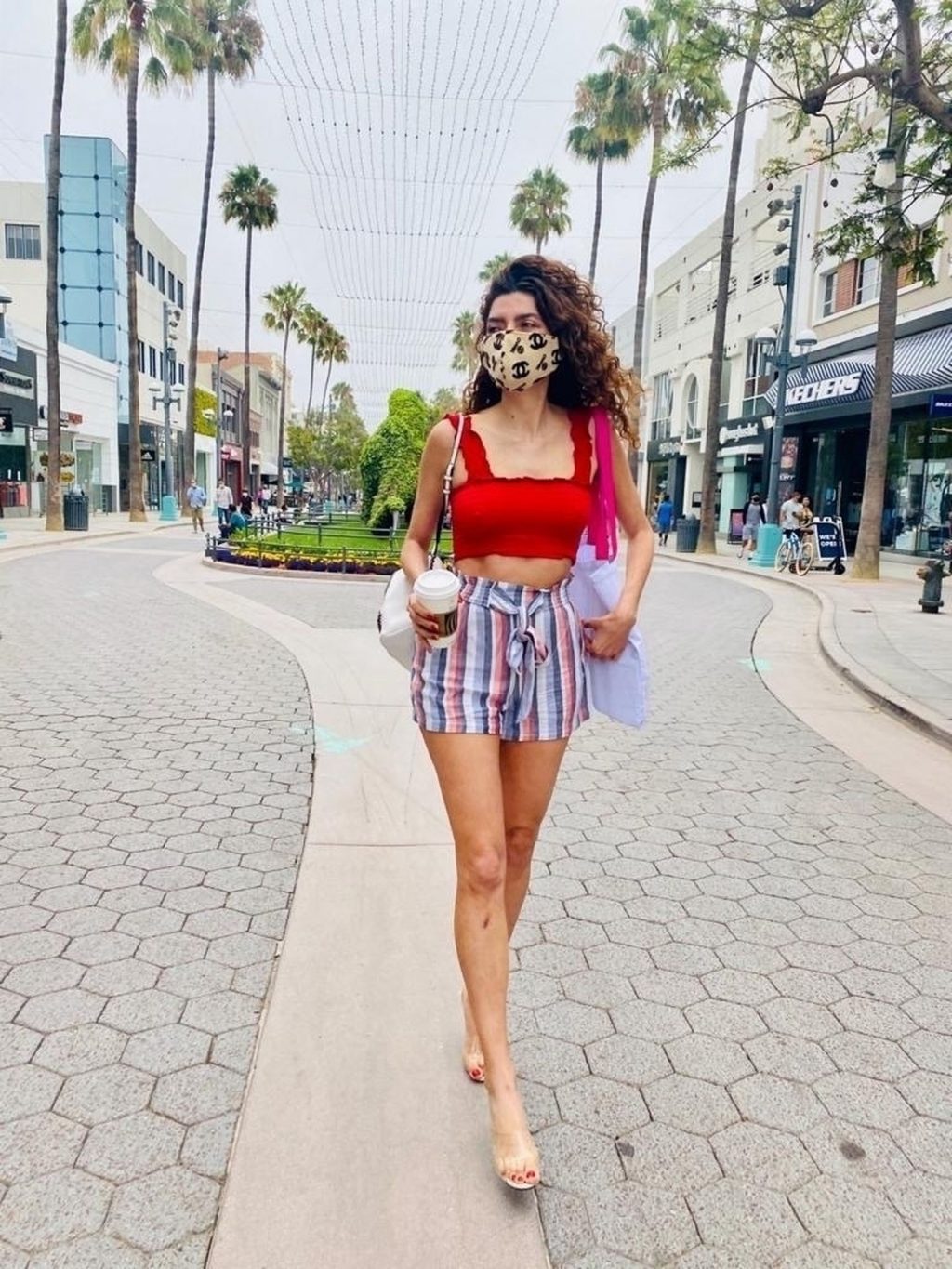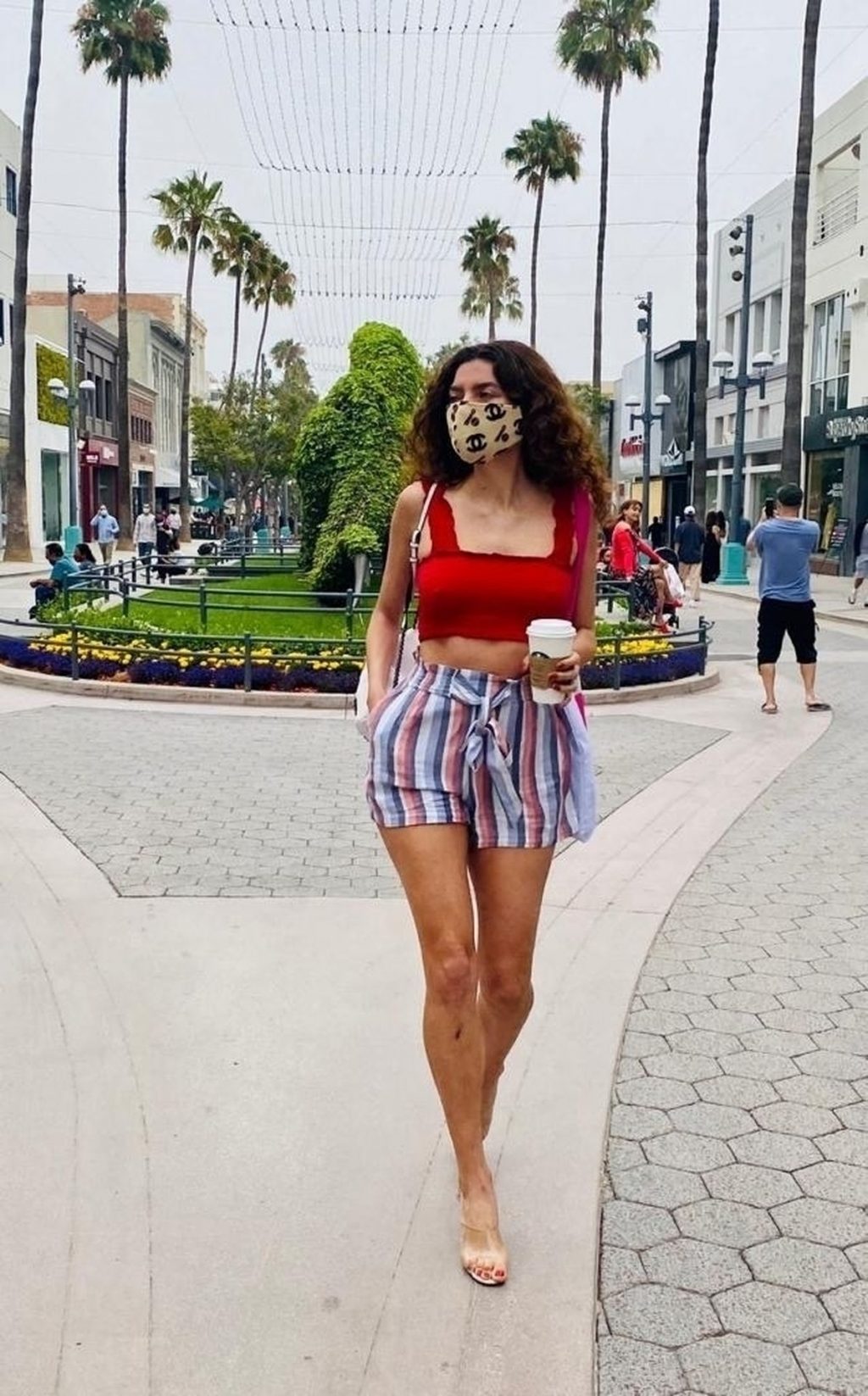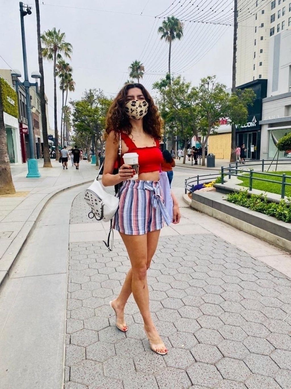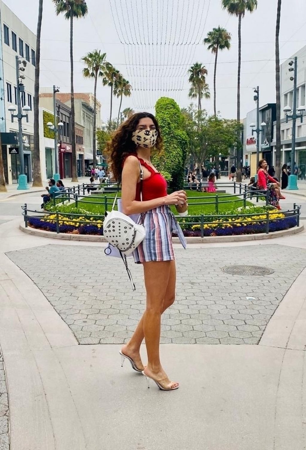 Blanca Blanco con gambe lunghe prende un caffè al Third Street Promenade a Santa Monica, 03/08/2020.