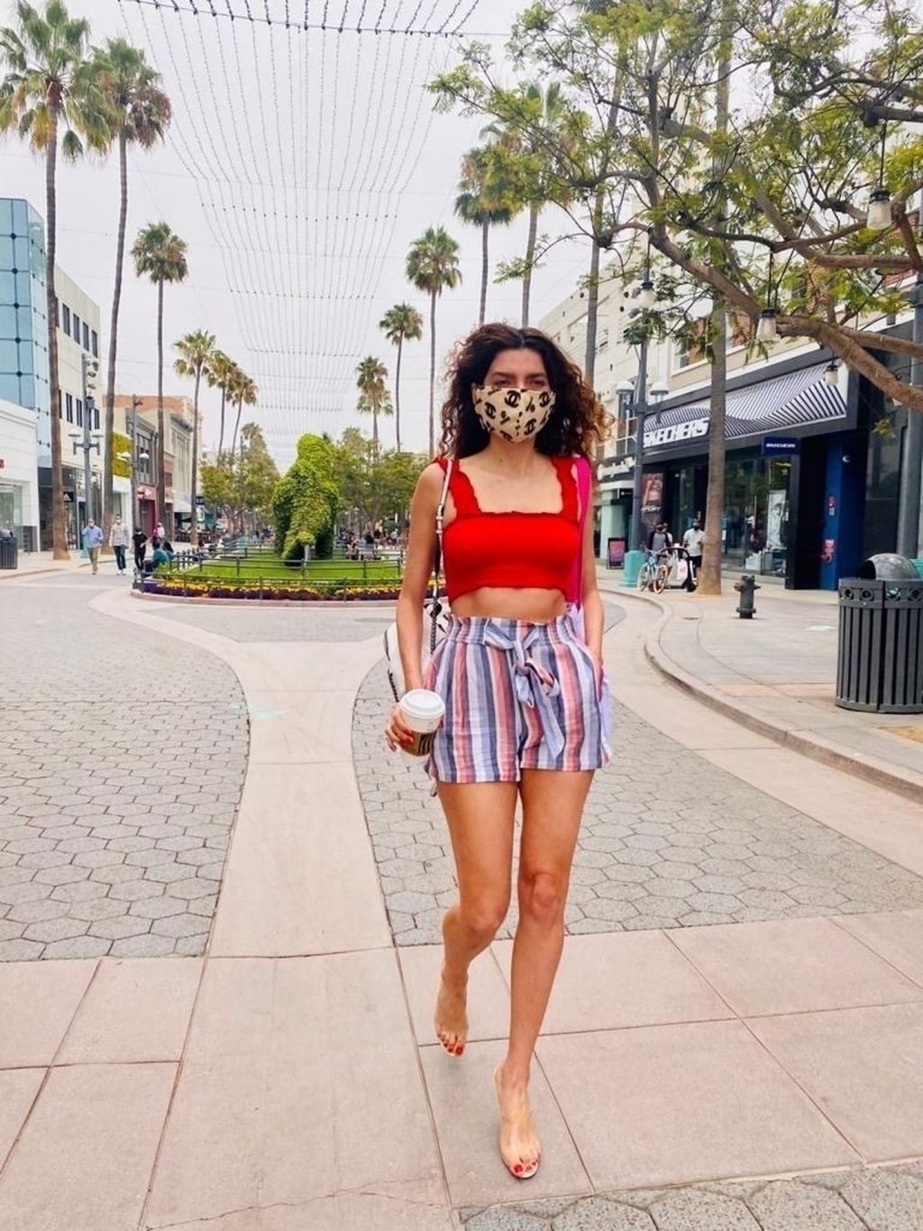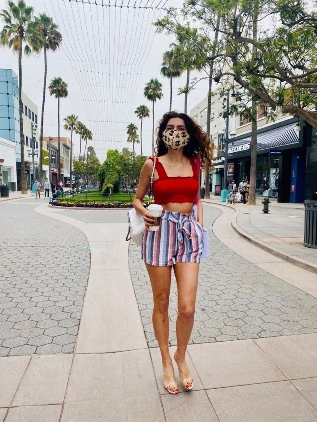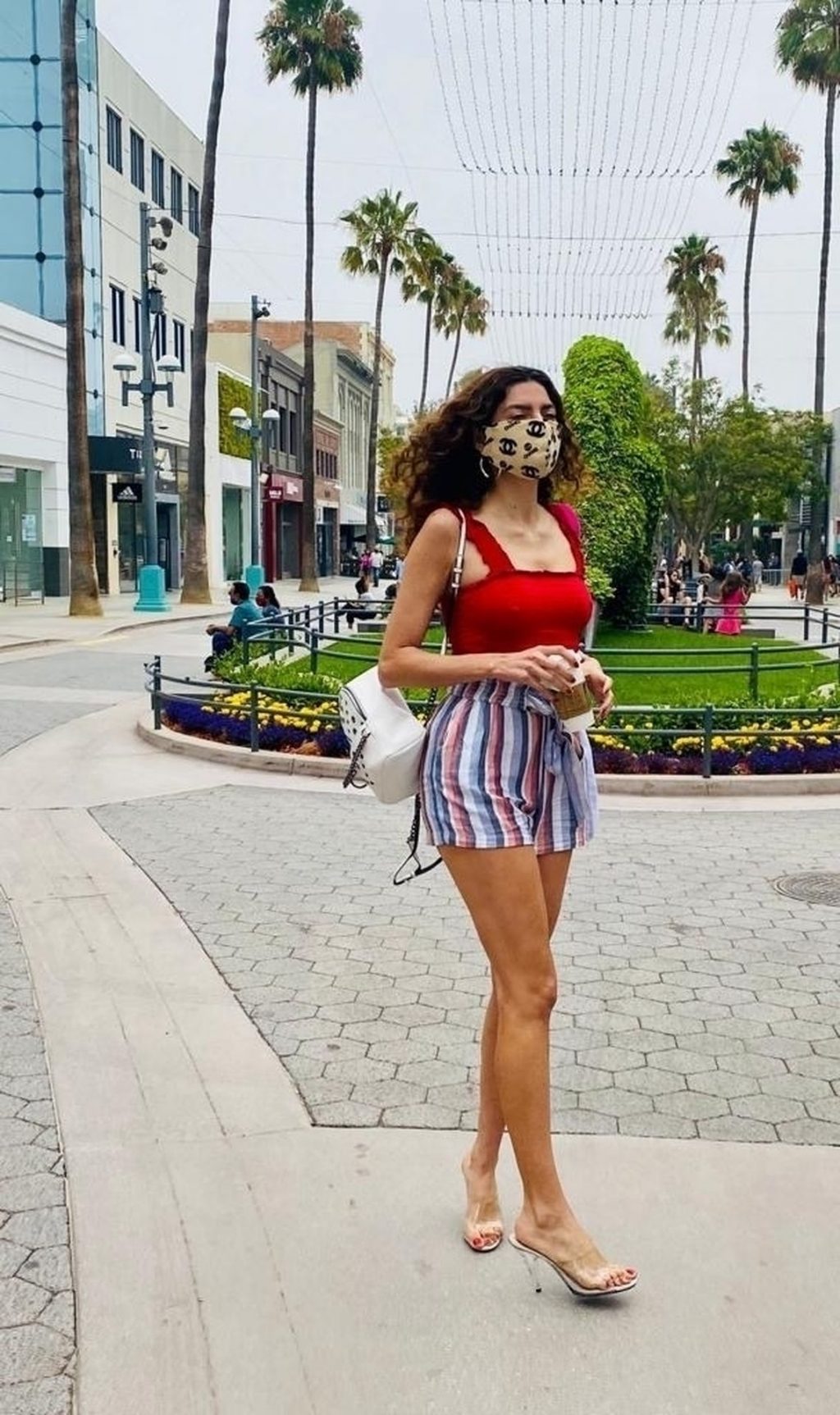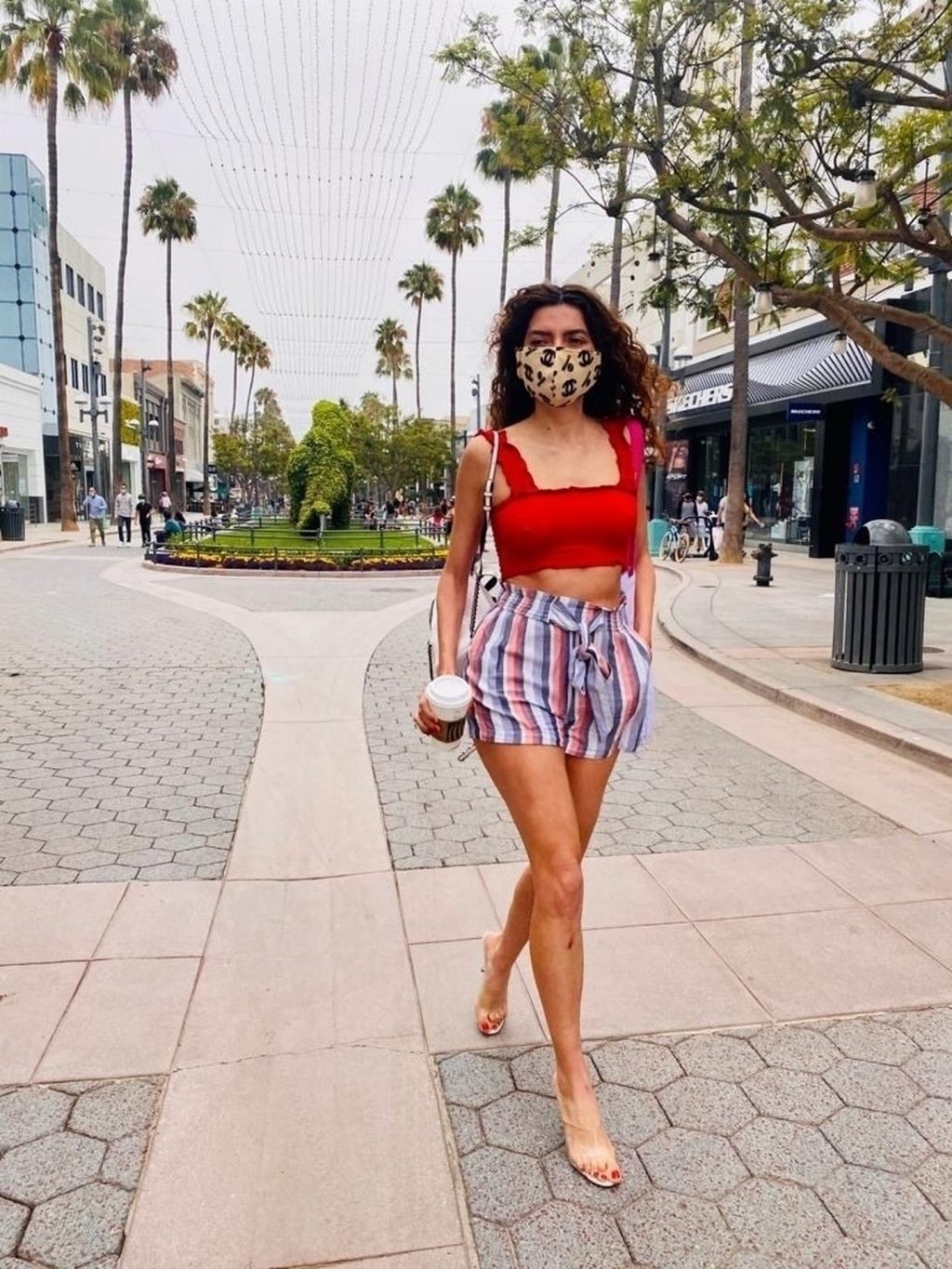 Blanca Blanco con gambe lunghe prende un caffè al Third Street Promenade a Santa Monica, 03/08/2020.