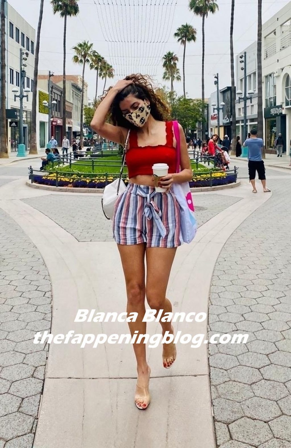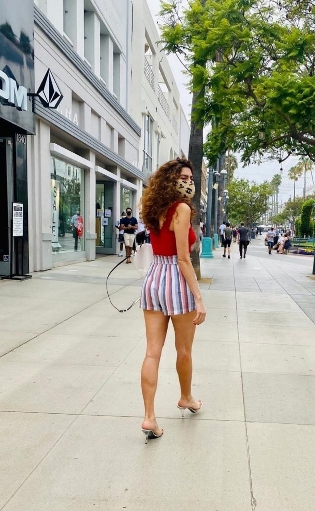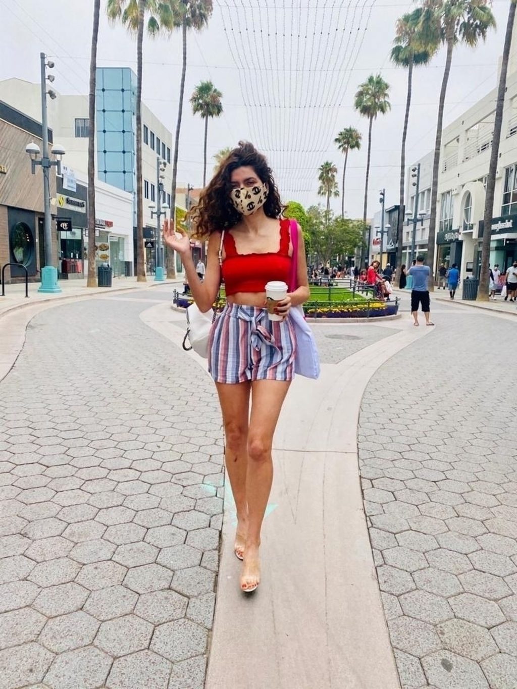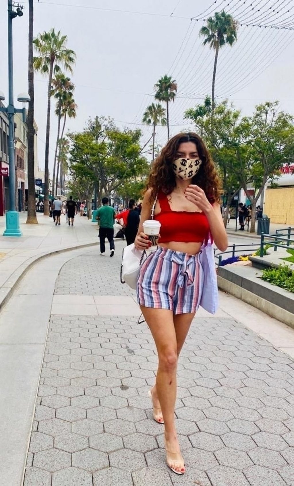 Blanca Blanco con gambe lunghe prende un caffè al Third Street Promenade a Santa Monica, 03/08/2020.