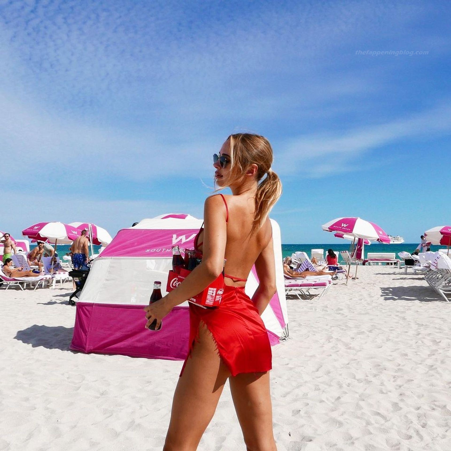 Kimberley Garner si gode la spiaggia con un bikini rosa a fantasia prima di cambiarsi in un abito di seta rosso per posare per alcune foto a Miami, 01/07/2021.