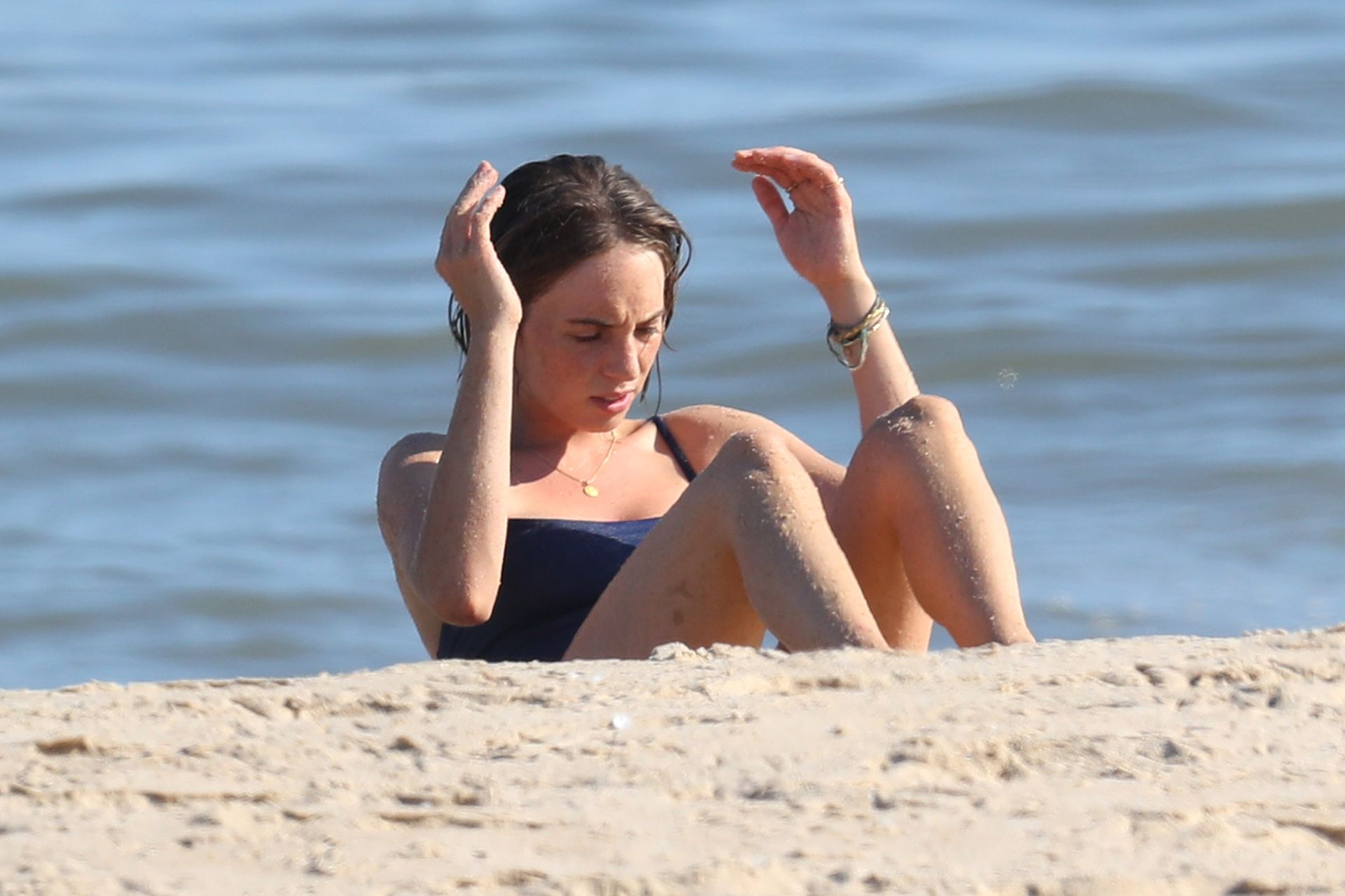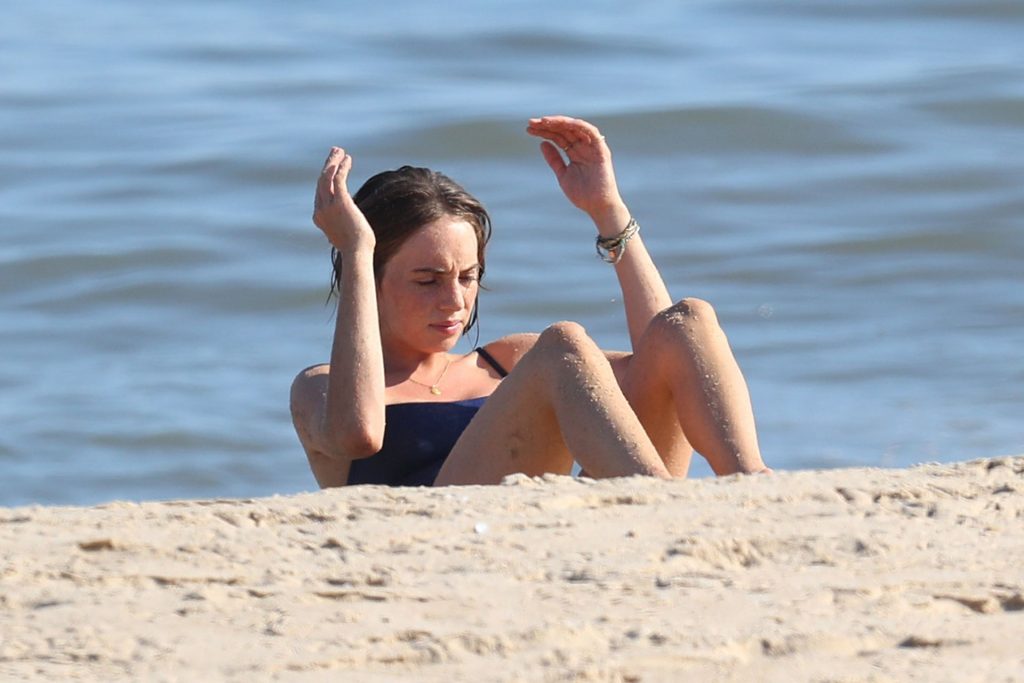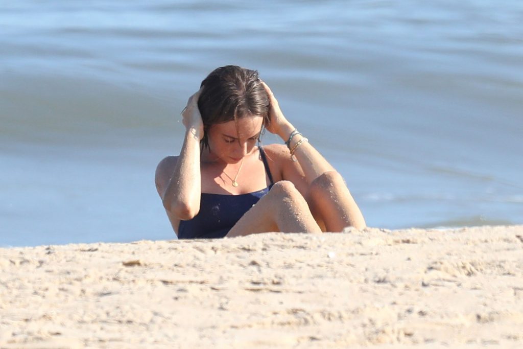 Hawke indossava un costume intero blu ed è stata fotografata mentre faceva crunch e sollevamenti delle gambe sul lungomare.