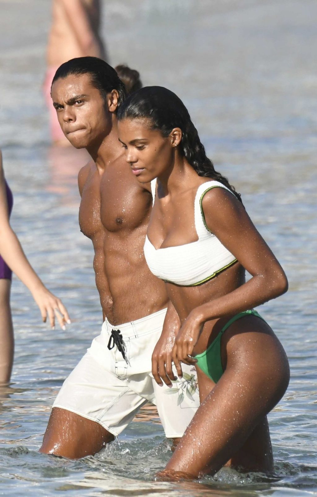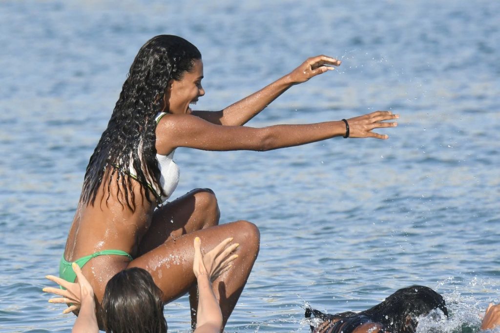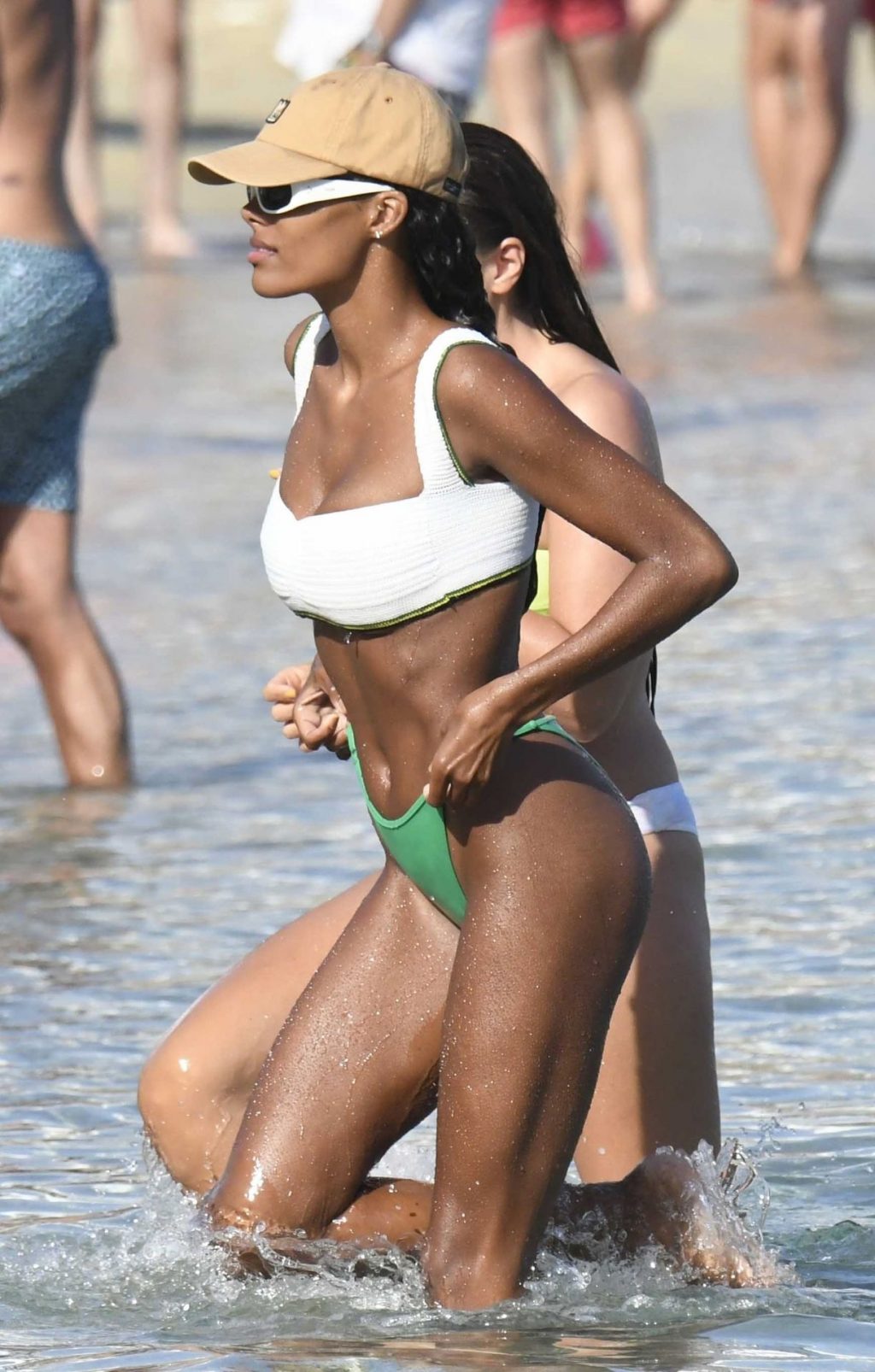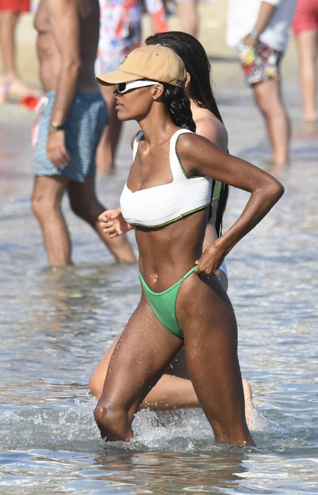 La fidanzata dell’attore francese Vincent Cassel, la modella francese Tina Kunakey, si gode la spiaggia indossando il suo succinto bikini verde, assaporando il sole greco durante una vacanza sull’isola di Mykonos, 08/06/2020.