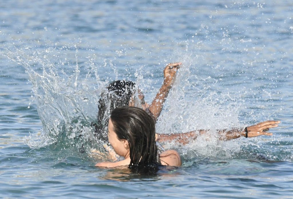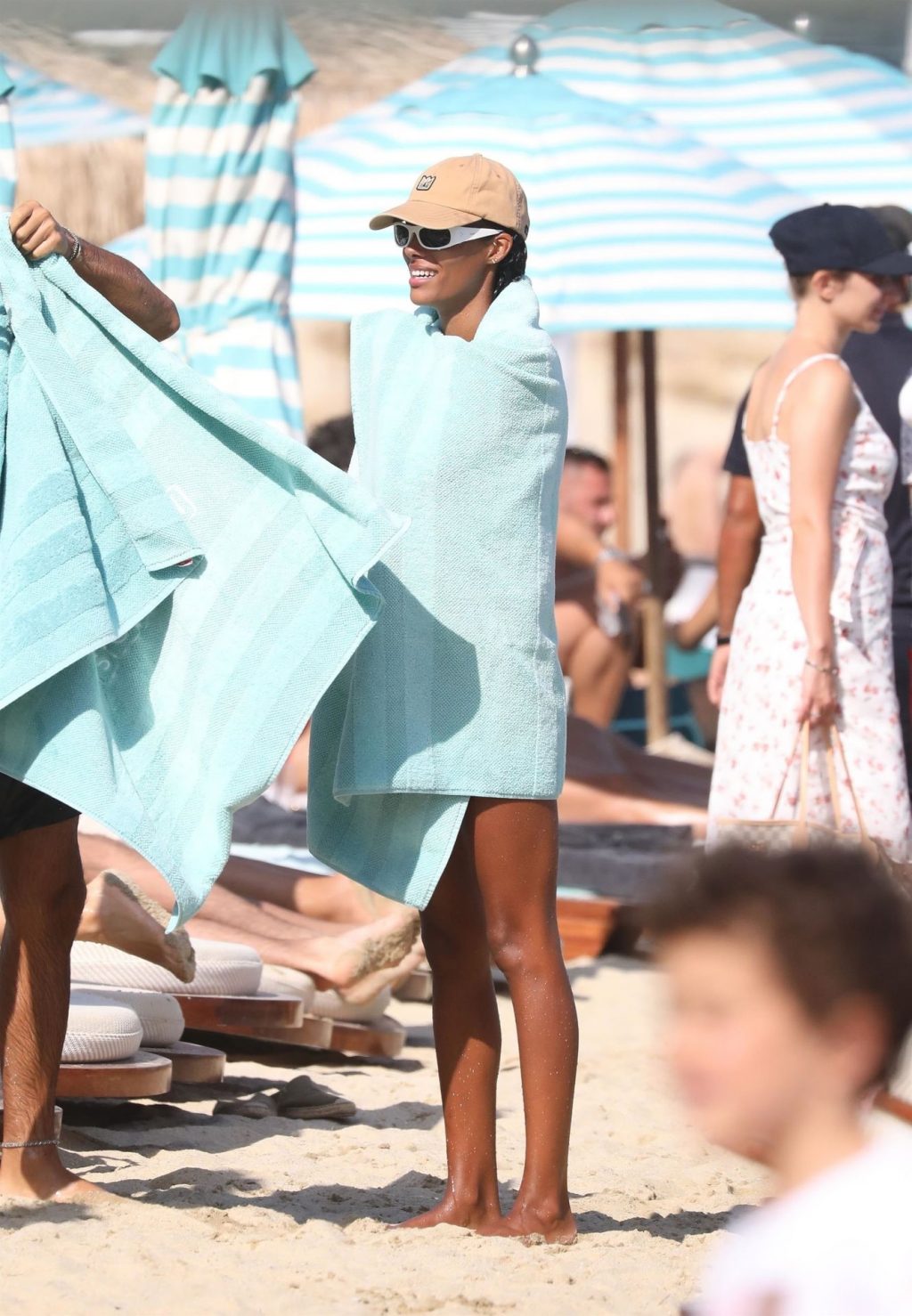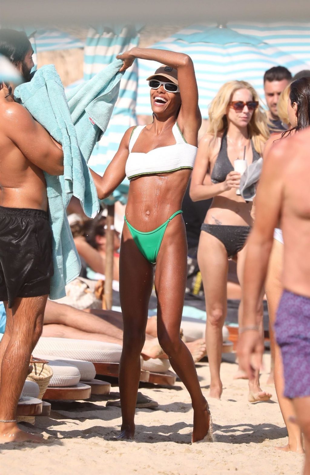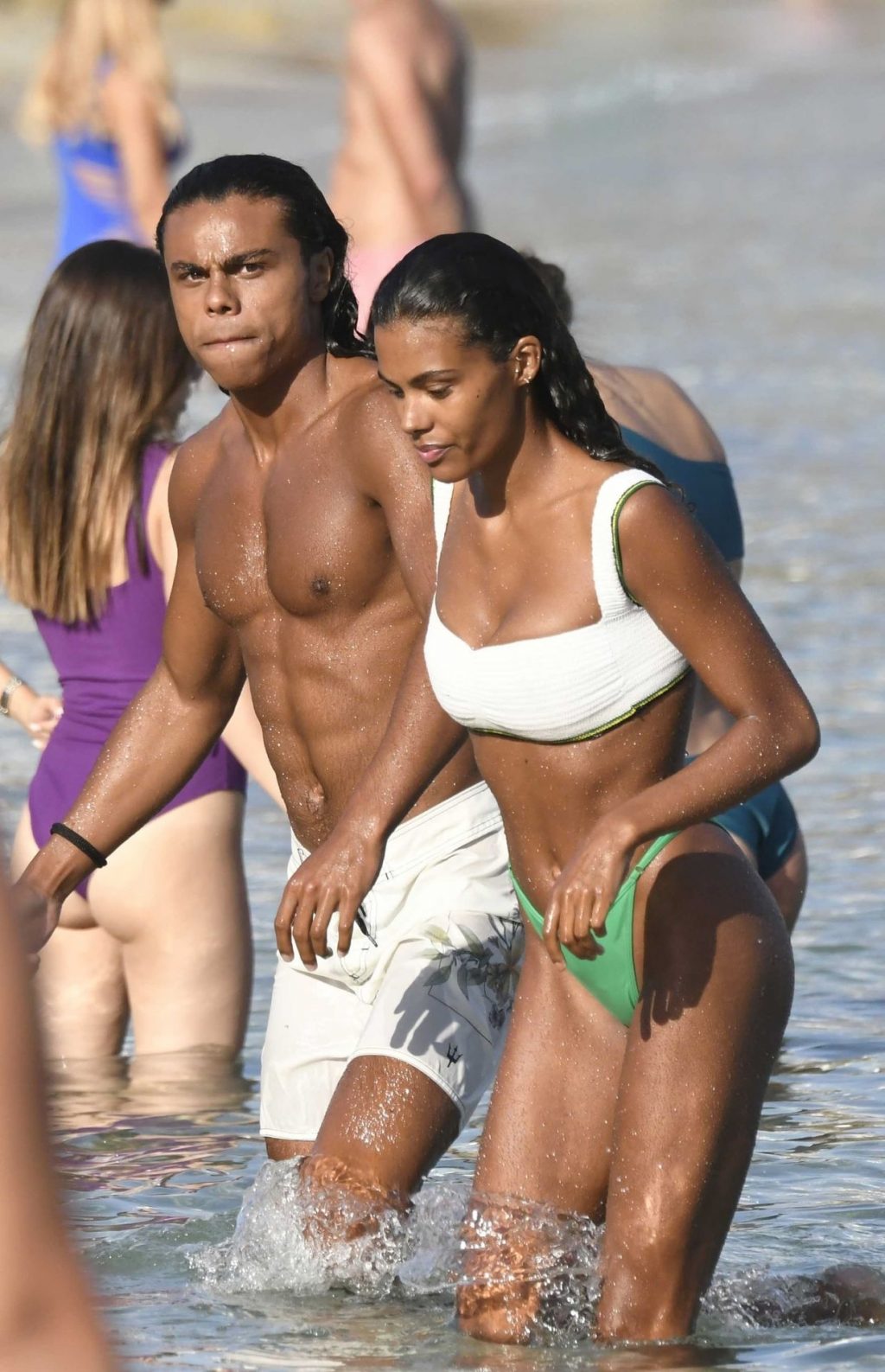 La fidanzata dell’attore francese Vincent Cassel, la modella francese Tina Kunakey, si gode la spiaggia indossando il suo succinto bikini verde, assaporando il sole greco durante una vacanza sull’isola di Mykonos, 08/06/2020.
