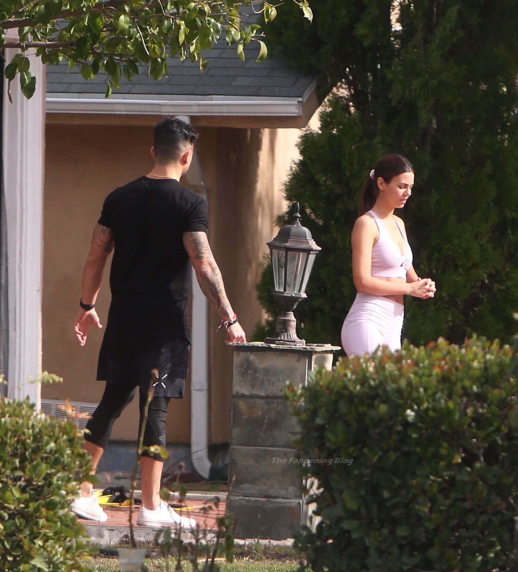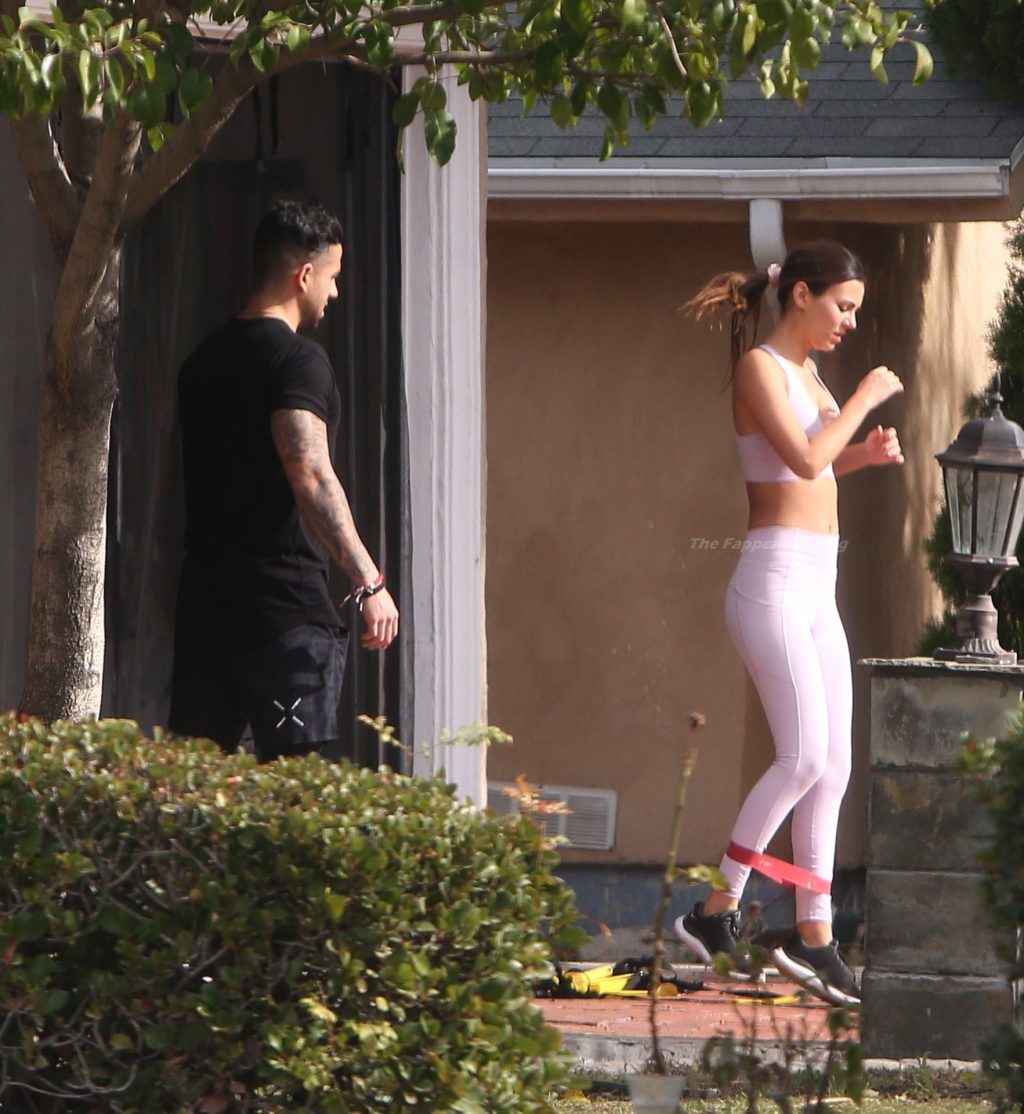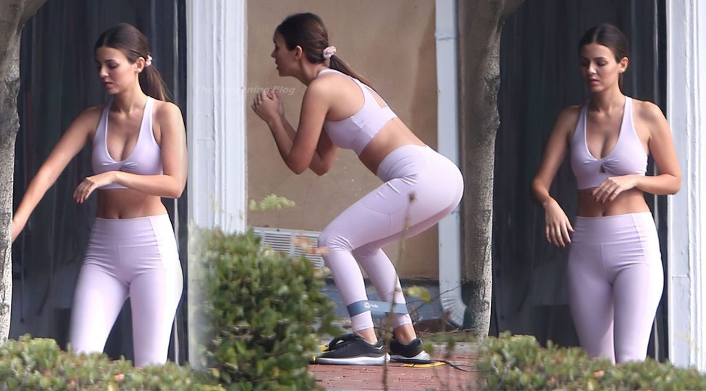 L’attrice americana e star di The Fappening Victoria Justice indossa leggings lilla abbinati e un reggiseno sportivo che valorizzano la figura mentre si allena con una fascia elastica durante il lockdown Covid-19 a Los Angeles, 25/01/2021.