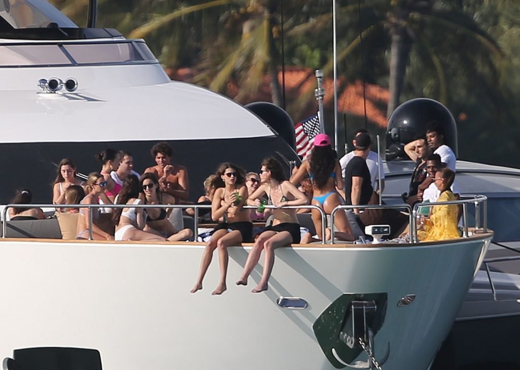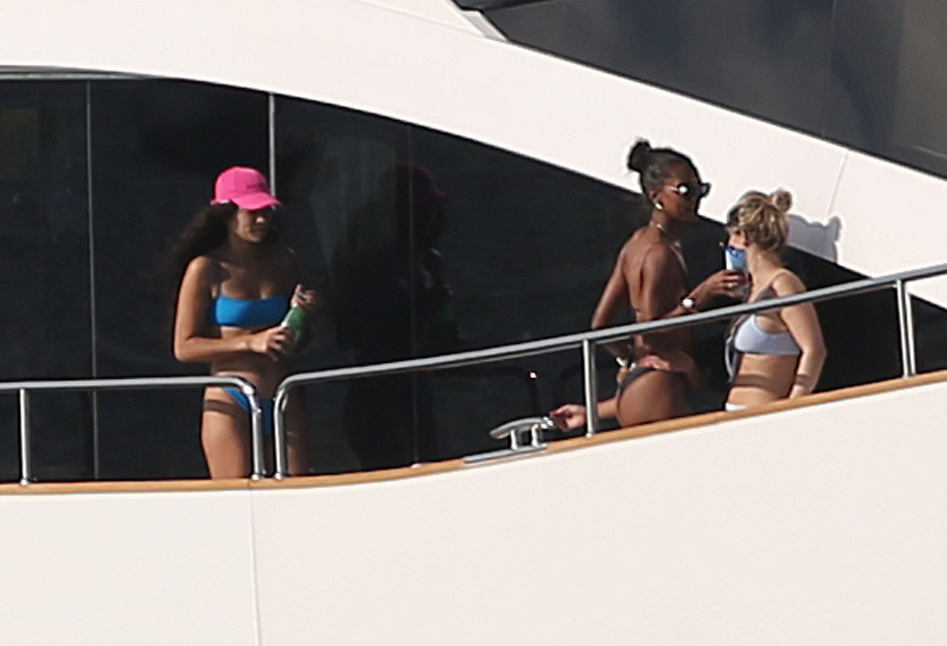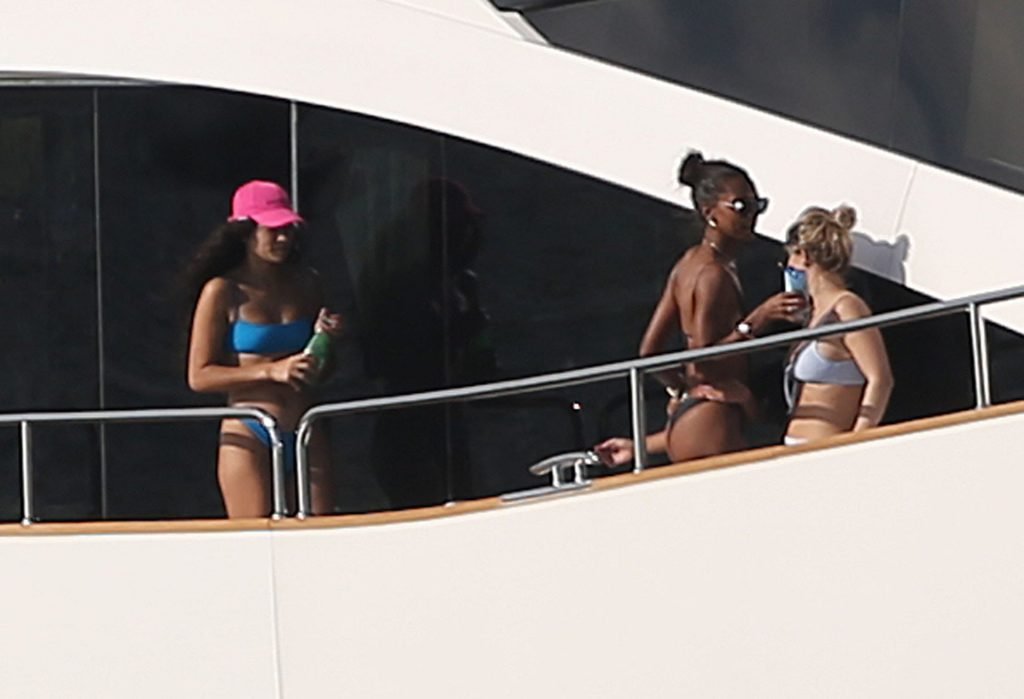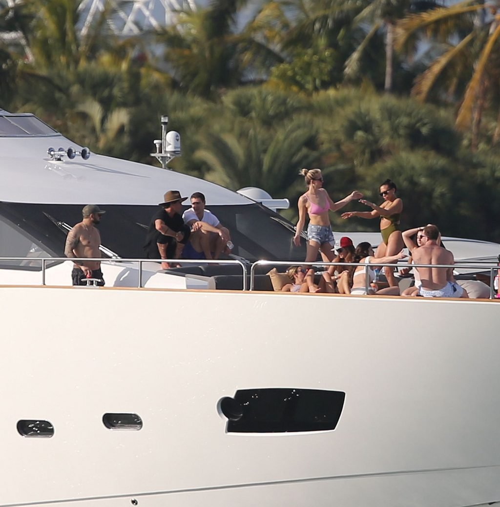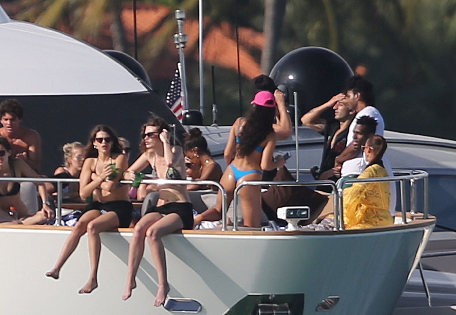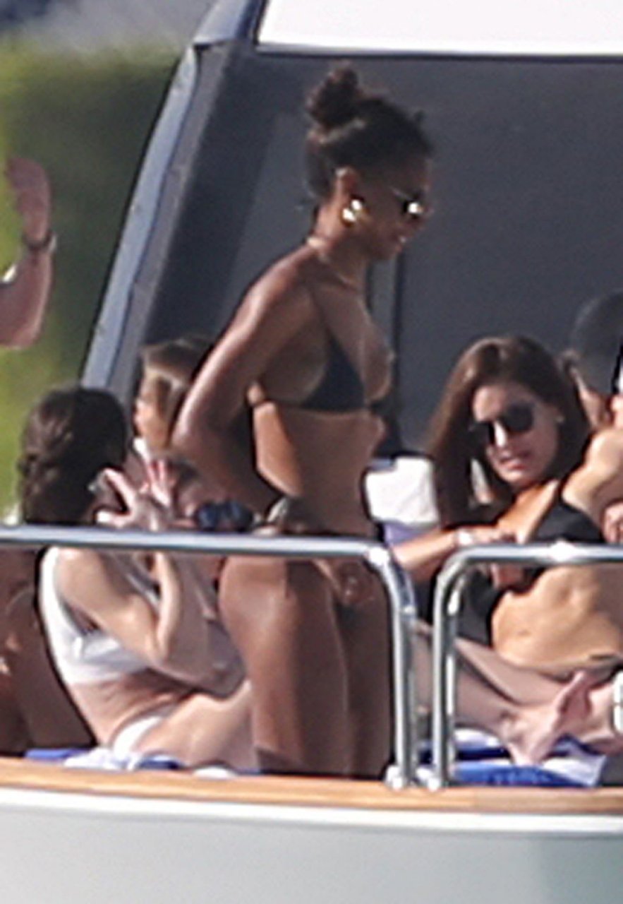 Models Jasmine Tookes (in bikini nero) e Shanina Shaik (in bikini blu) festeggiano il compleanno di Jasmine su uno yacht a Miami, 02/01/2019.
