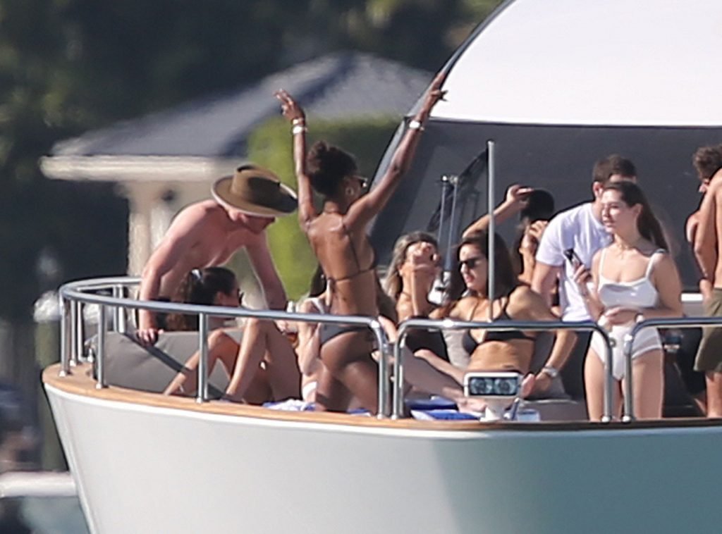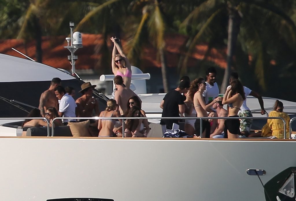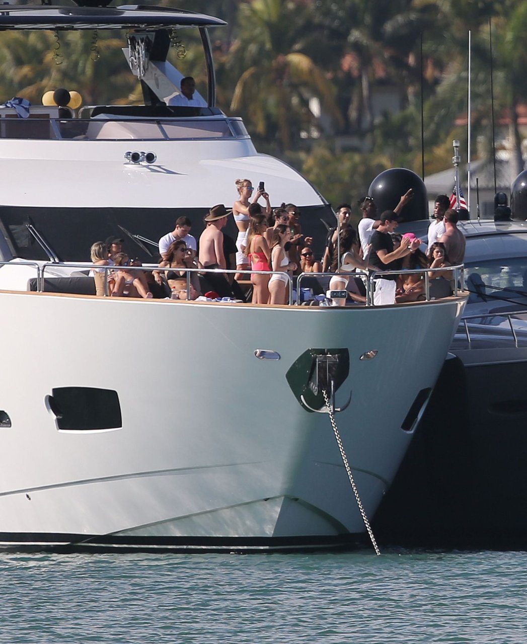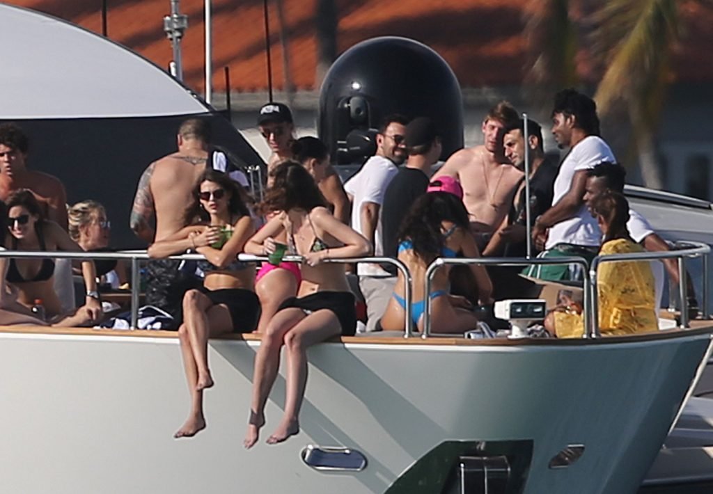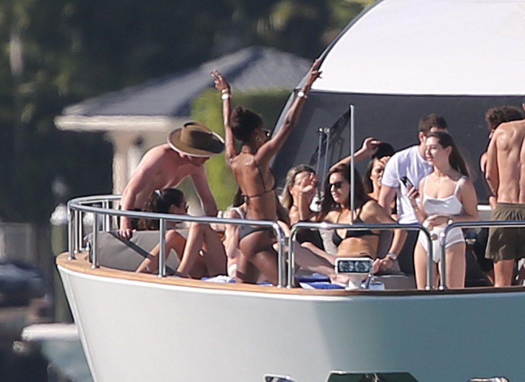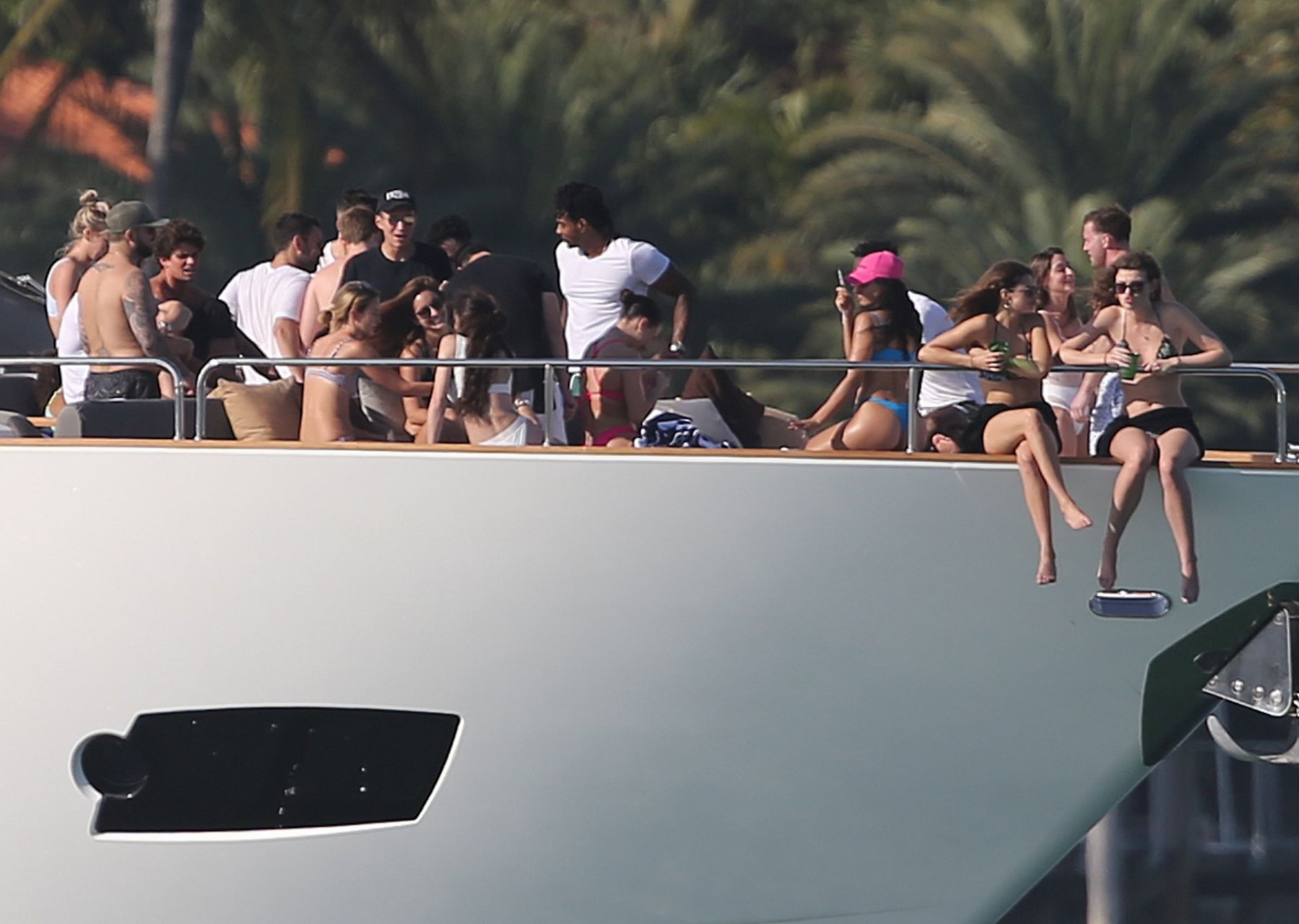 Models Jasmine Tookes (in bikini nero) e Shanina Shaik (in bikini blu) festeggiano il compleanno di Jasmine su uno yacht a Miami, 02/01/2019.