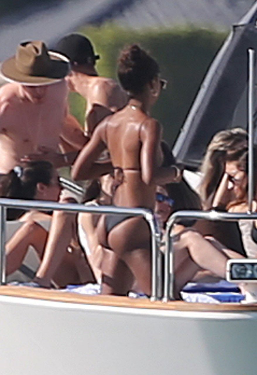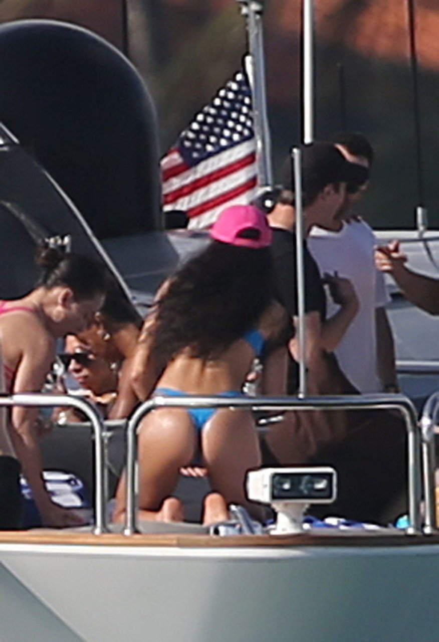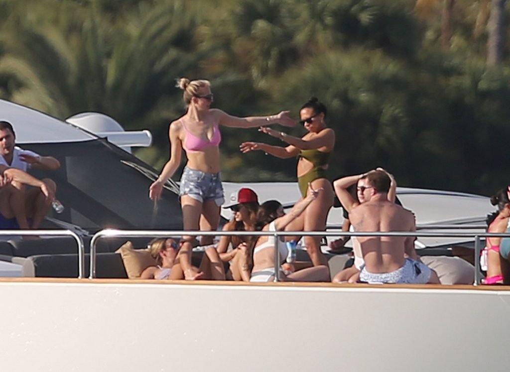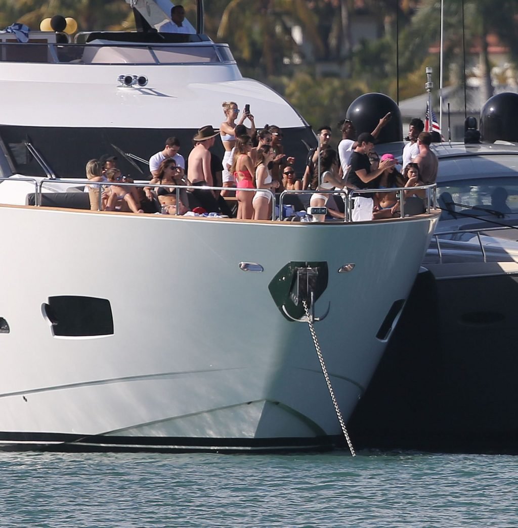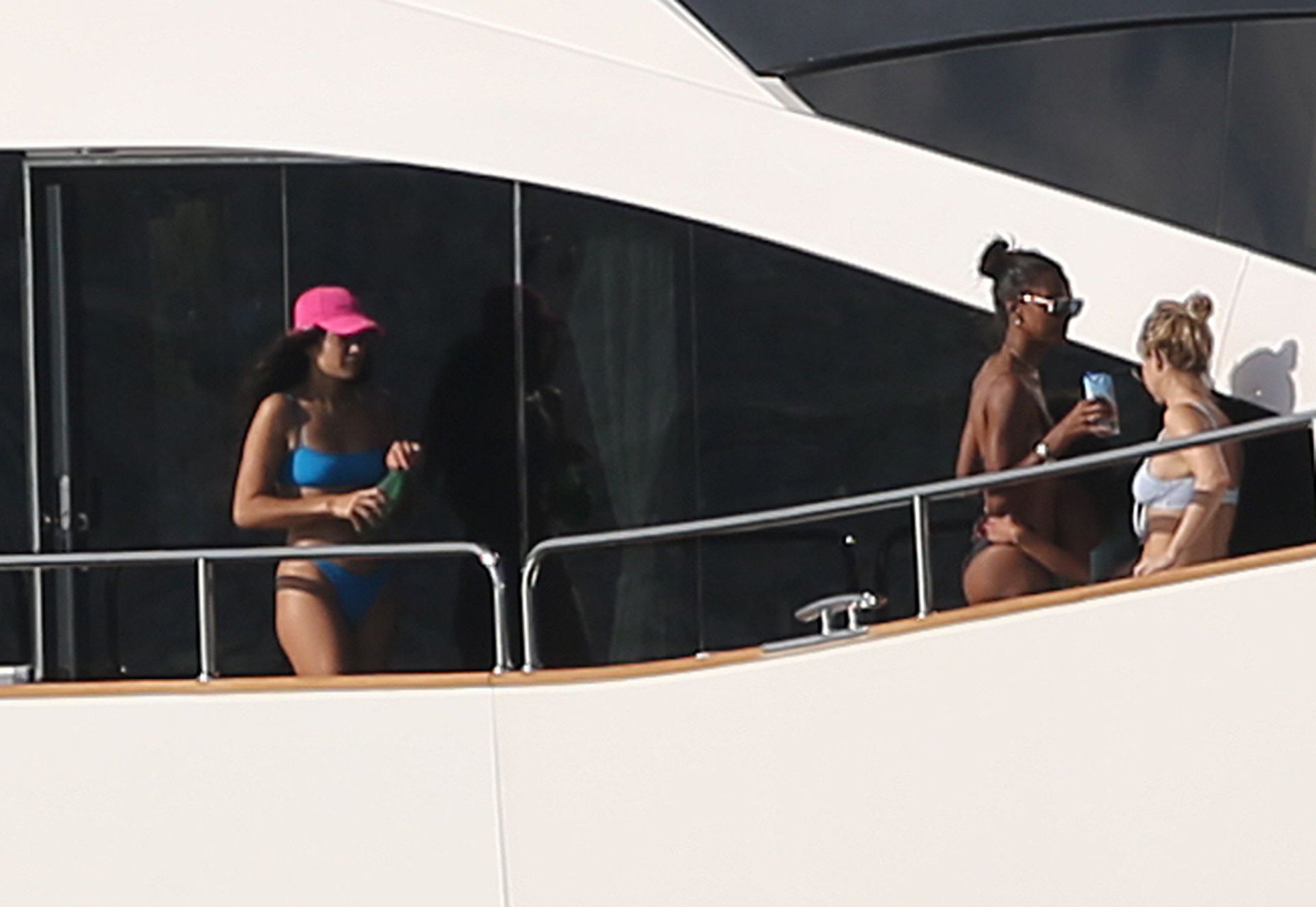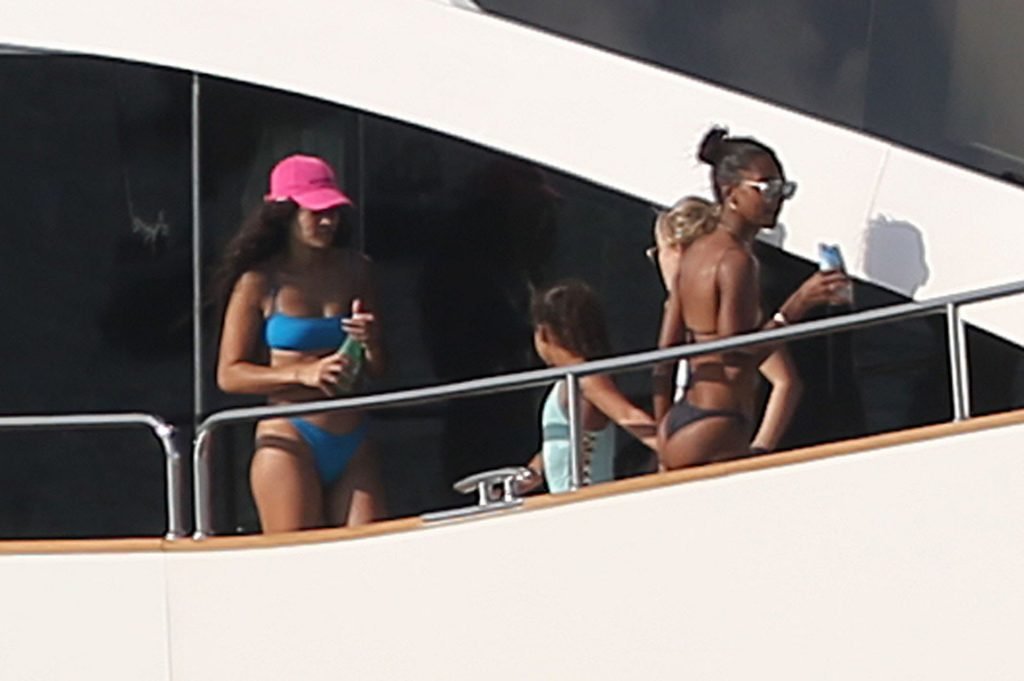 Models Jasmine Tookes (in bikini nero) e Shanina Shaik (in bikini blu) festeggiano il compleanno di Jasmine su uno yacht a Miami, 02/01/2019.