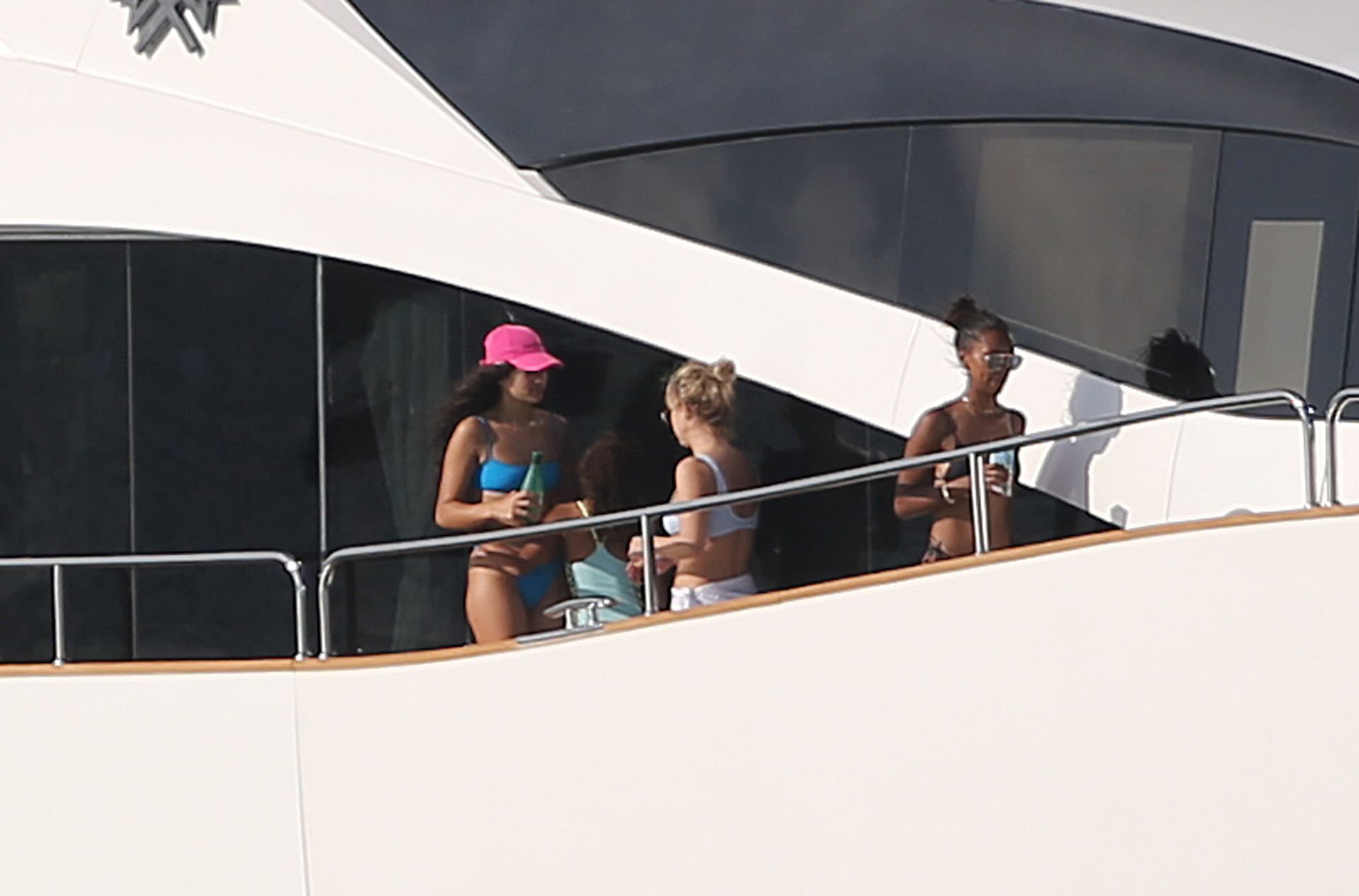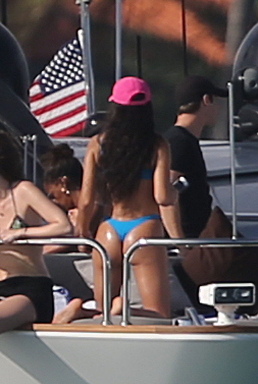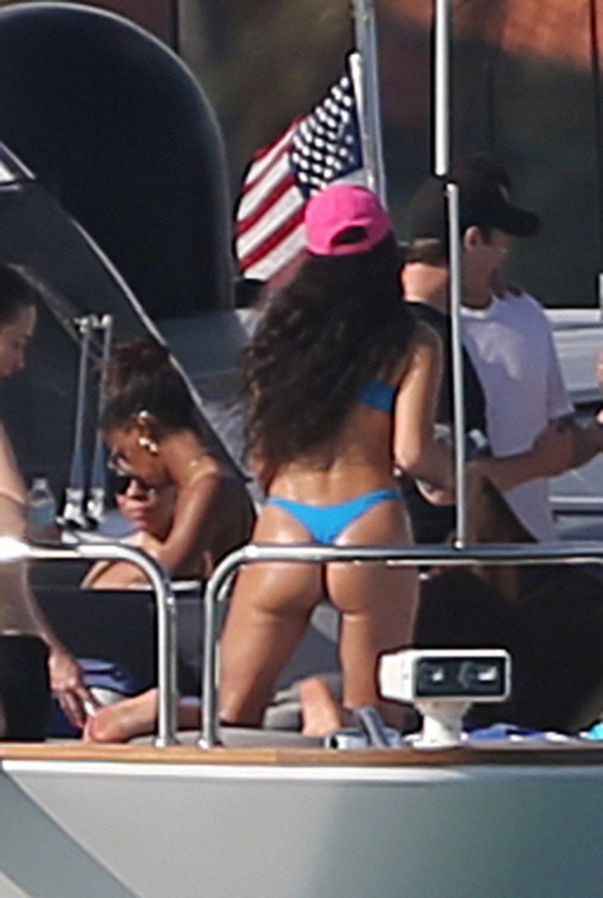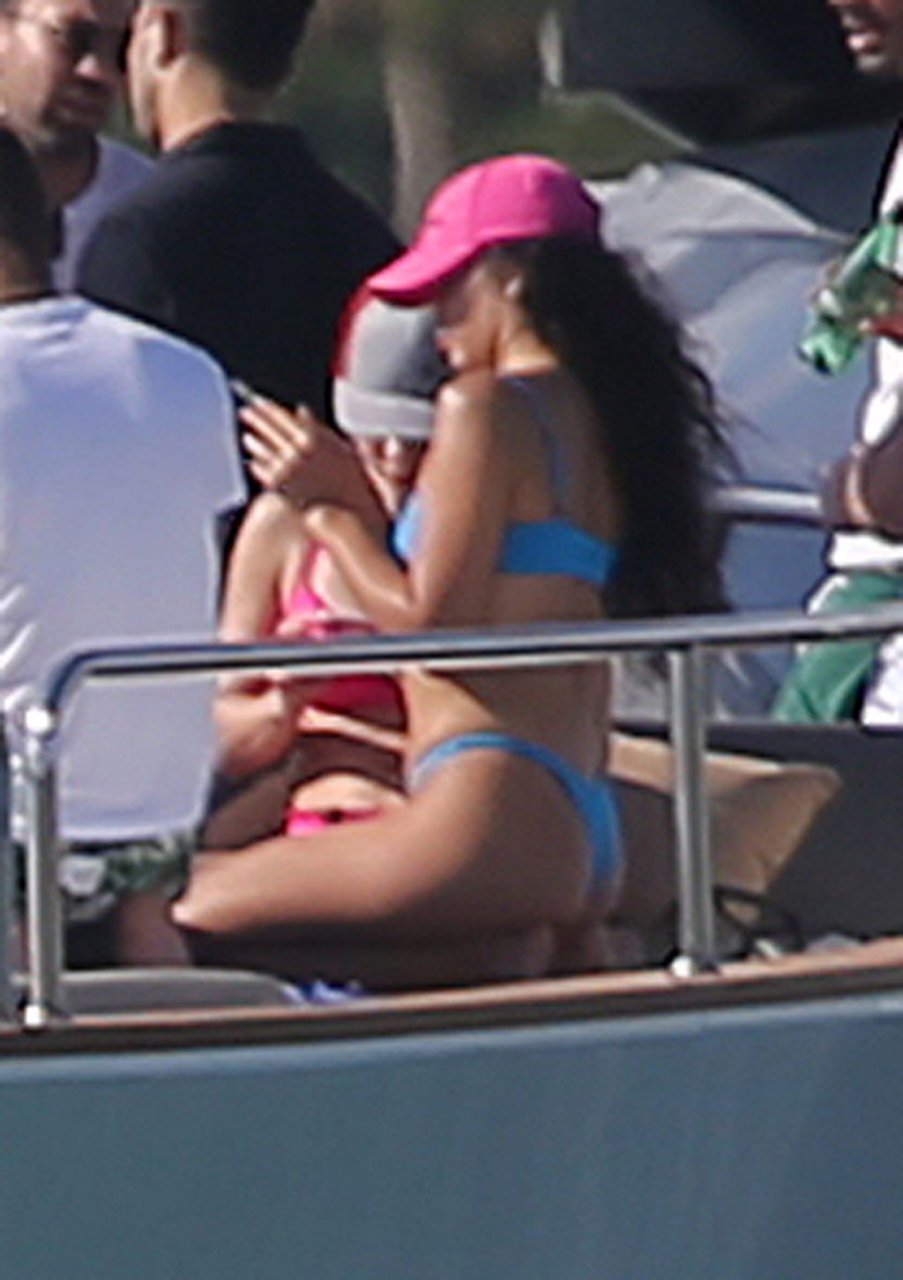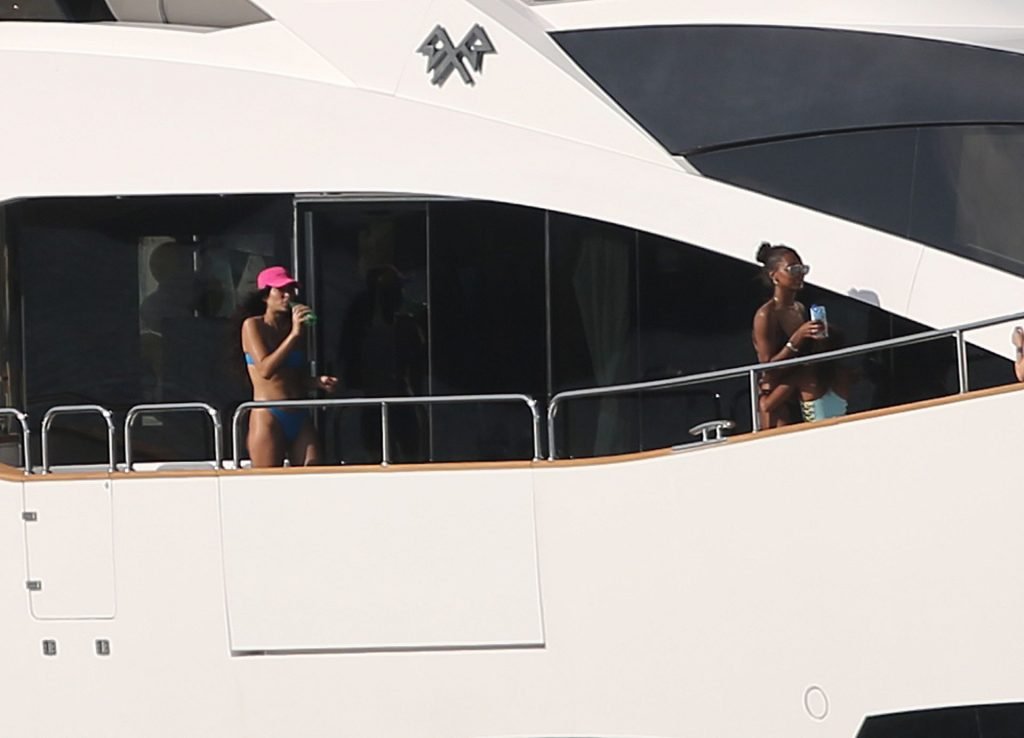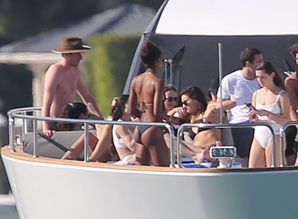 Models Jasmine Tookes (in bikini nero) e Shanina Shaik (in bikini blu) festeggiano il compleanno di Jasmine su uno yacht a Miami, 02/01/2019.