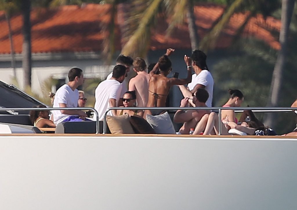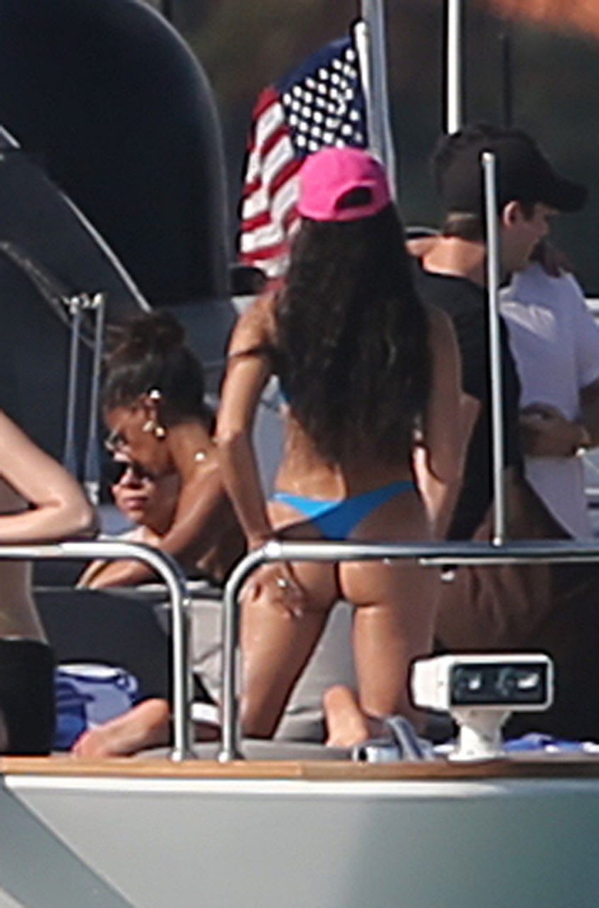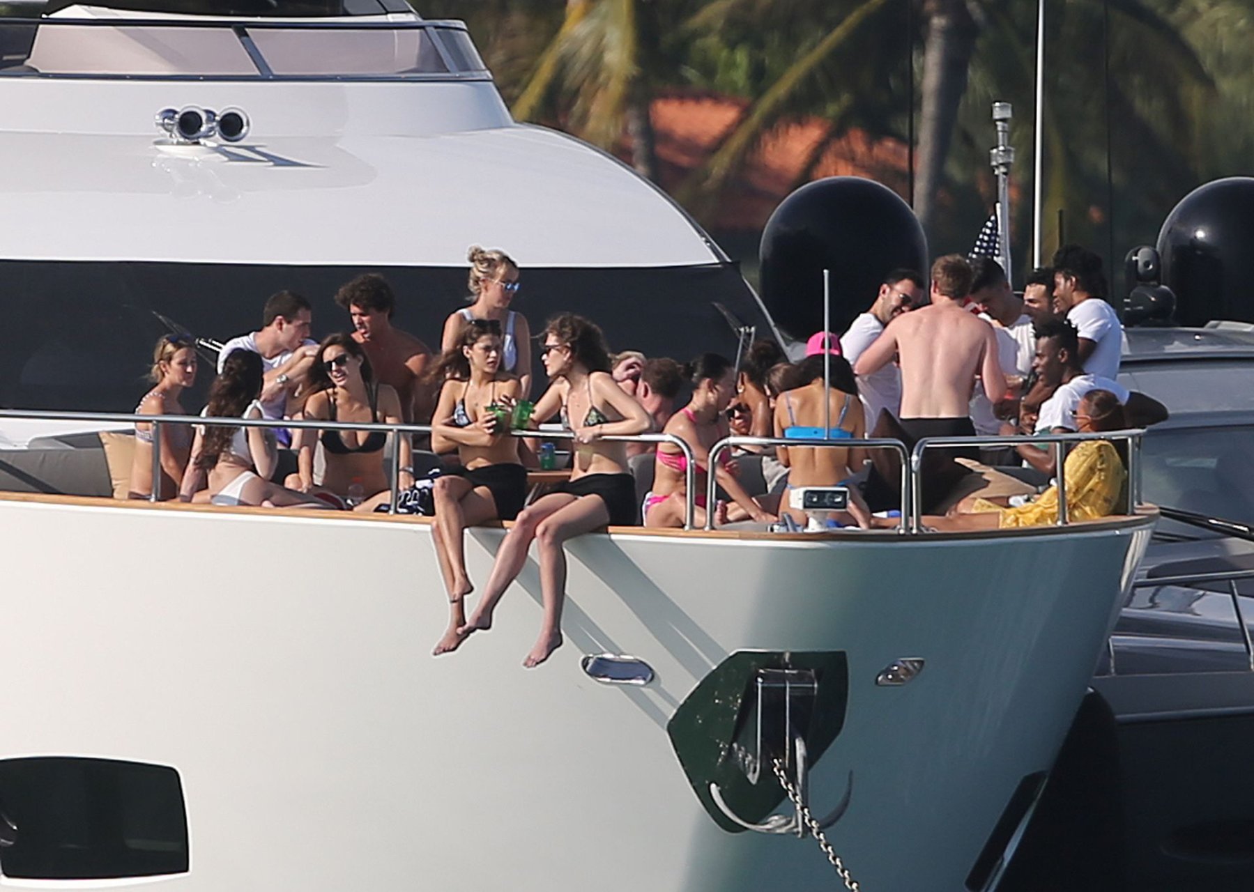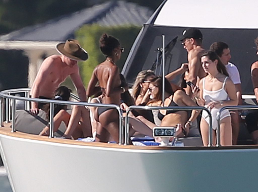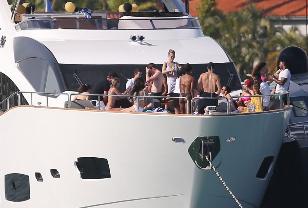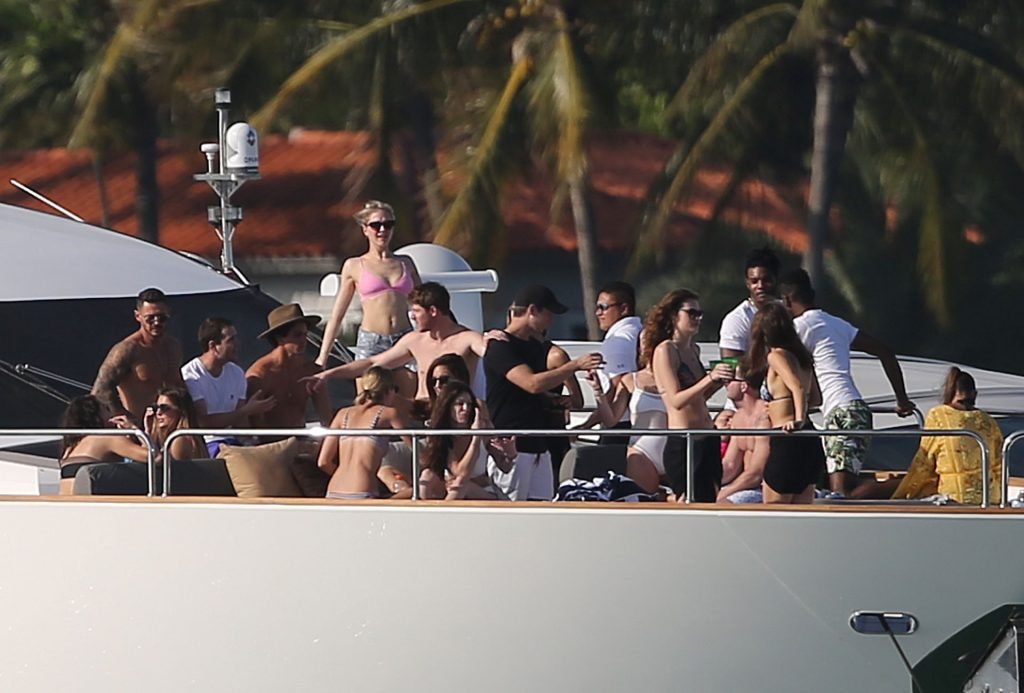 Models Jasmine Tookes (in bikini nero) e Shanina Shaik (in bikini blu) festeggiano il compleanno di Jasmine su uno yacht a Miami, 02/01/2019.