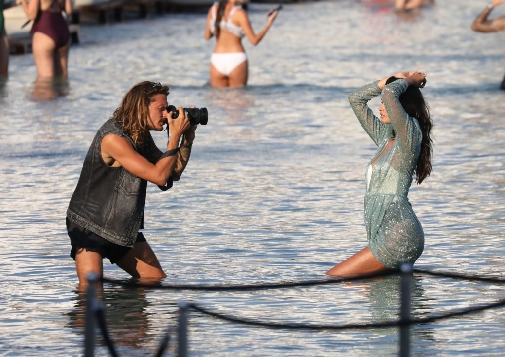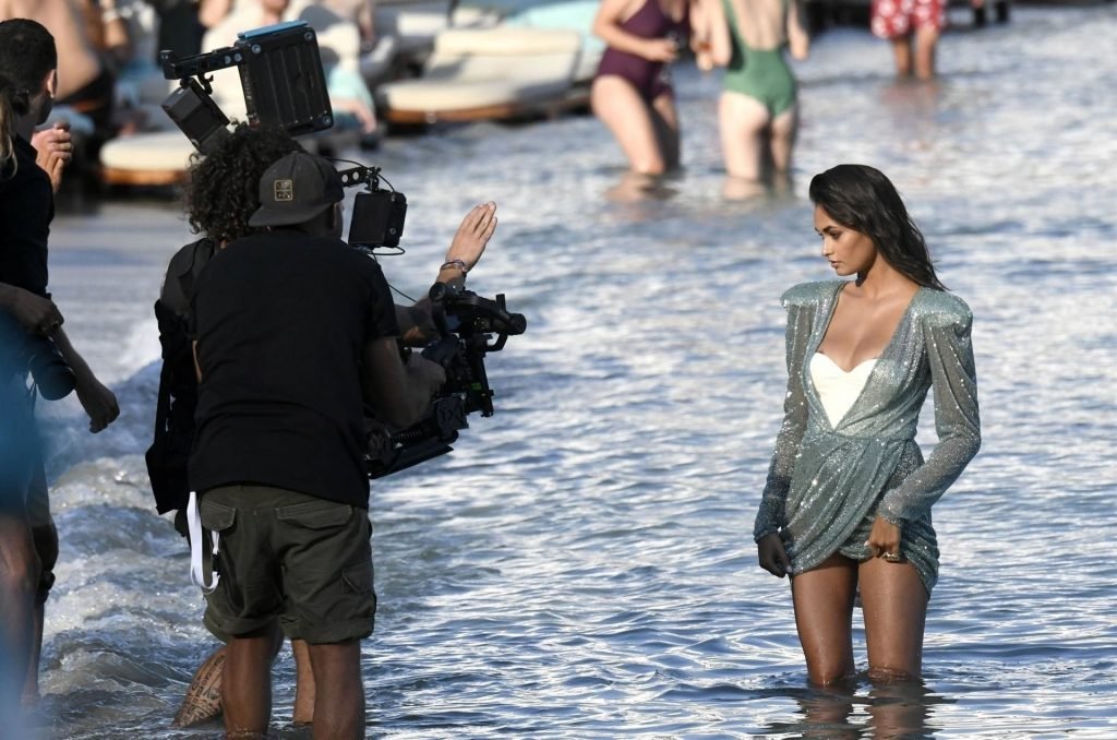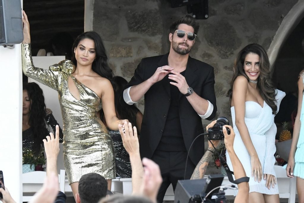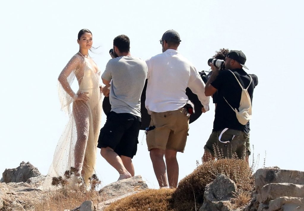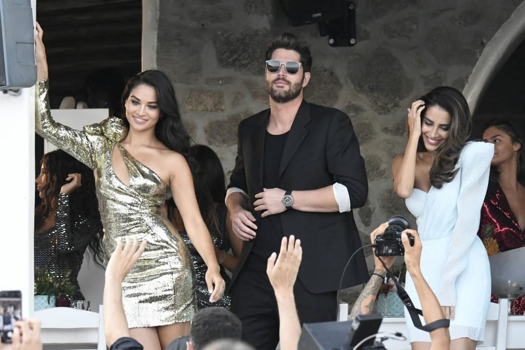 Modelli di lingerie sexy Shanina Shaik, Gizele Oliveira e Jessica Kahawaty con l’attore canadese Nick Bateman che sfoggiano il loro stile mentre girano in varie location con diversi outfit sexy durante le riprese di un video commerciale sulla spiaggia di Psarou, Nammos a Mykonos, 09/05/2019.
