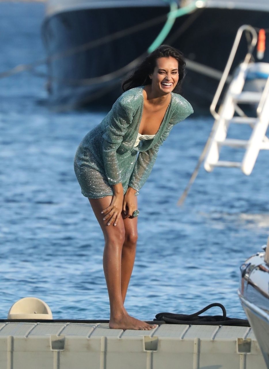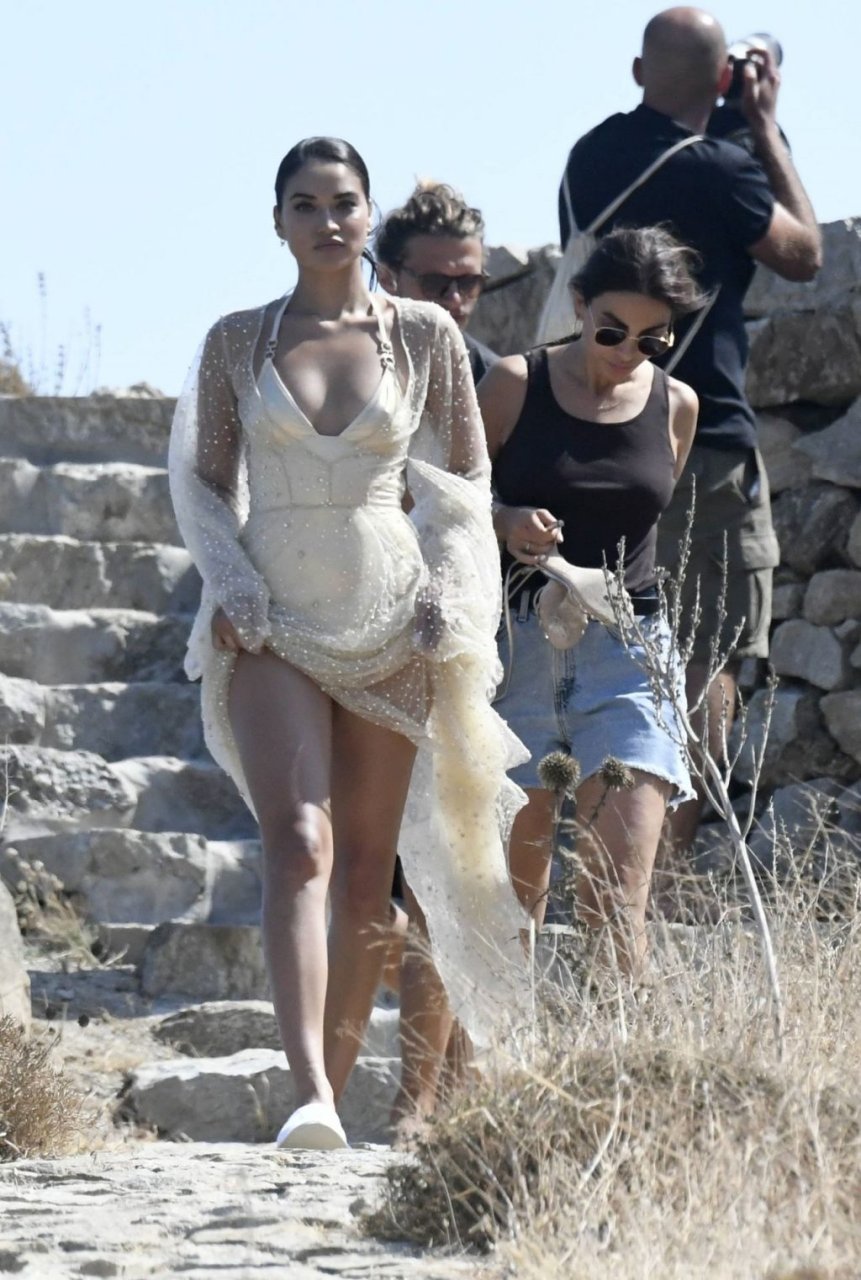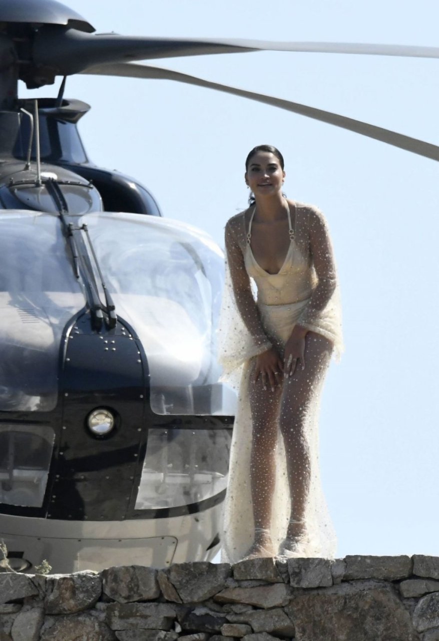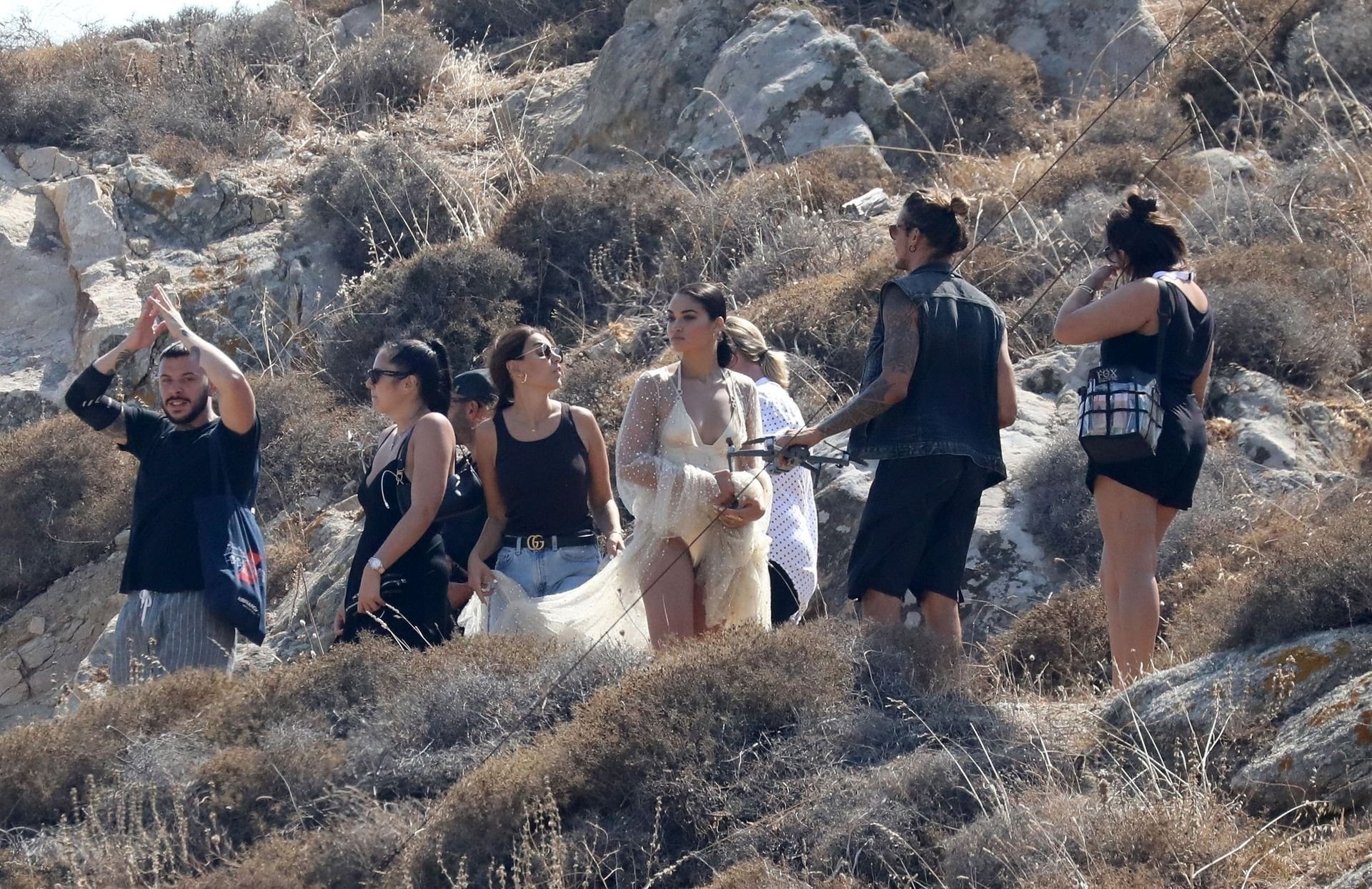 Modelli di lingerie sexy Shanina Shaik, Gizele Oliveira e Jessica Kahawaty con l’attore canadese Nick Bateman che sfoggiano il loro stile mentre girano in varie location con diversi outfit sexy durante le riprese di un video commerciale sulla spiaggia di Psarou, Nammos a Mykonos, 09/05/2019.