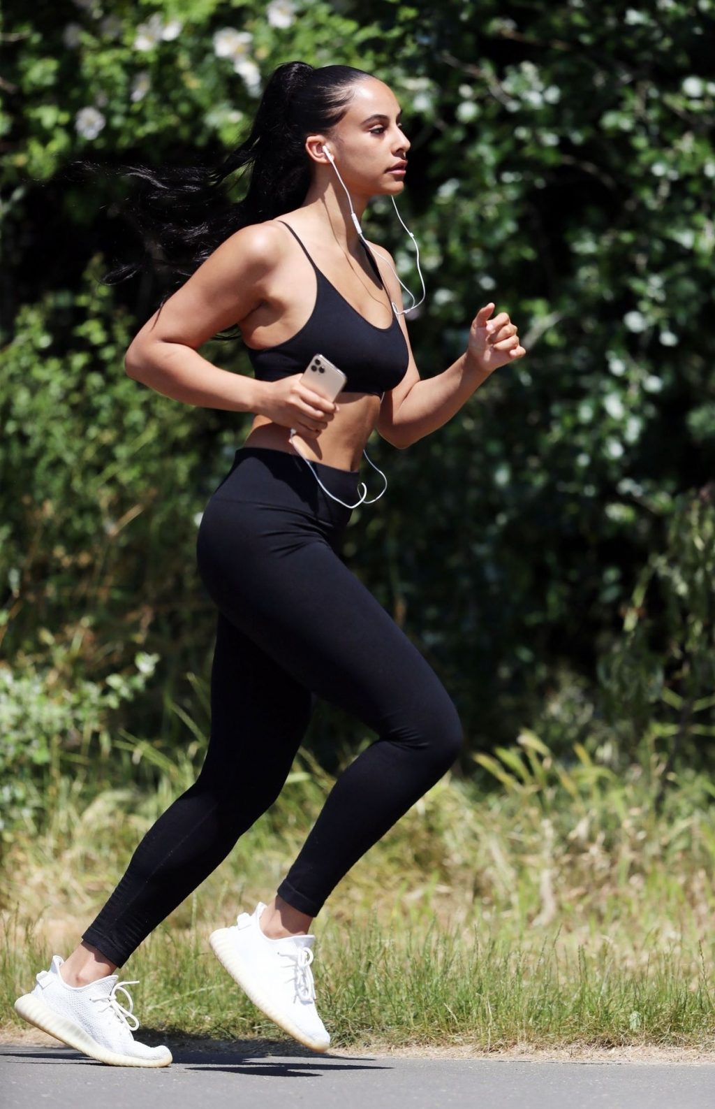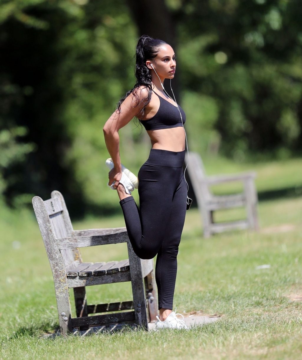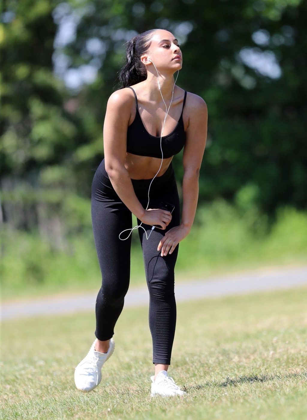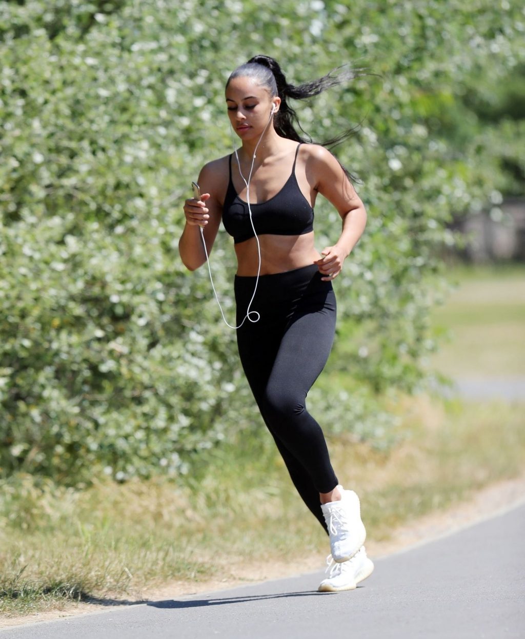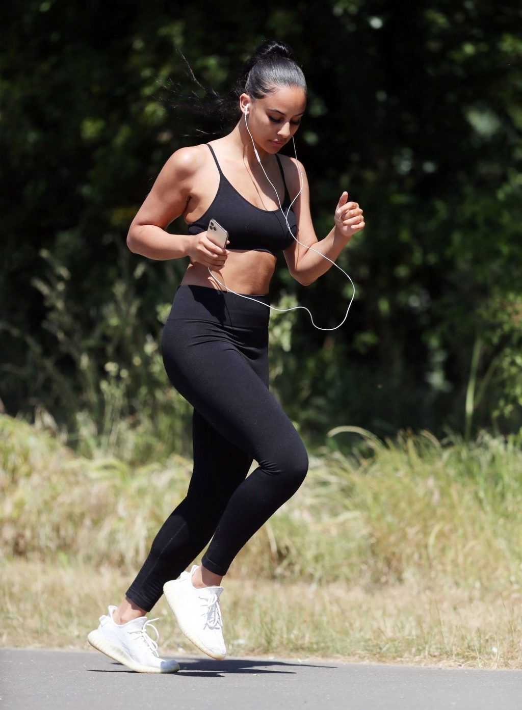 La super atletica modella Shari Halliday è stata fotografata mentre sudava sotto il caldo durante una passeggiata in un parco di Londra, 06/02/2020.