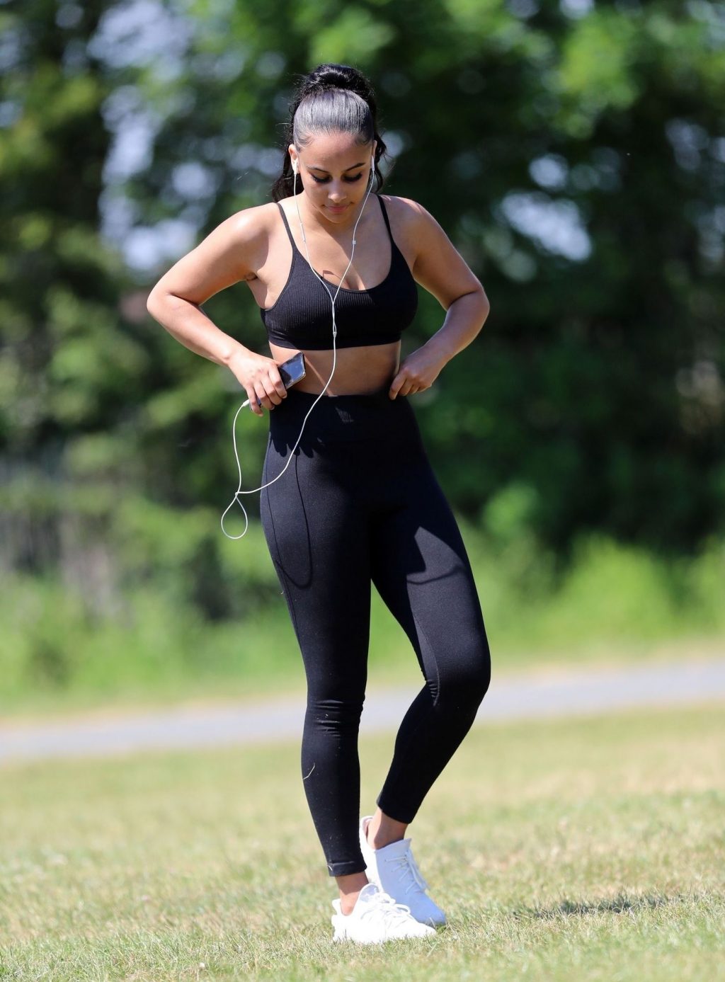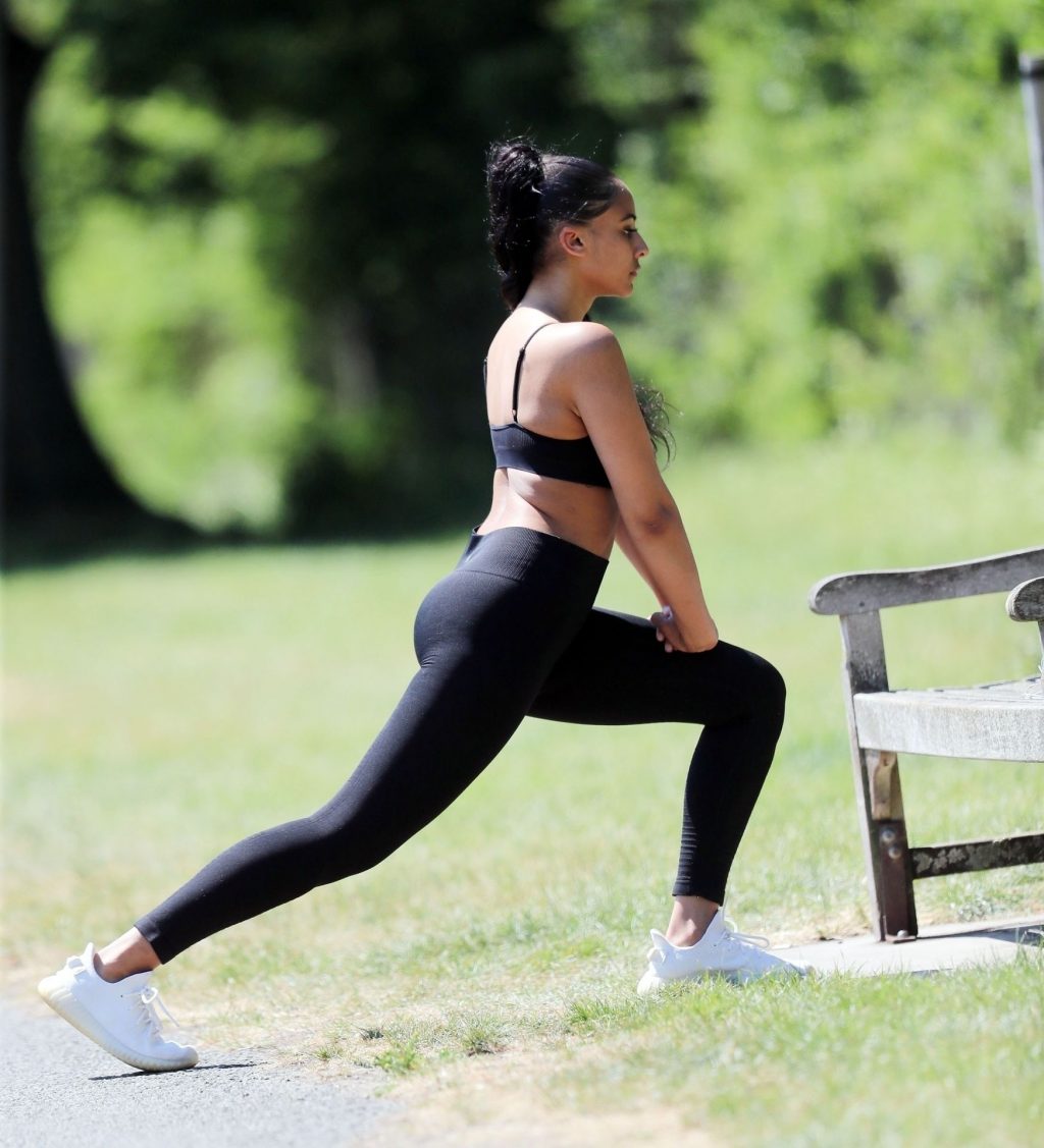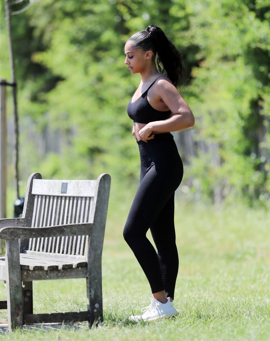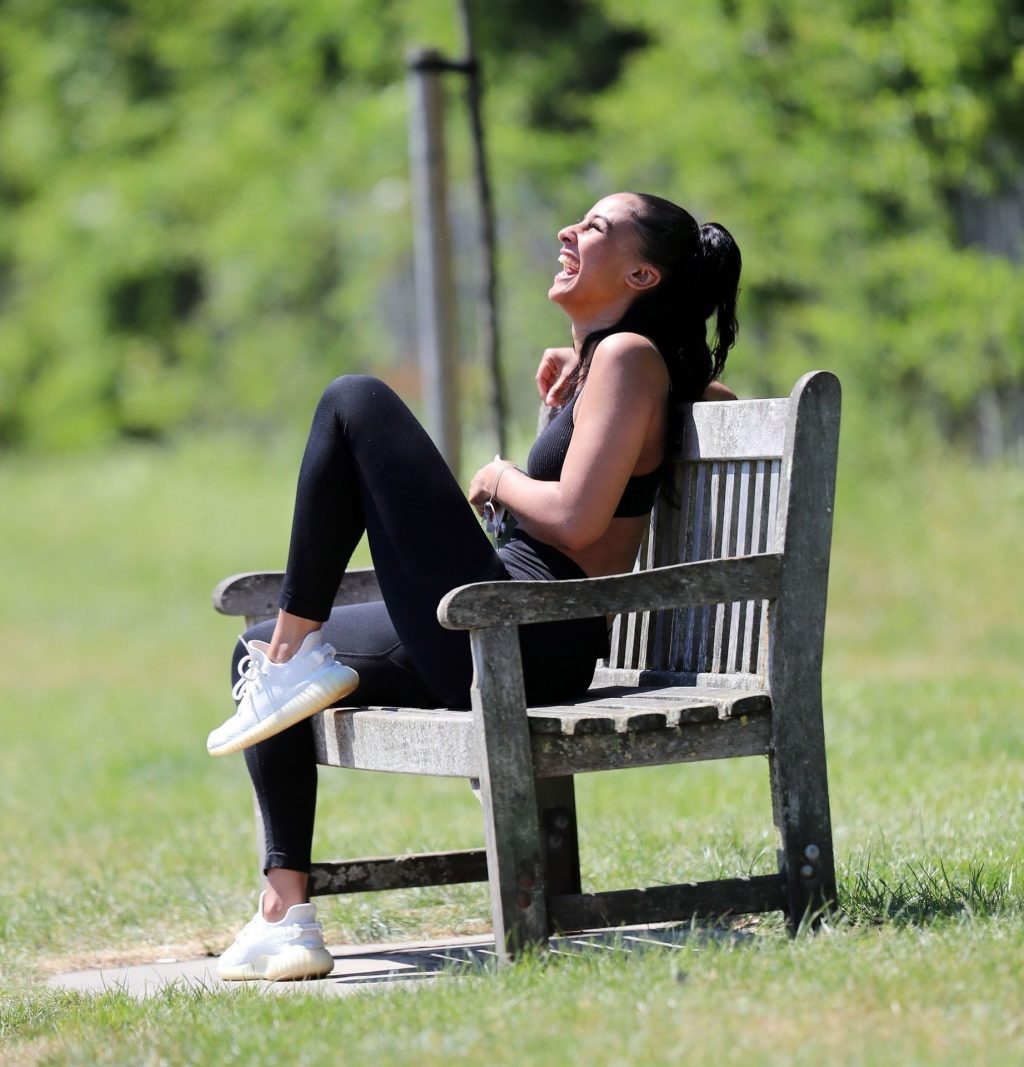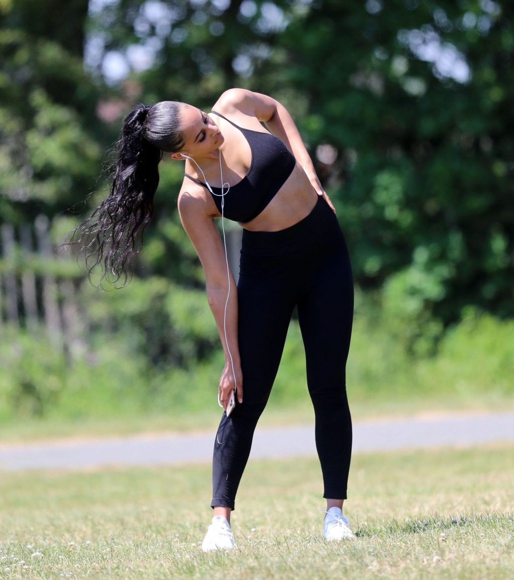 La super atletica modella Shari Halliday è stata fotografata mentre sudava sotto il caldo durante una passeggiata in un parco di Londra, 06/02/2020.