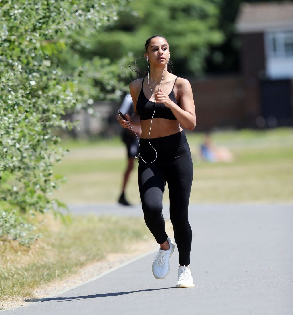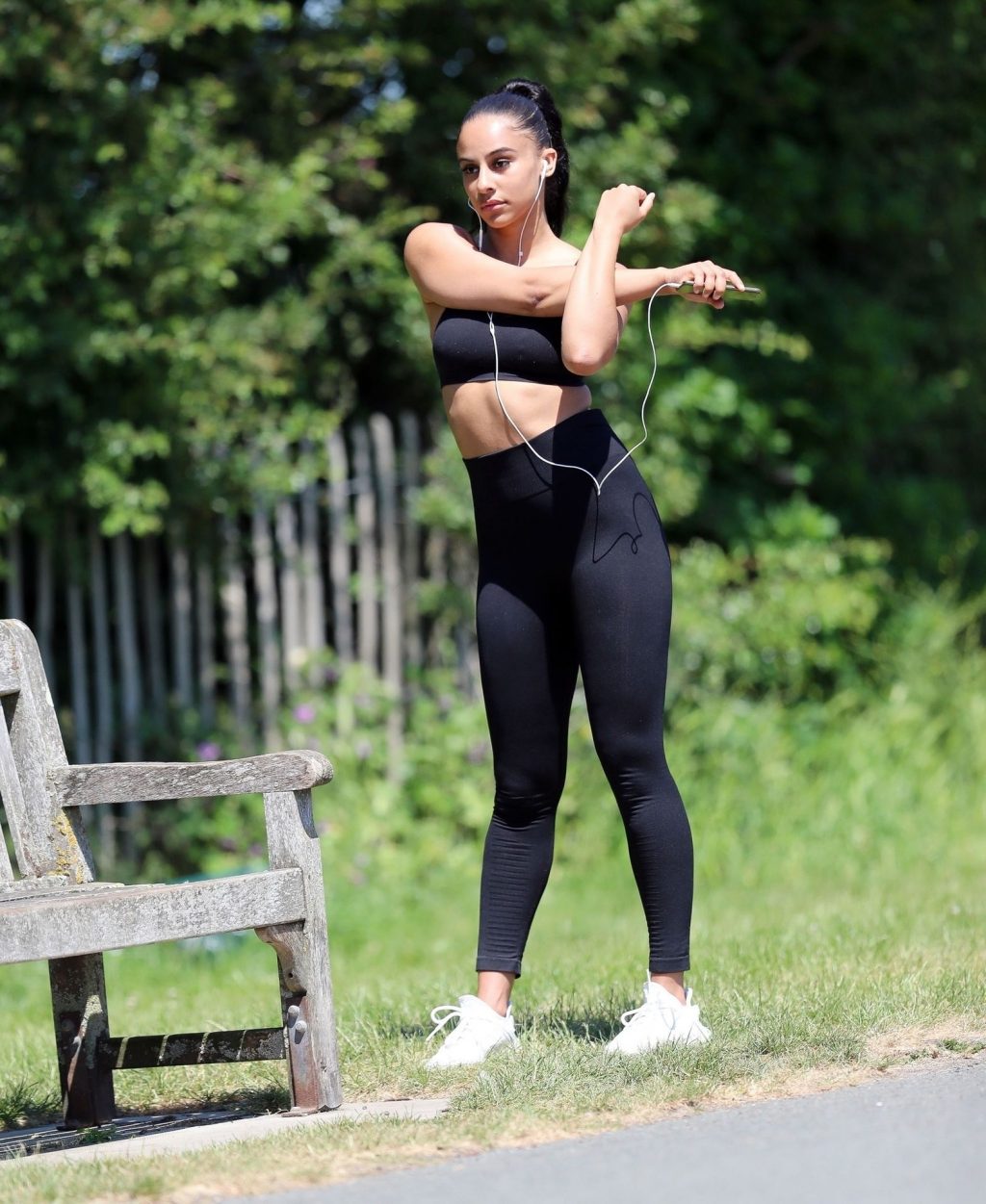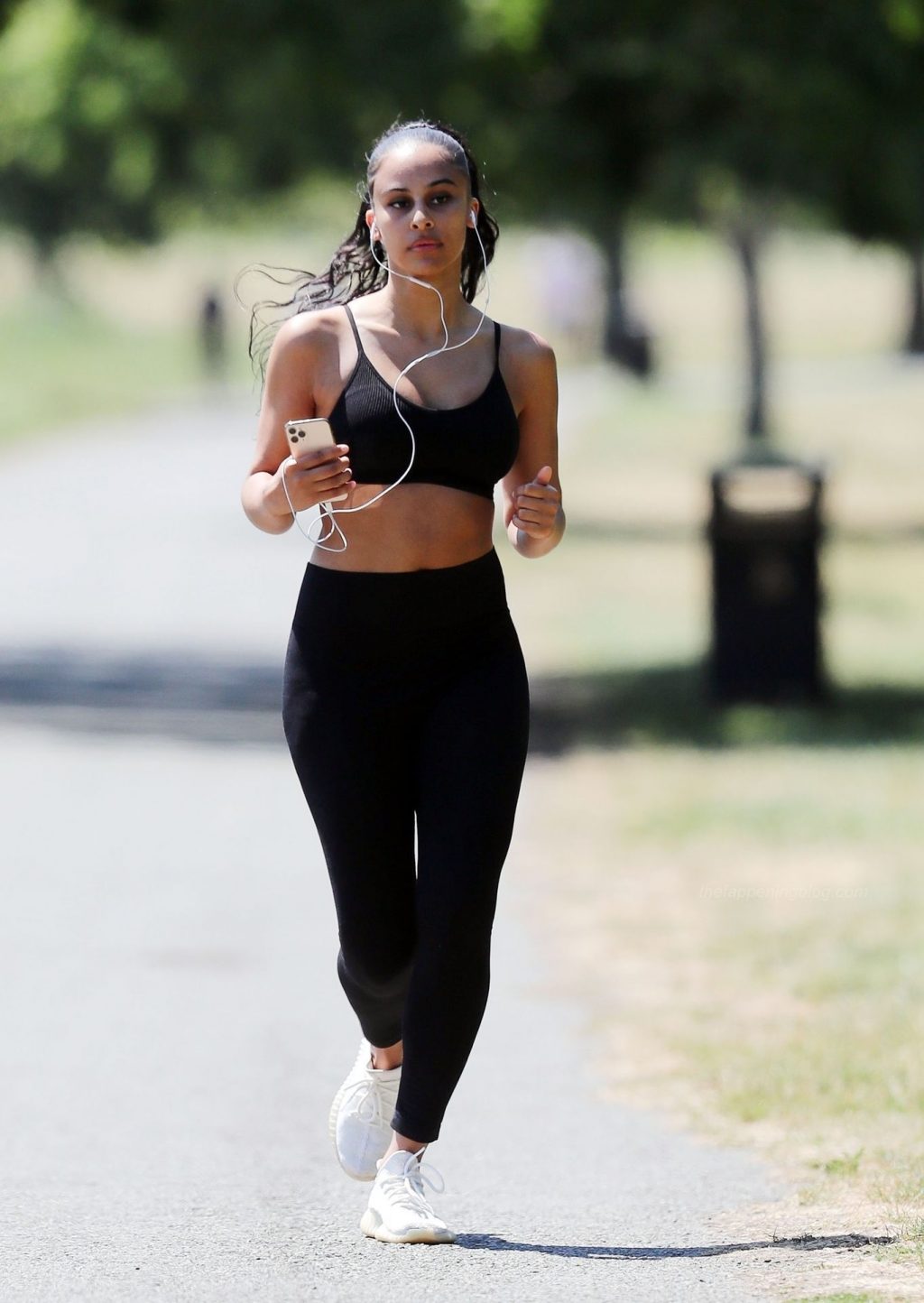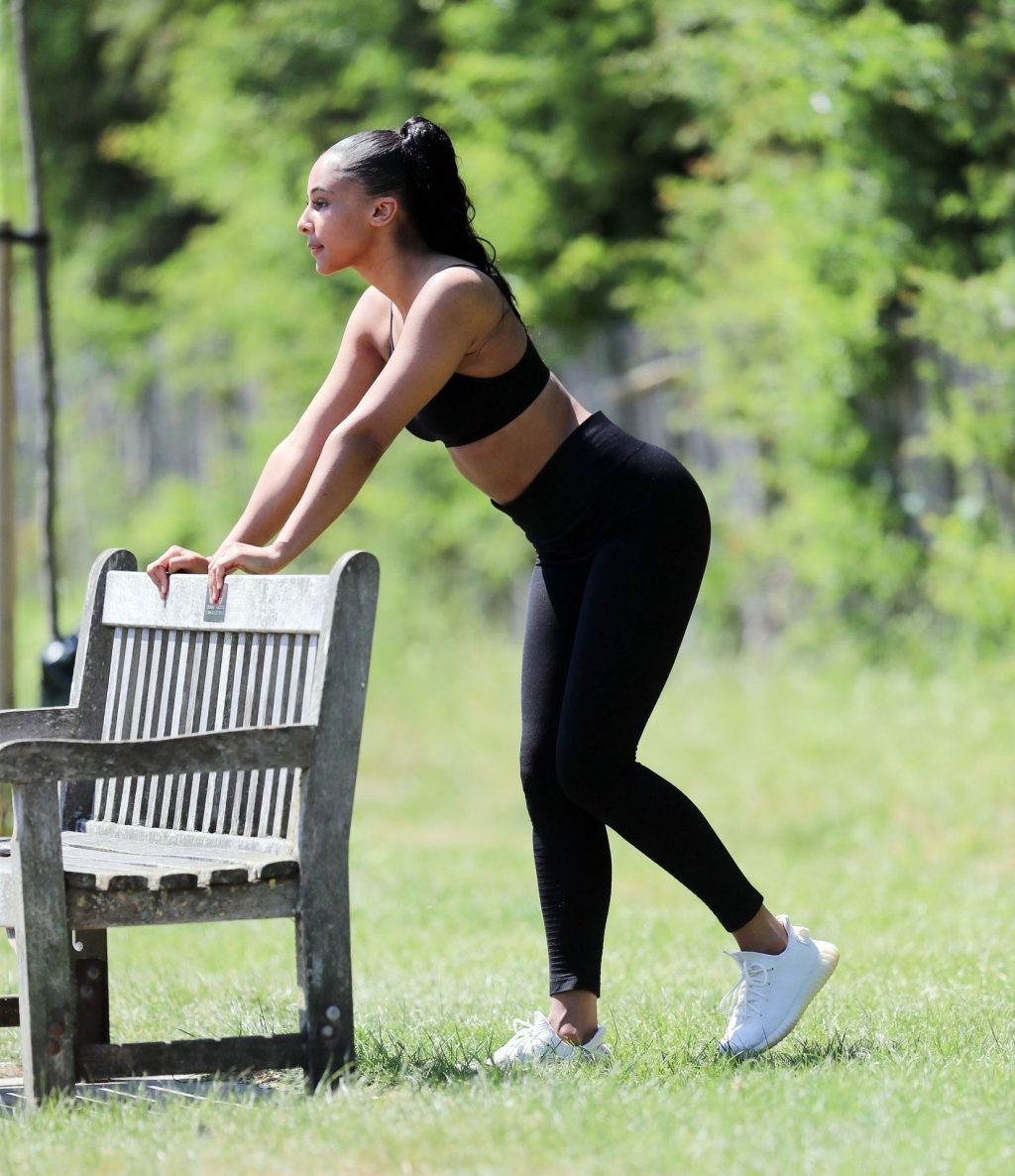 La super atletica modella Shari Halliday è stata fotografata mentre sudava sotto il caldo durante una passeggiata in un parco di Londra, 06/02/2020.