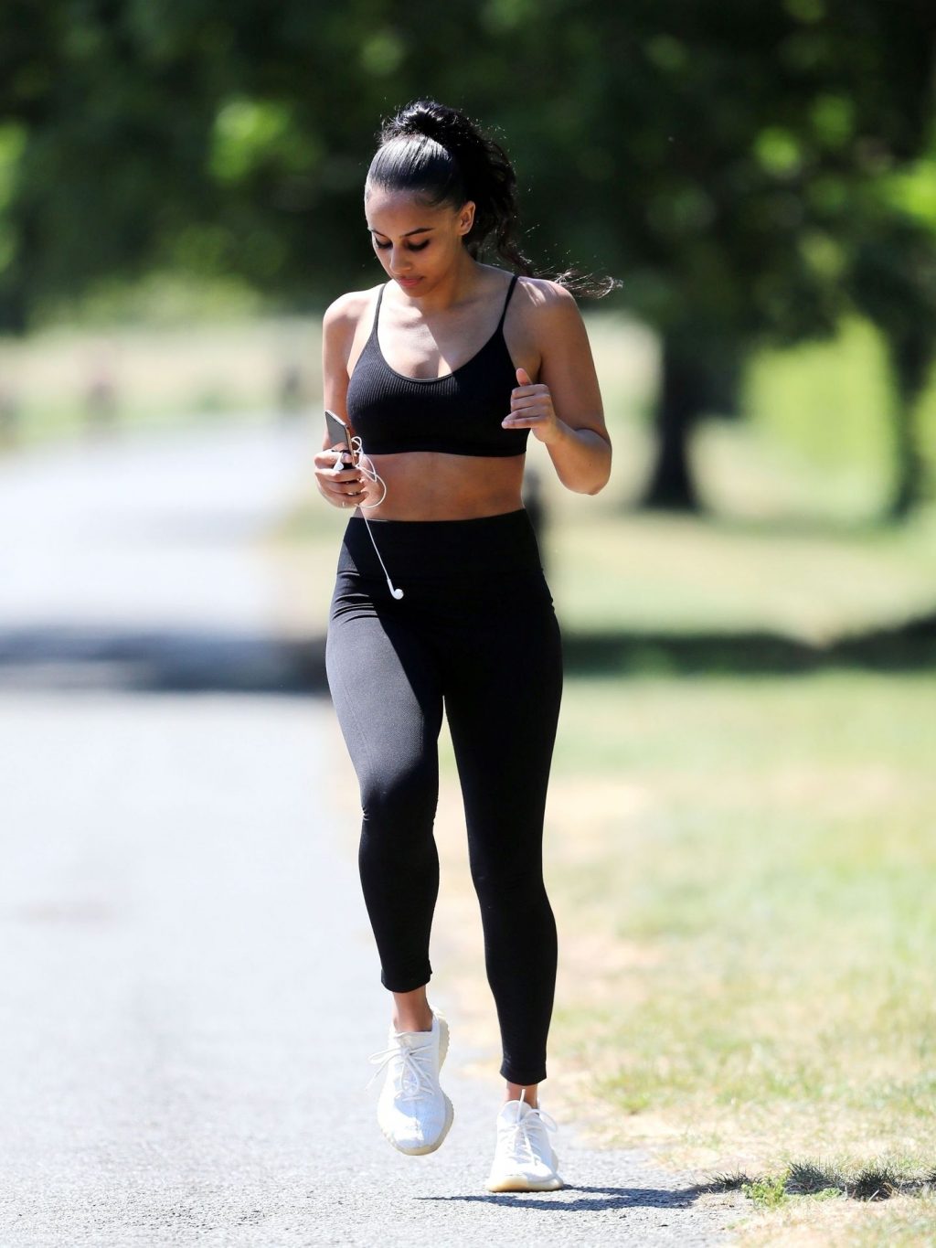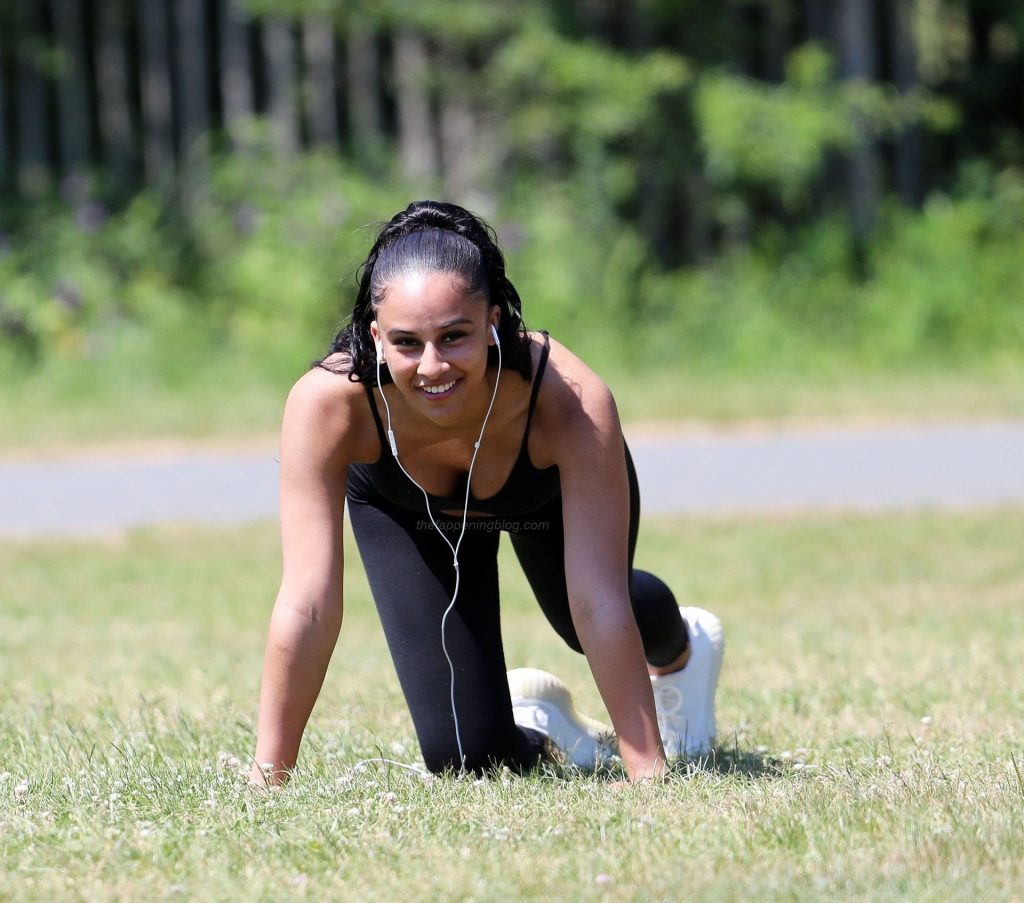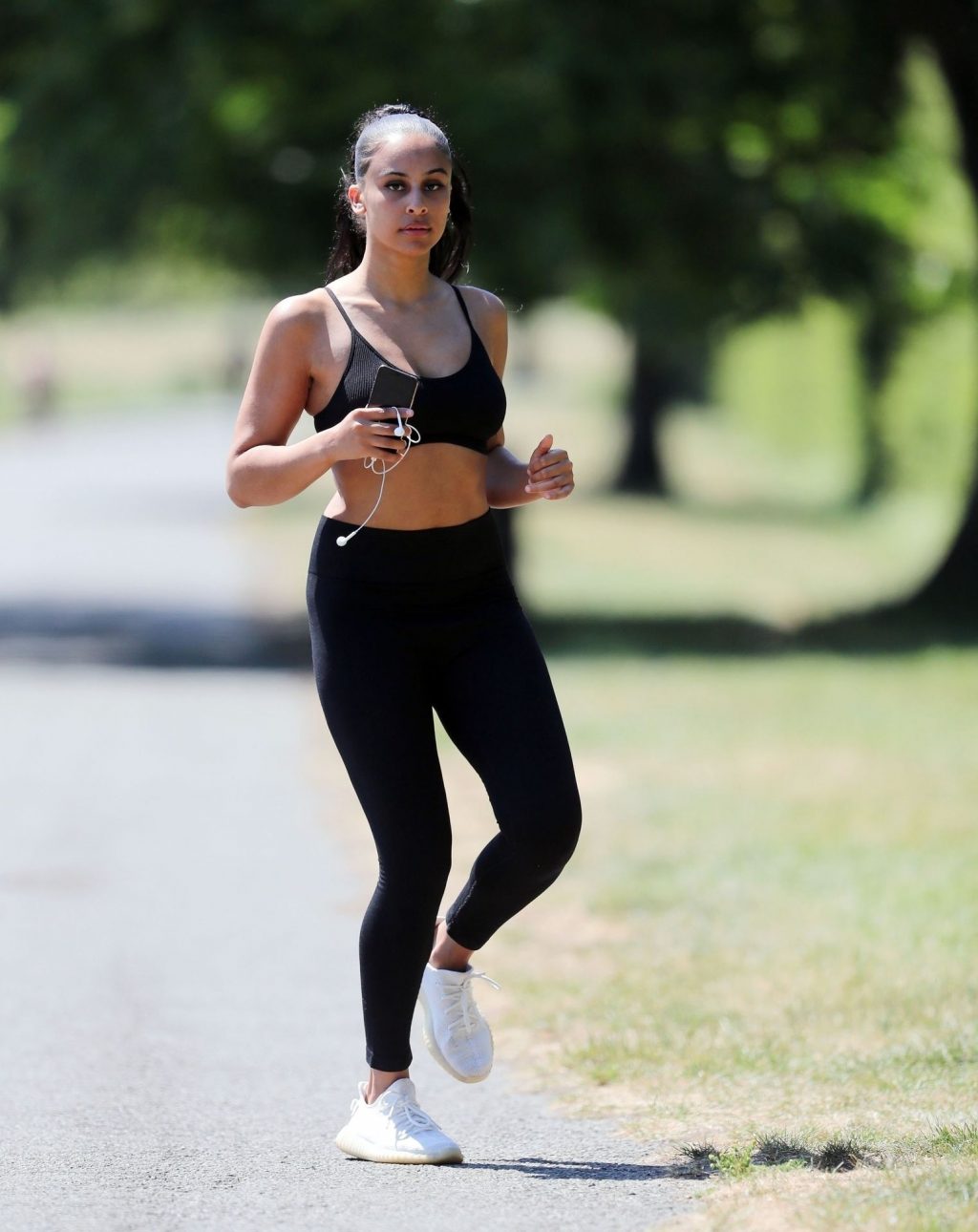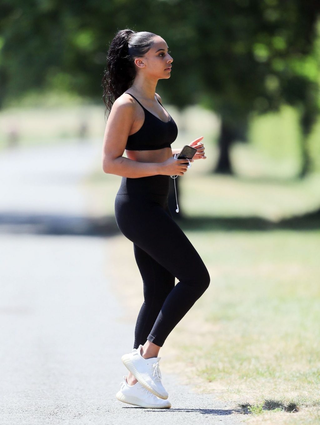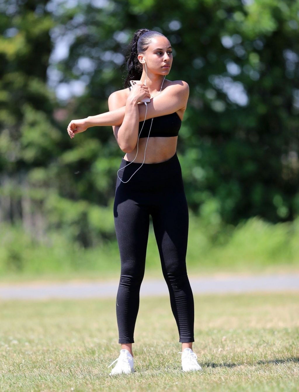 La super atletica modella Shari Halliday è stata fotografata mentre sudava sotto il caldo durante una passeggiata in un parco di Londra, 06/02/2020.