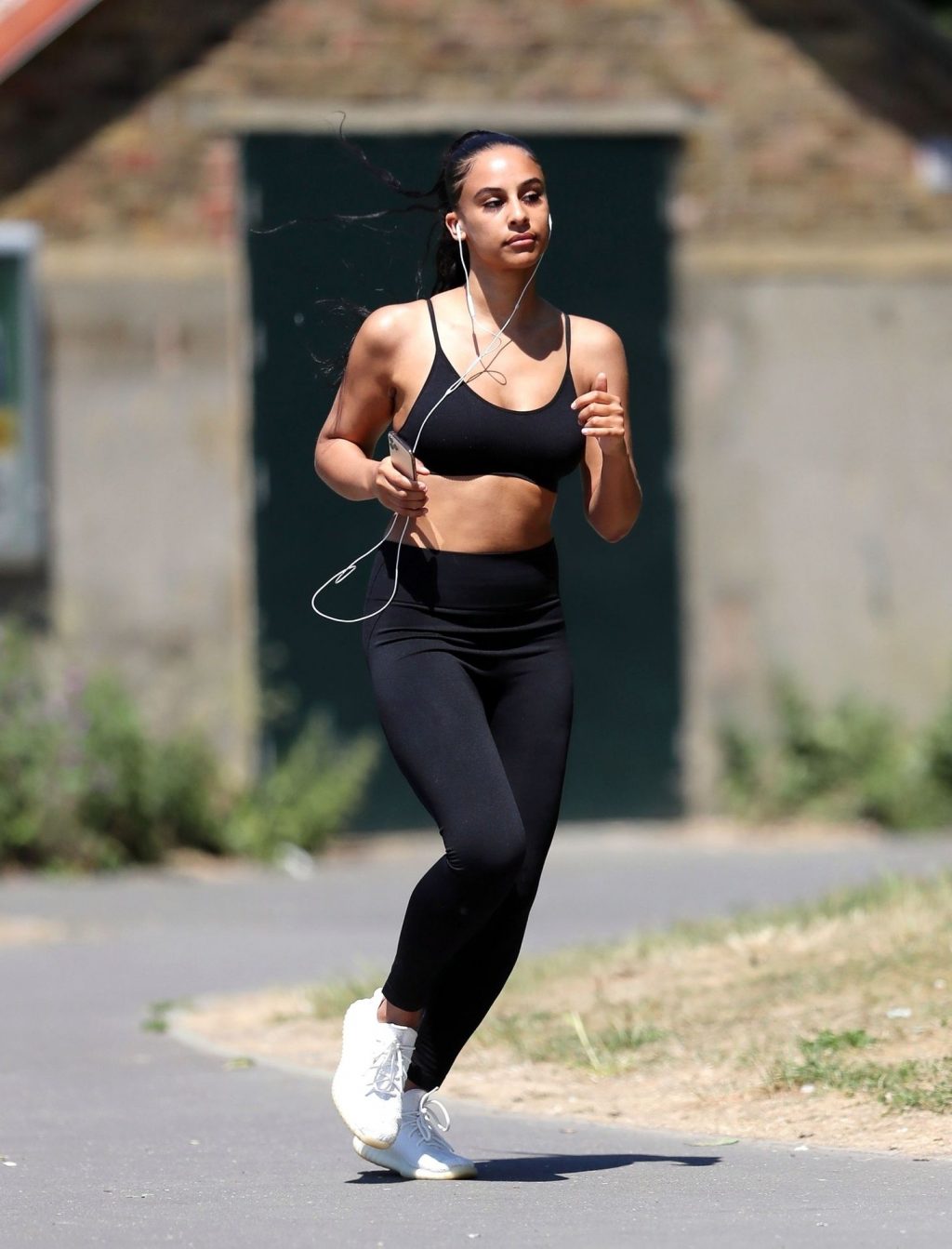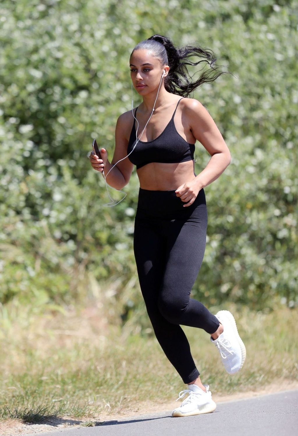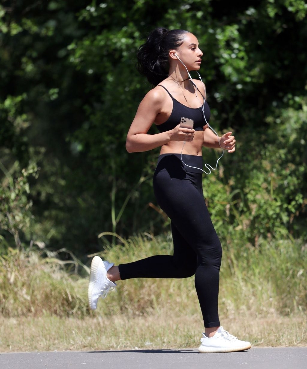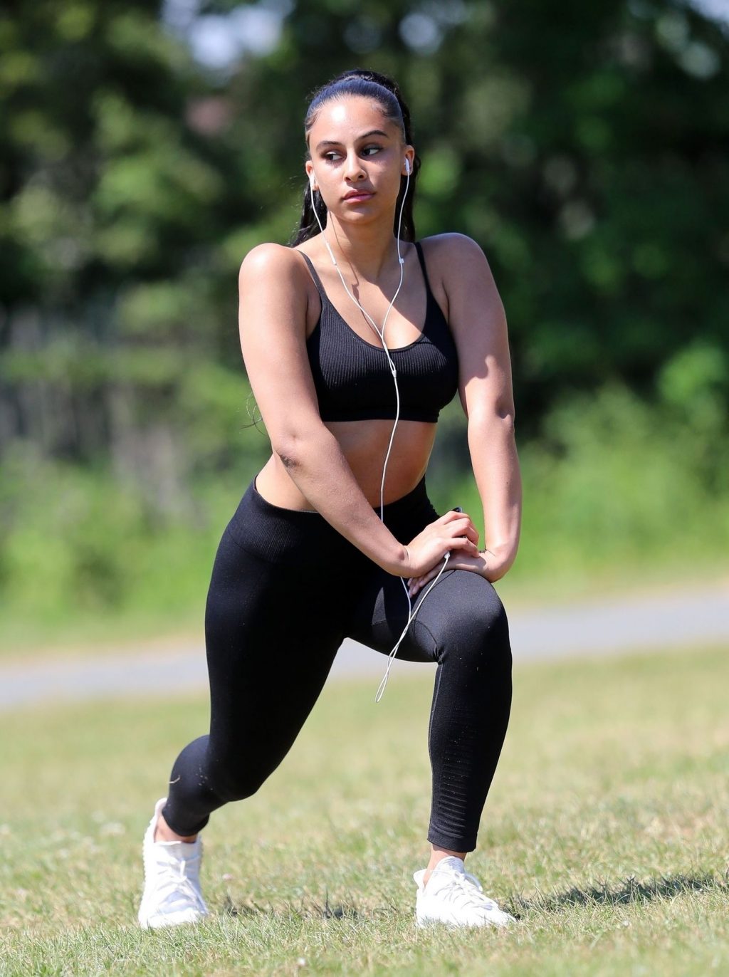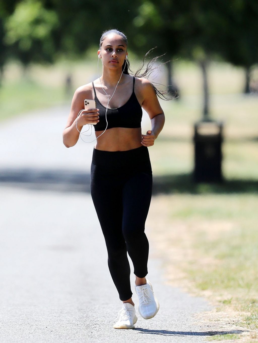 La super atletica modella Shari Halliday è stata fotografata mentre sudava sotto il caldo durante una passeggiata in un parco di Londra, 06/02/2020.
