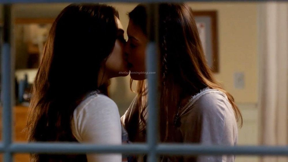 Shay Mitchell is seen through a bedroom window as Lindsey Shaw leans in and kisses her in quite a hot lesbian scene. Then pausing and then going back to making out.