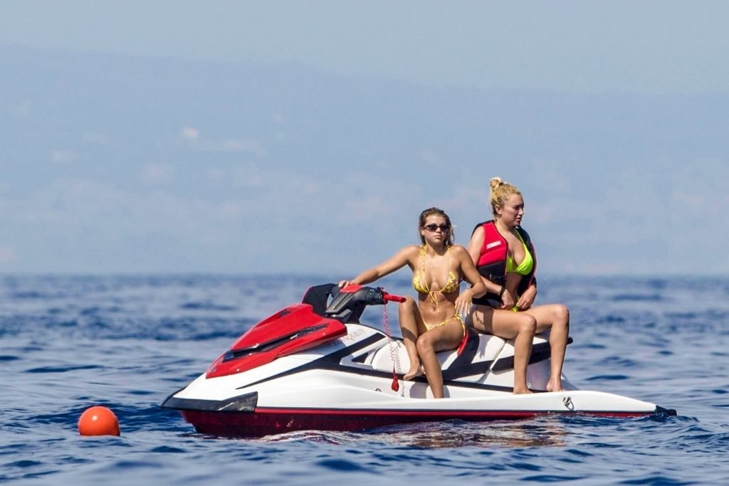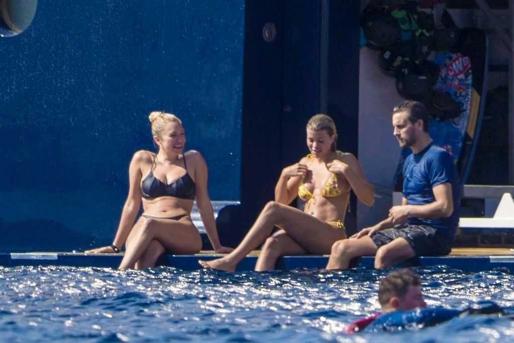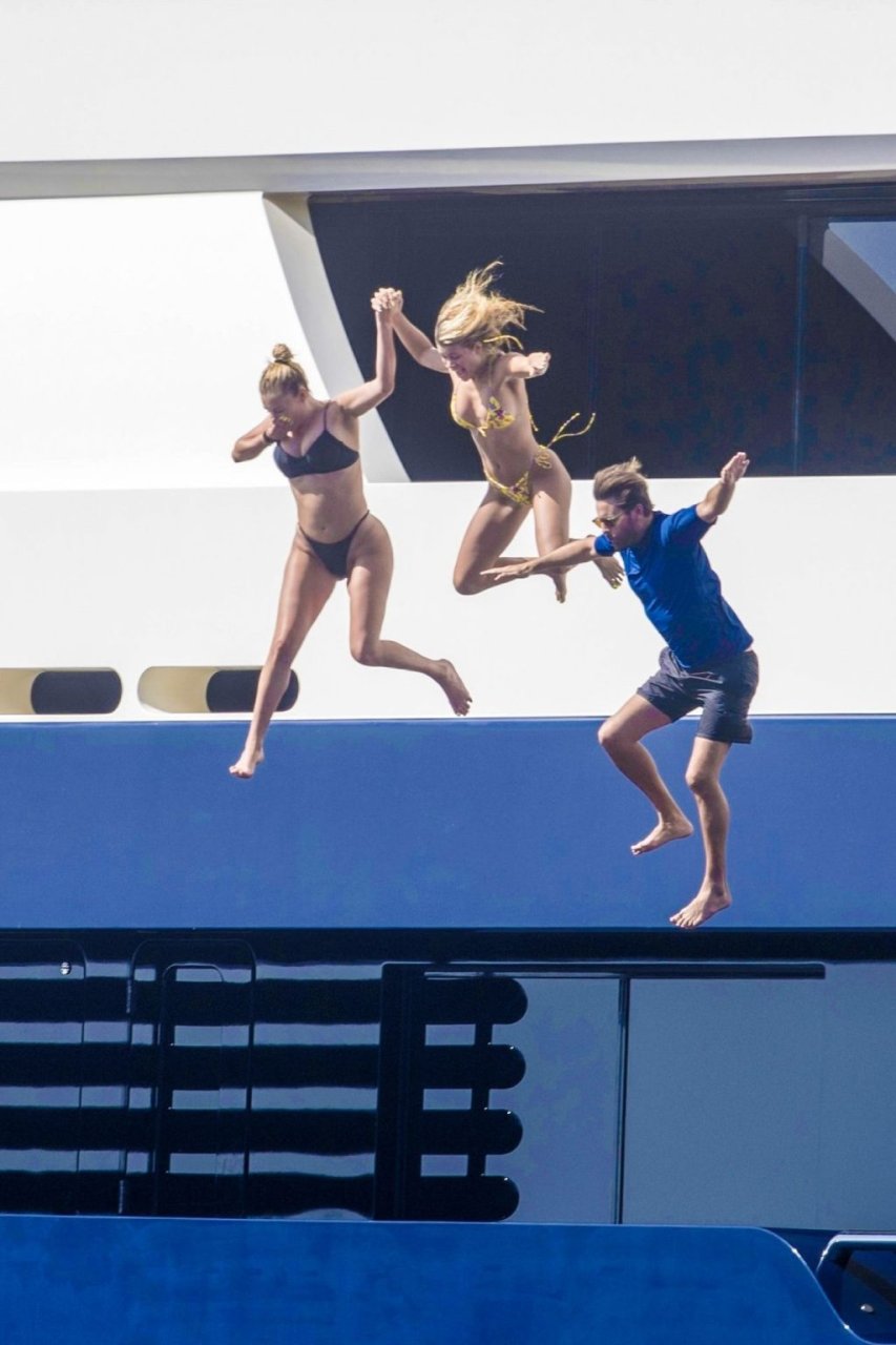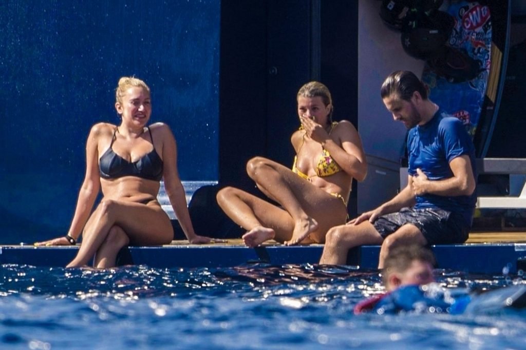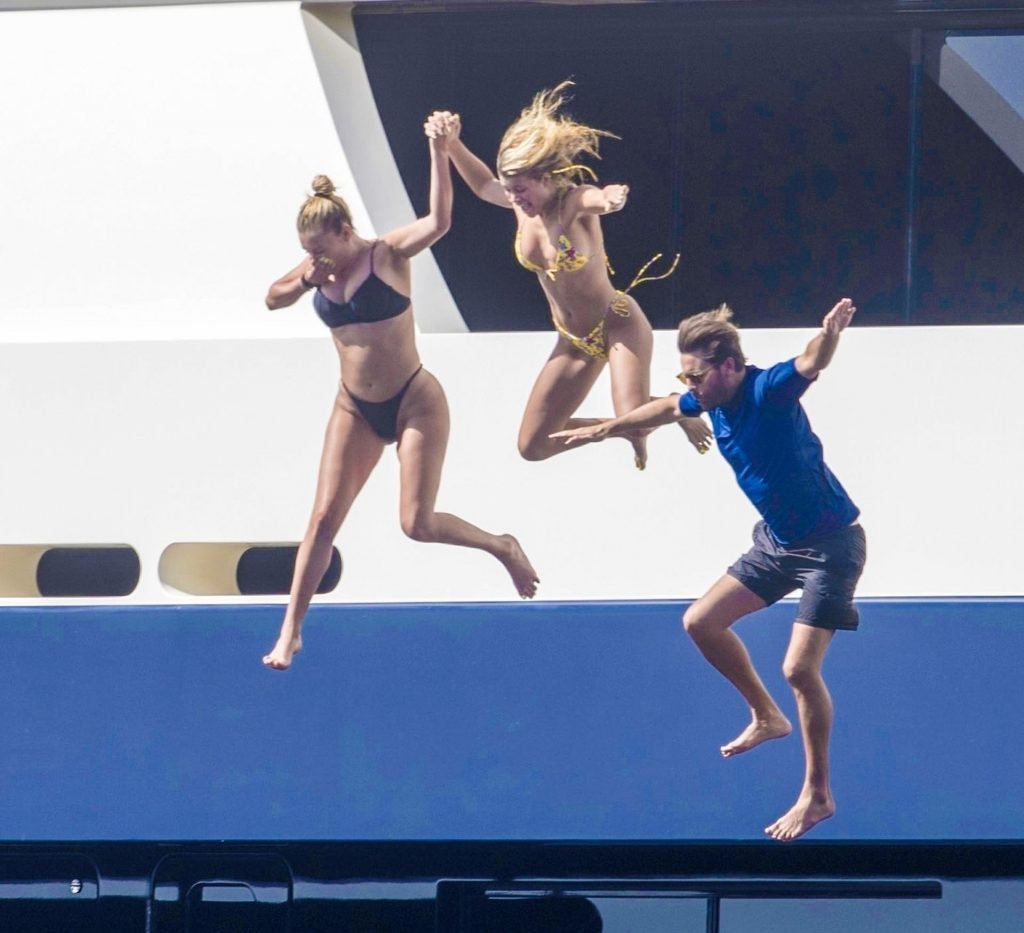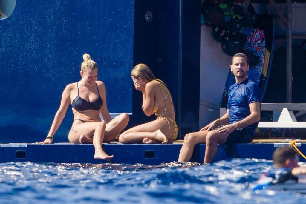 La star americana dei reality Scott Disick, Sofia Richie e la sua amica, Anastasia Karanikolaou, si divertono un po’ tuffandosi in mare dal loro lussuoso yacht in vacanza in Italia, 08/07/2019.